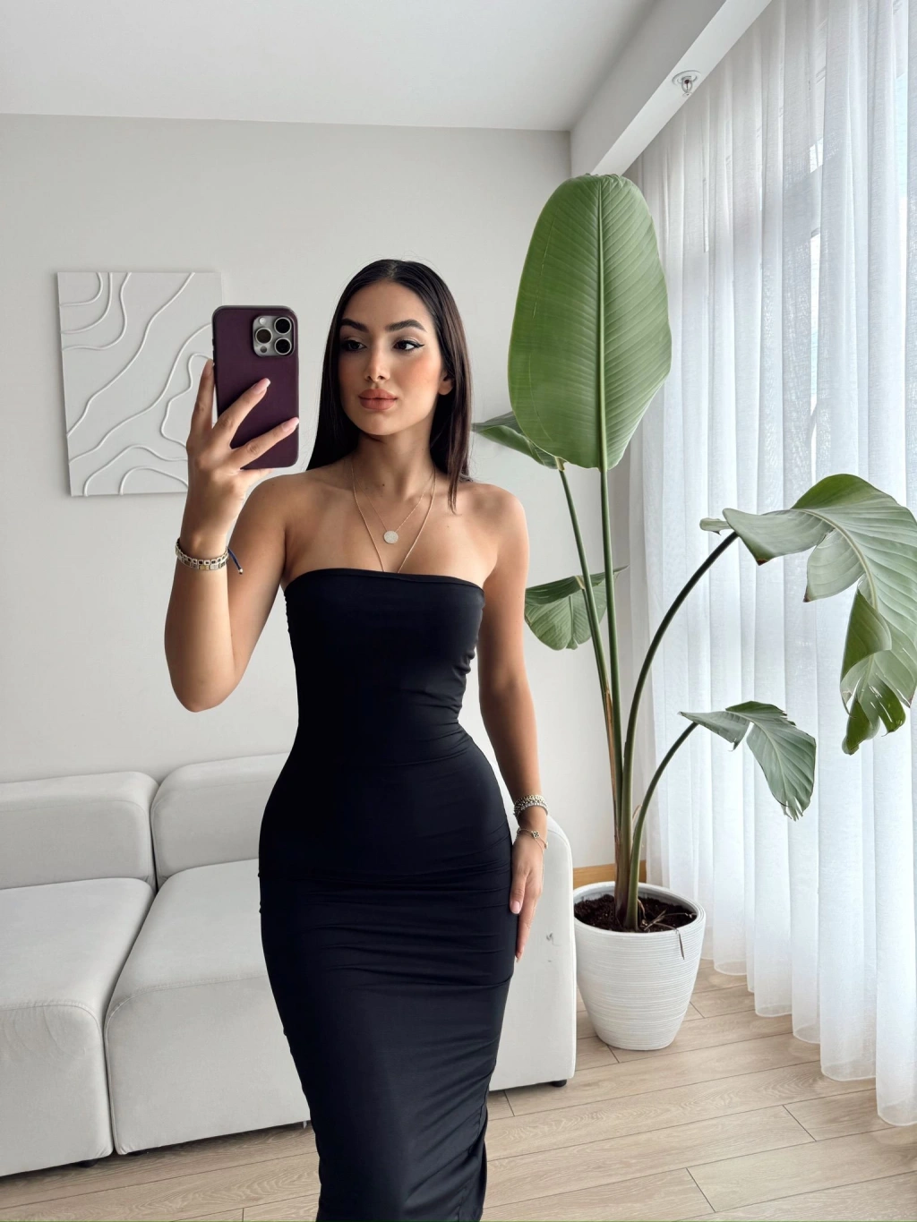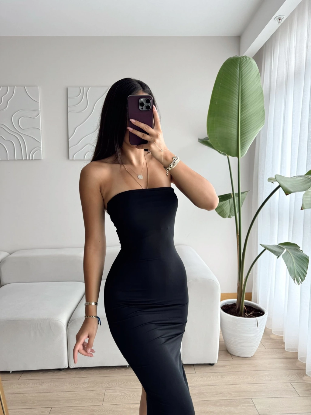 Arkası Yırtmaçlı Straplez Uzun Elbise-SİYAH