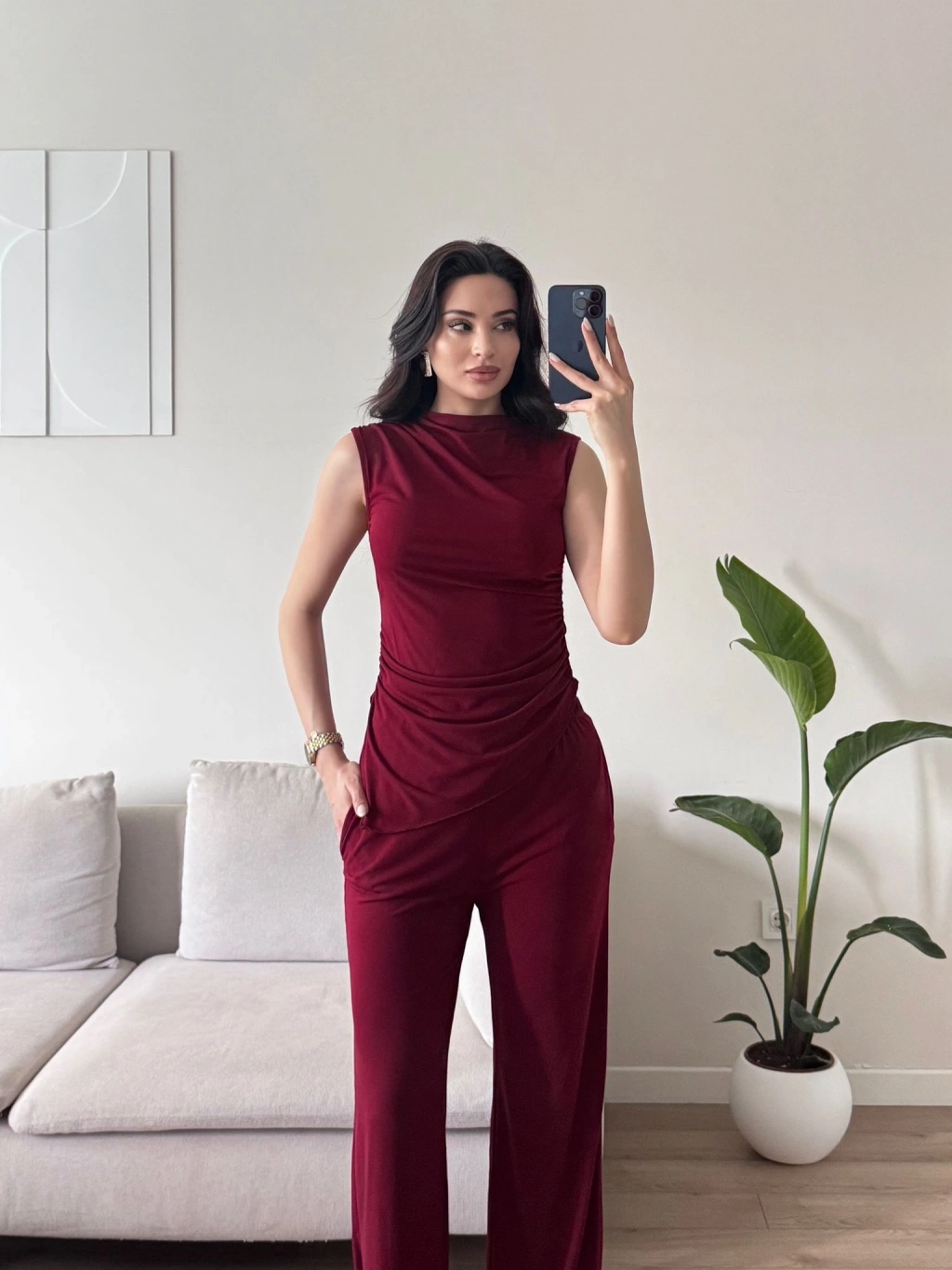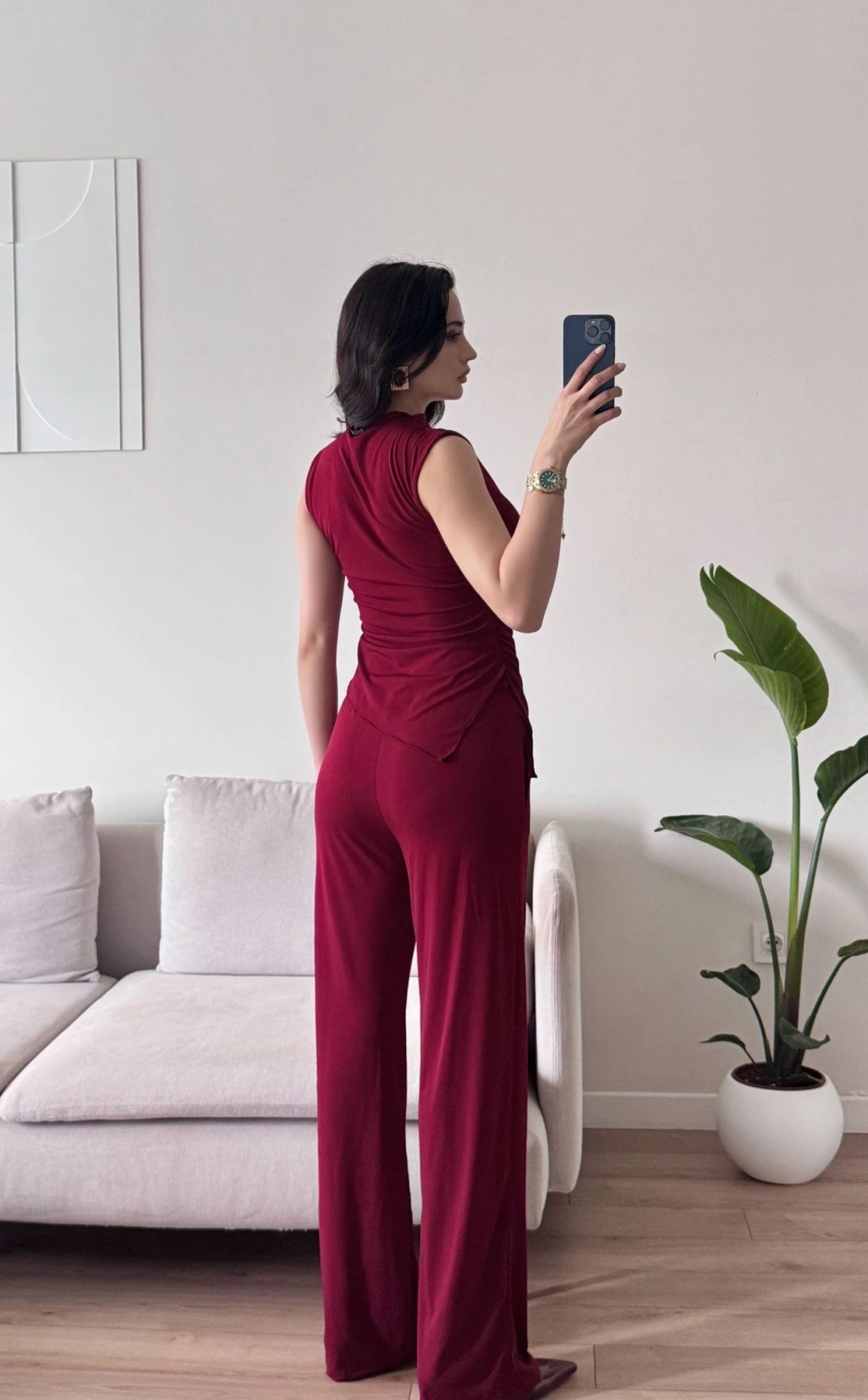 Asimetrik Bluz & Pantolon Takım - BORDO