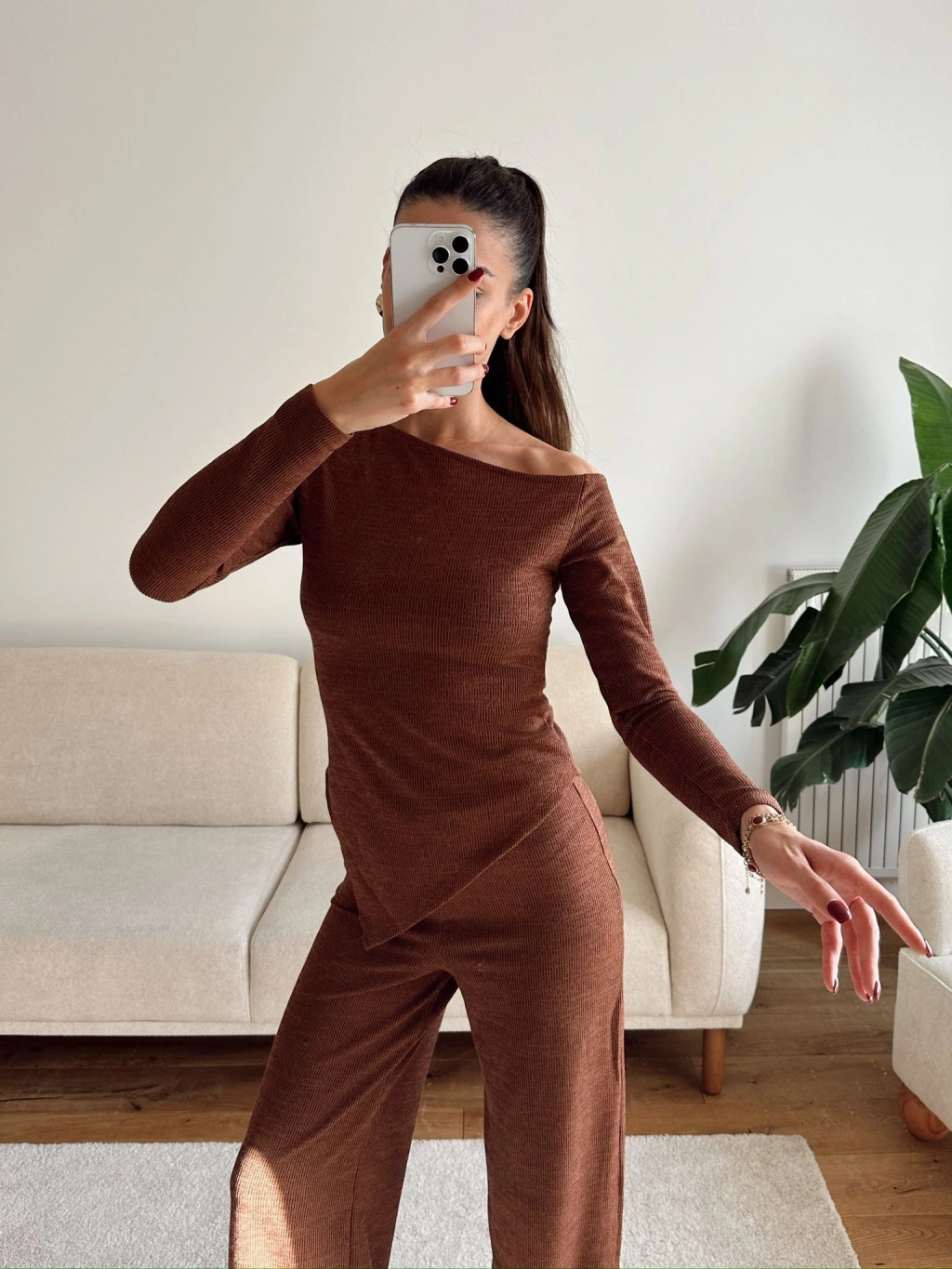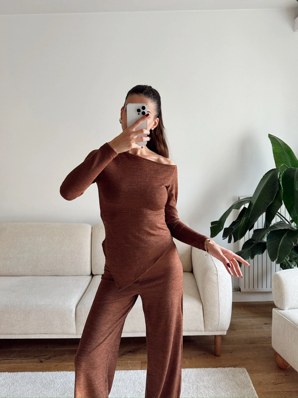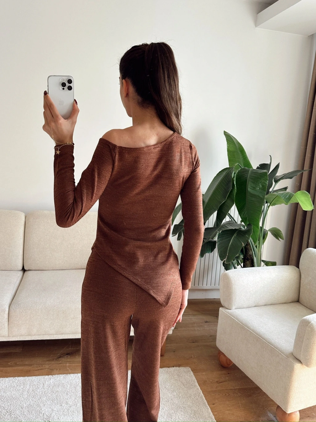 Asimetrik Bluz & Pantolon Takım - KAHVE