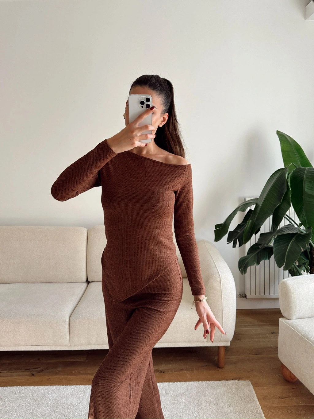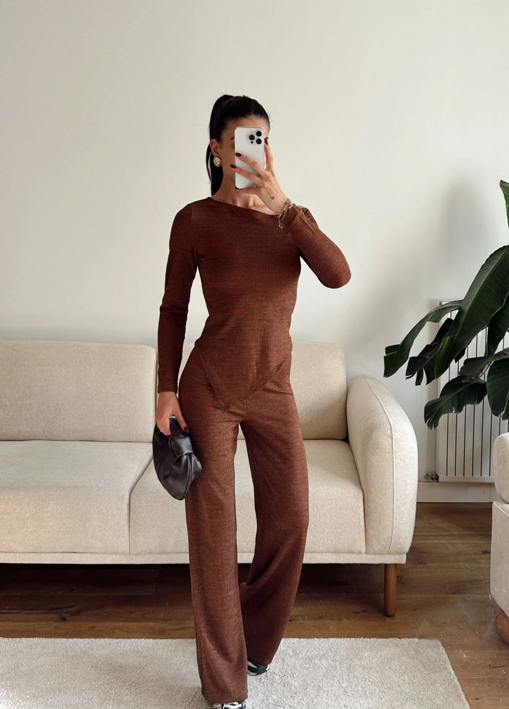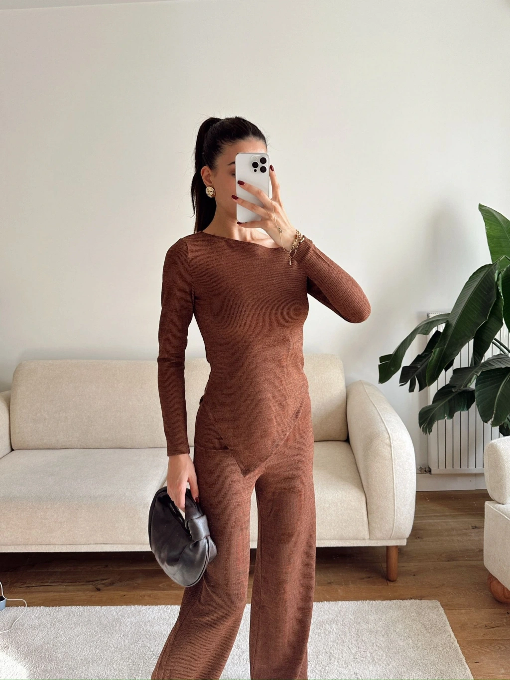 Asimetrik Bluz & Pantolon Takım - KAHVE