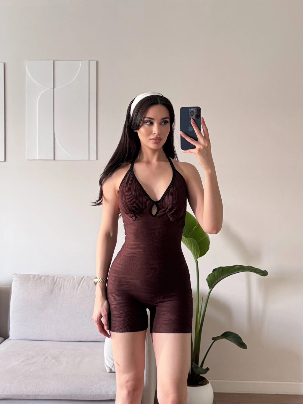 Askılı Damla Detay Şortlu Tulum - KAHVE