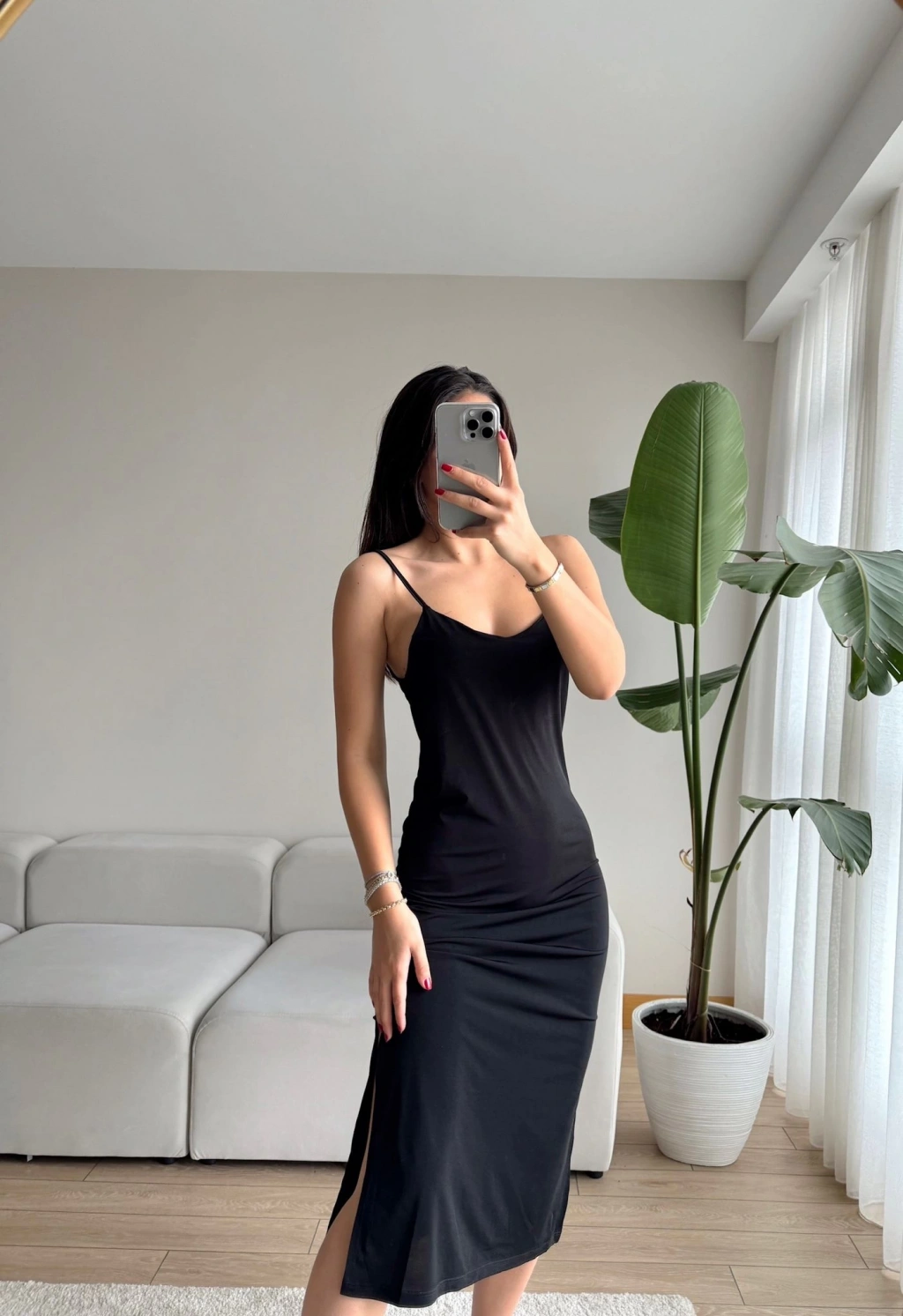 Ayarlanabilir Askı Çift Yırtmaç Elbise - SİYAH