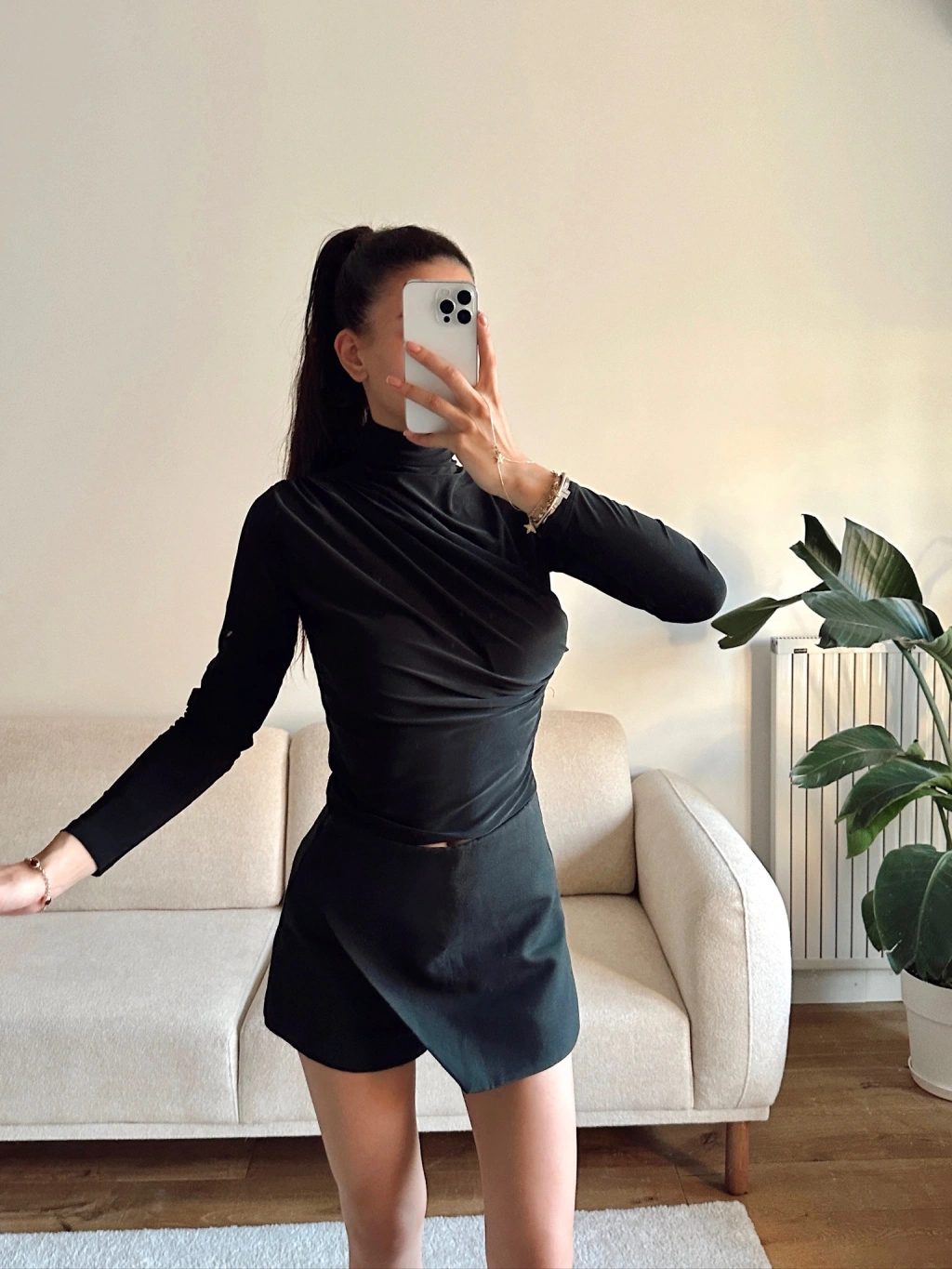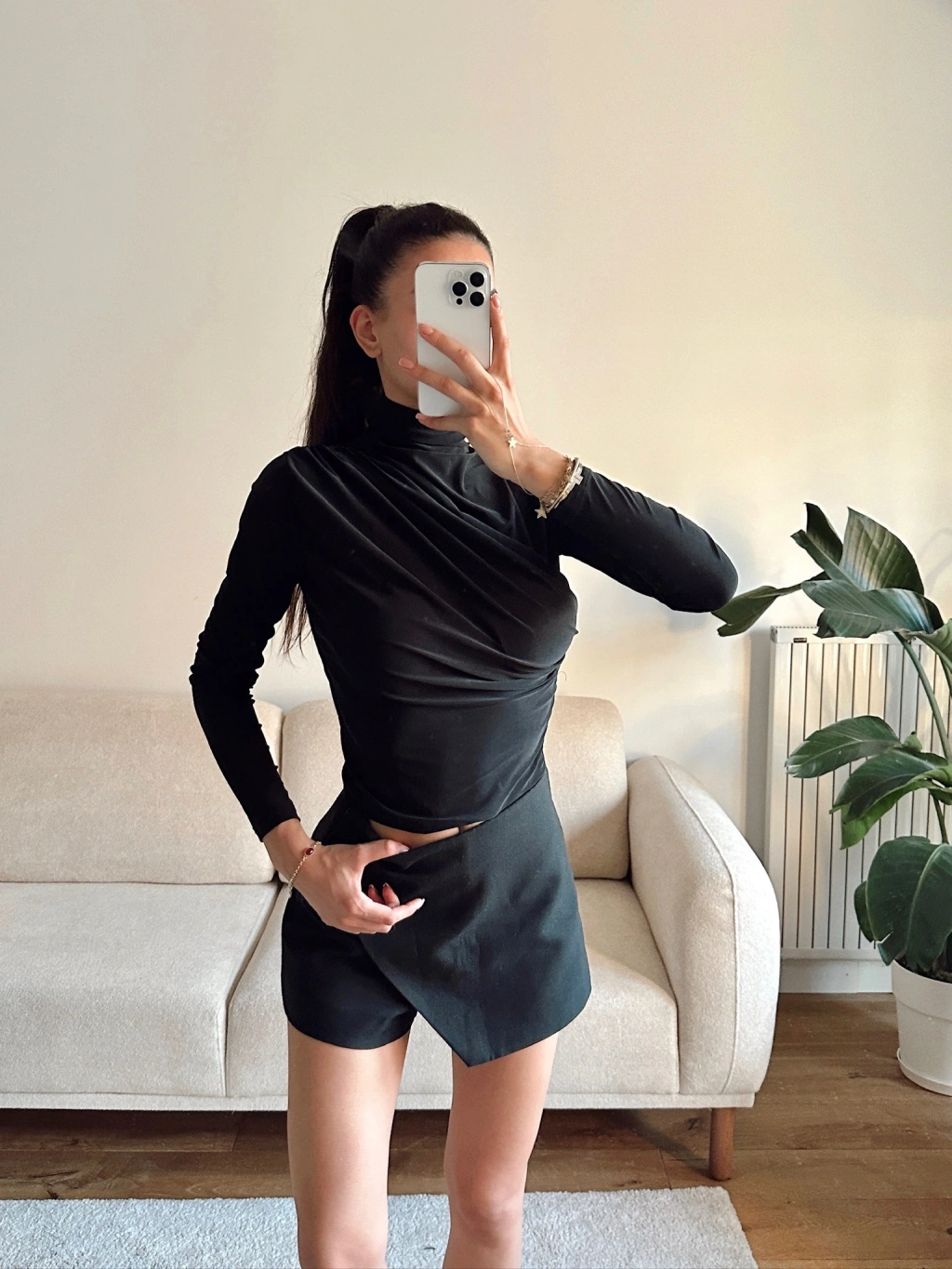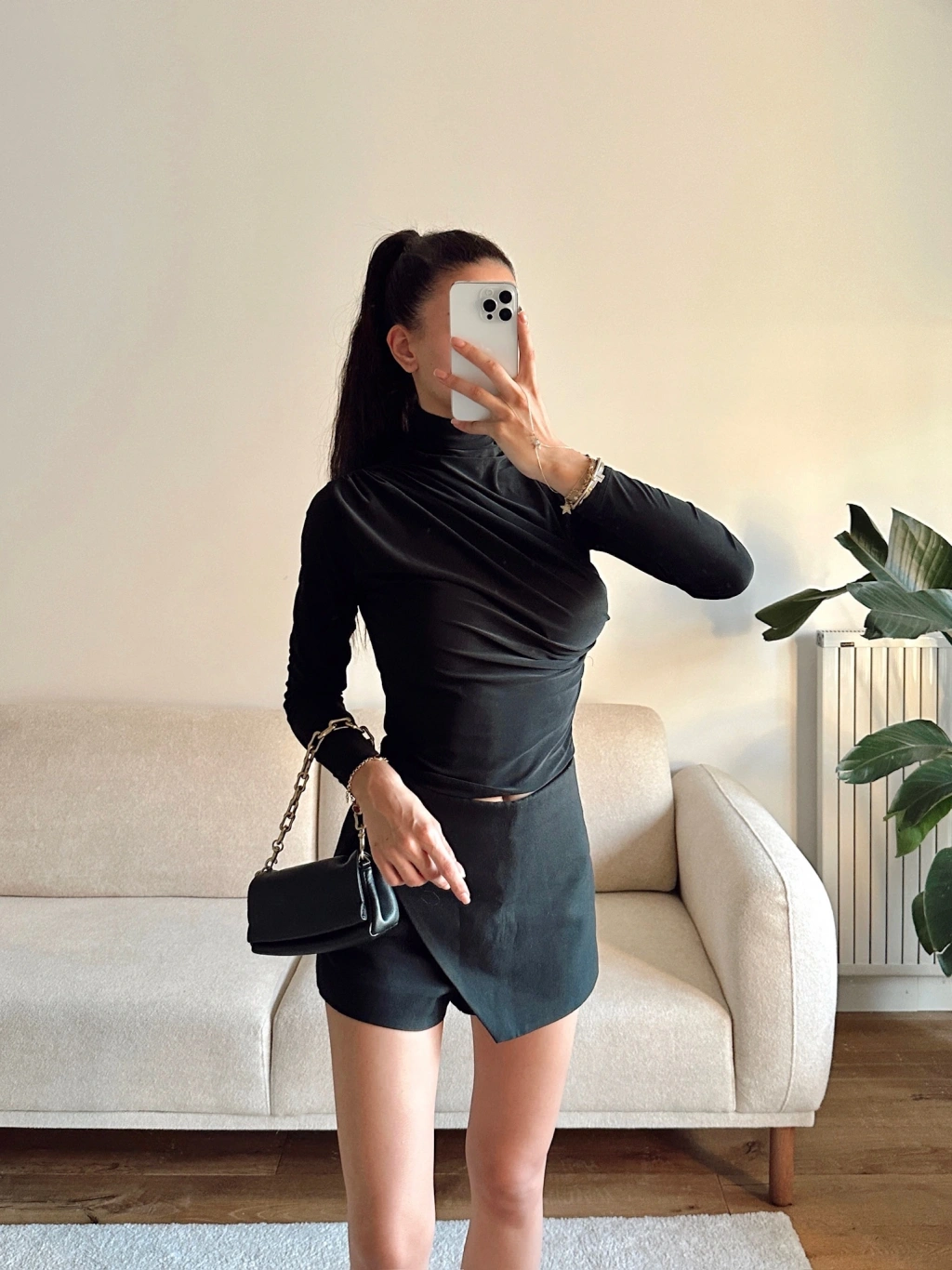 Balıkçı Yaka Drapeli Bluz - SİYAH