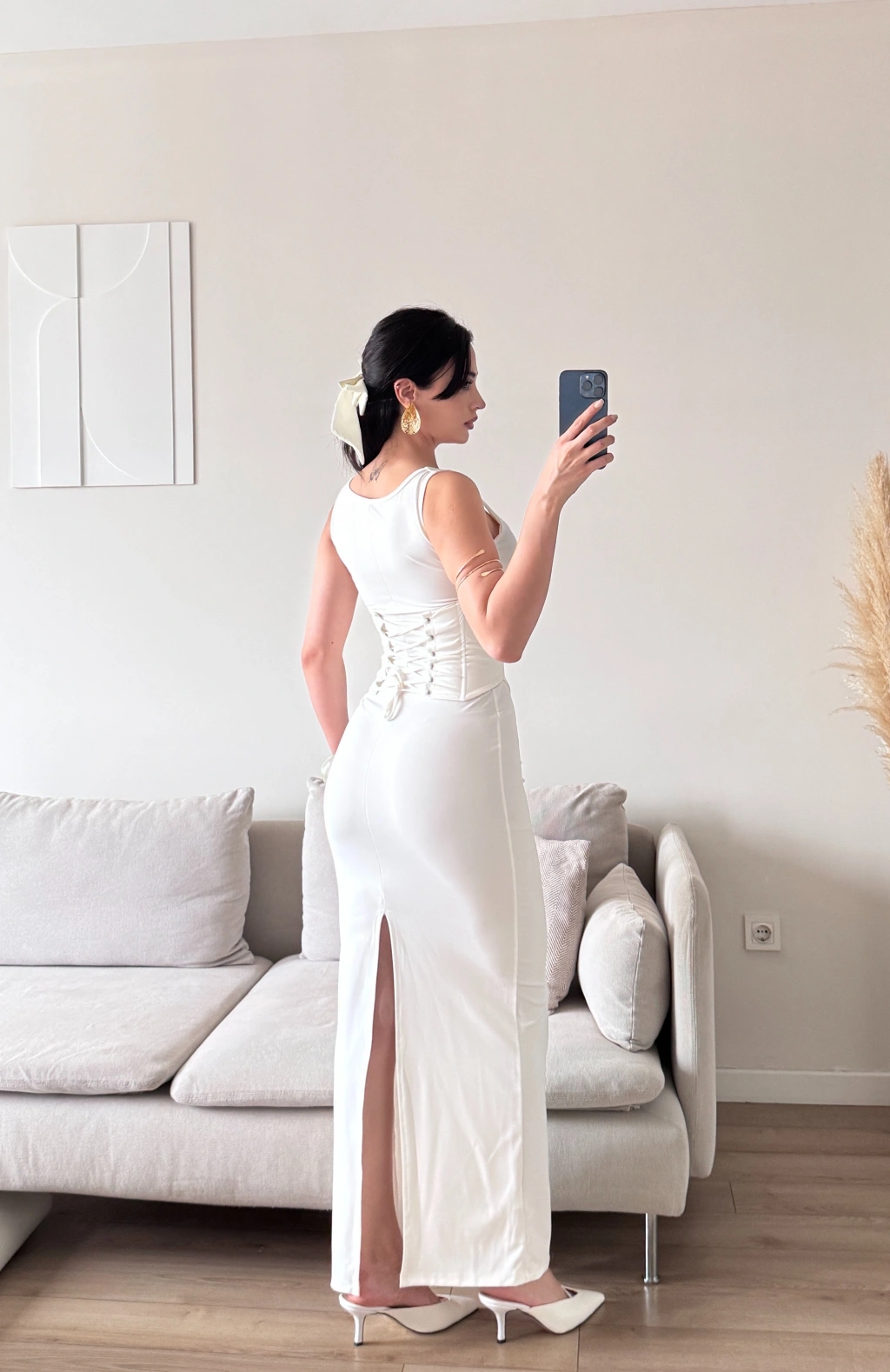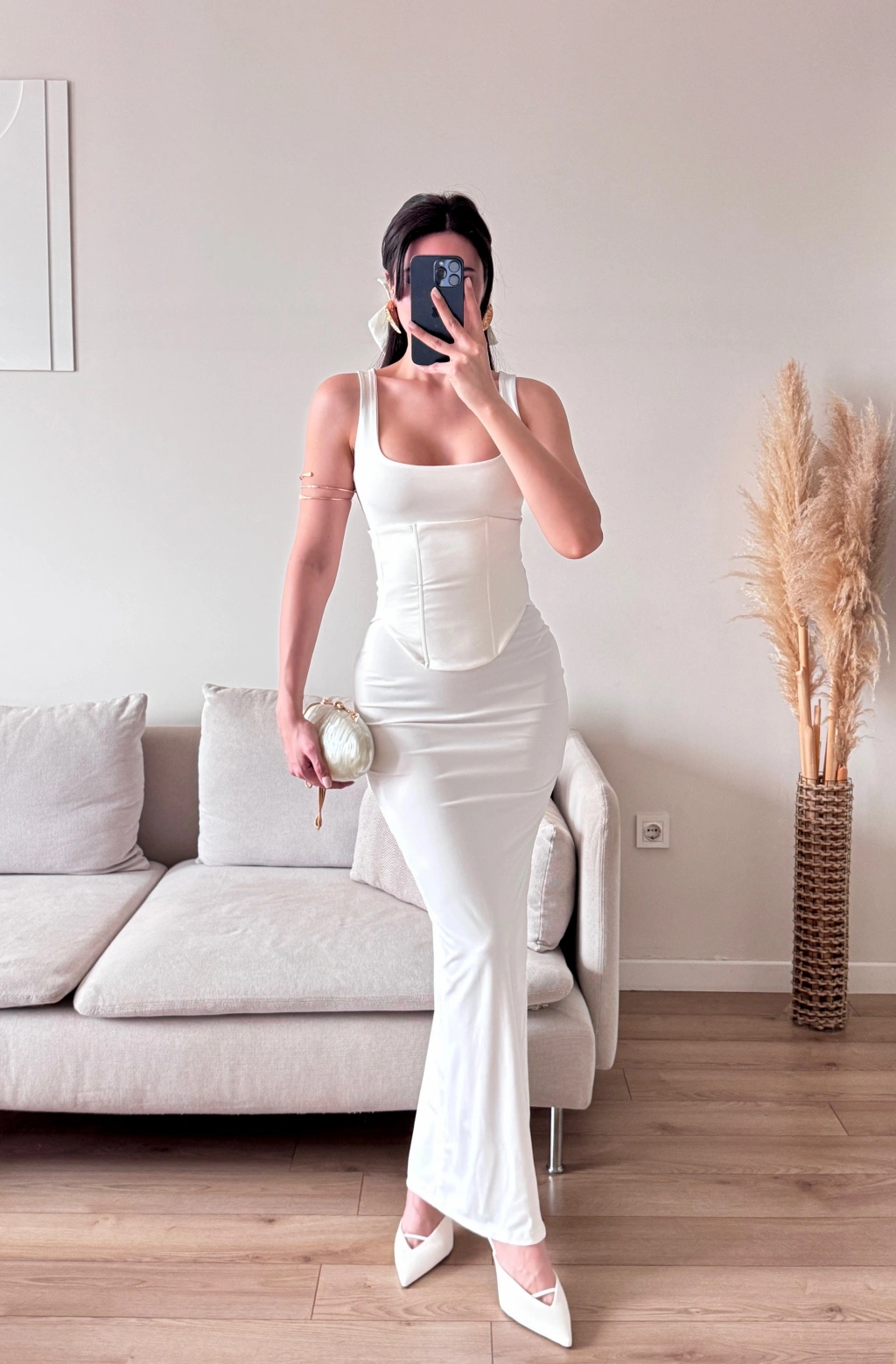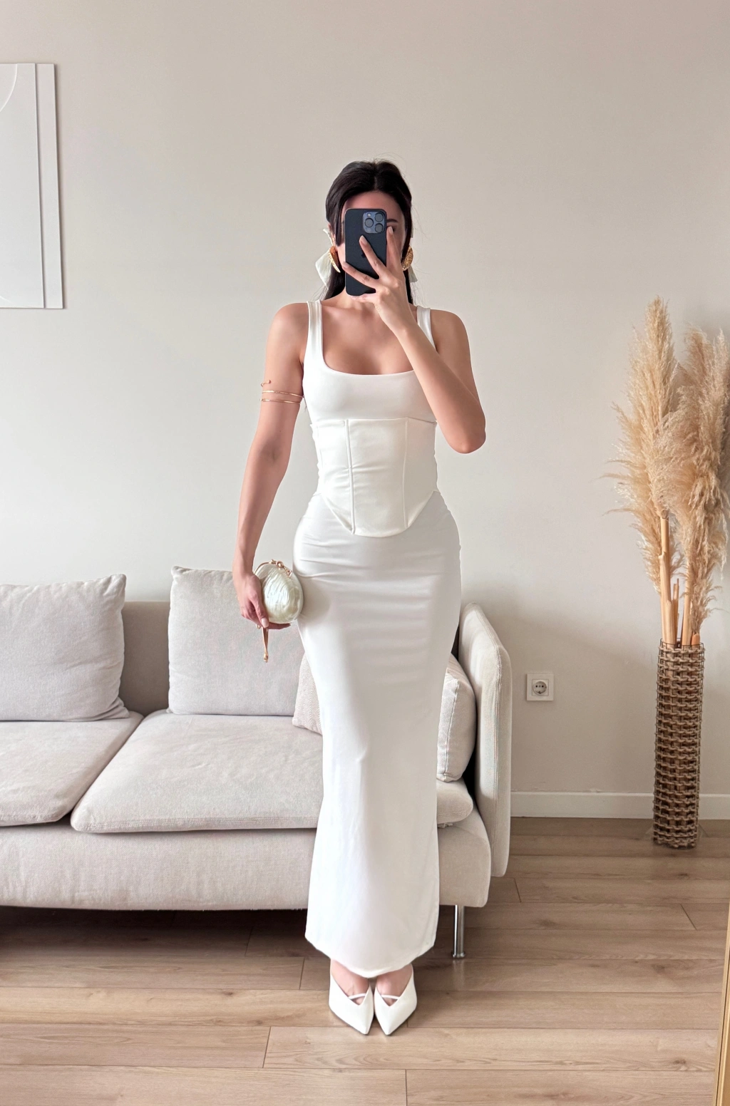 Bel Korse Kare Yaka Elbise - BEYAZ