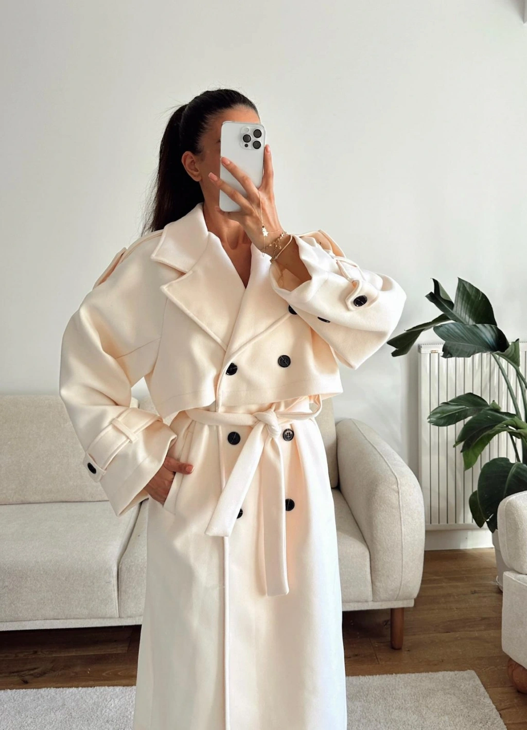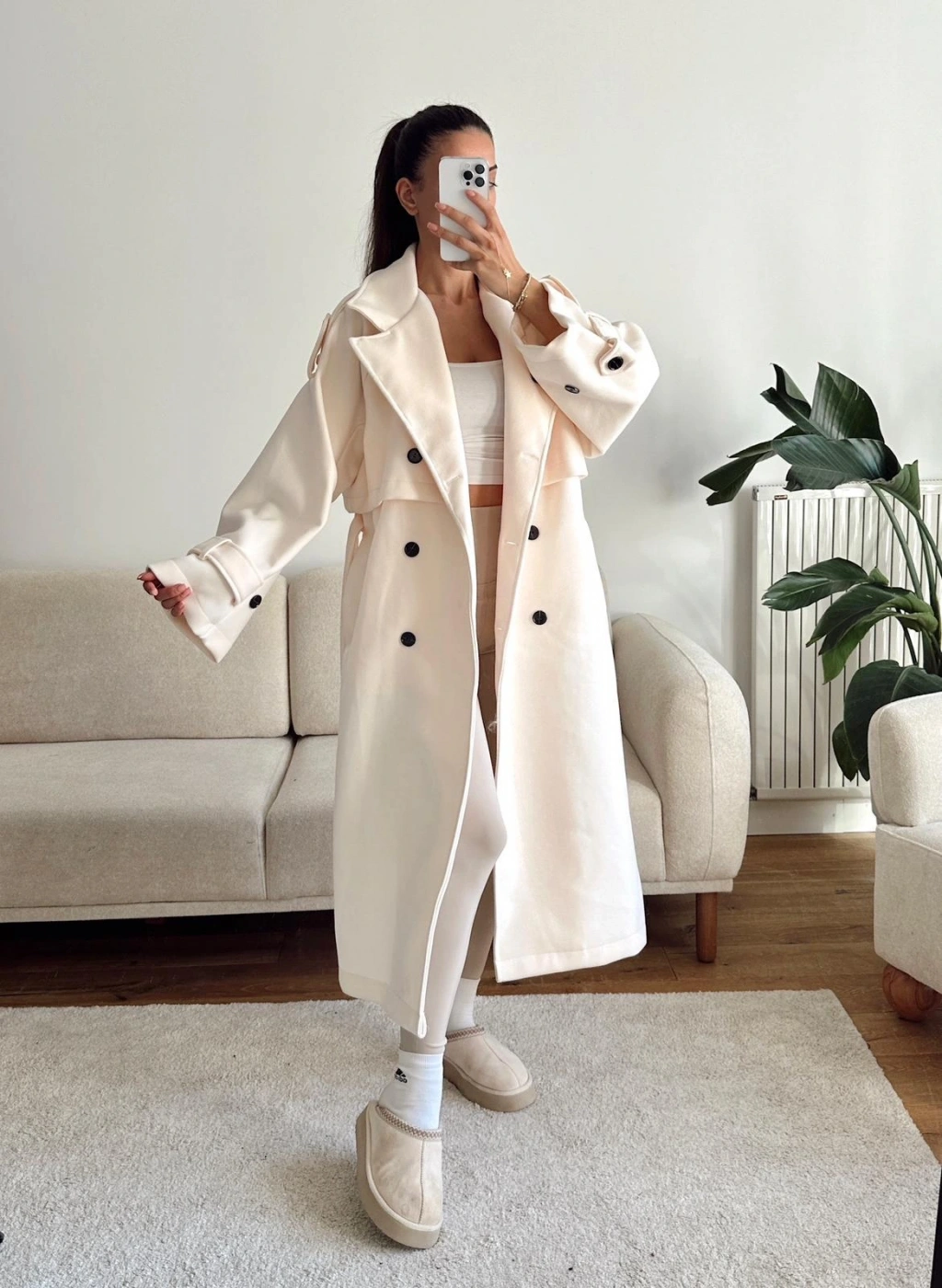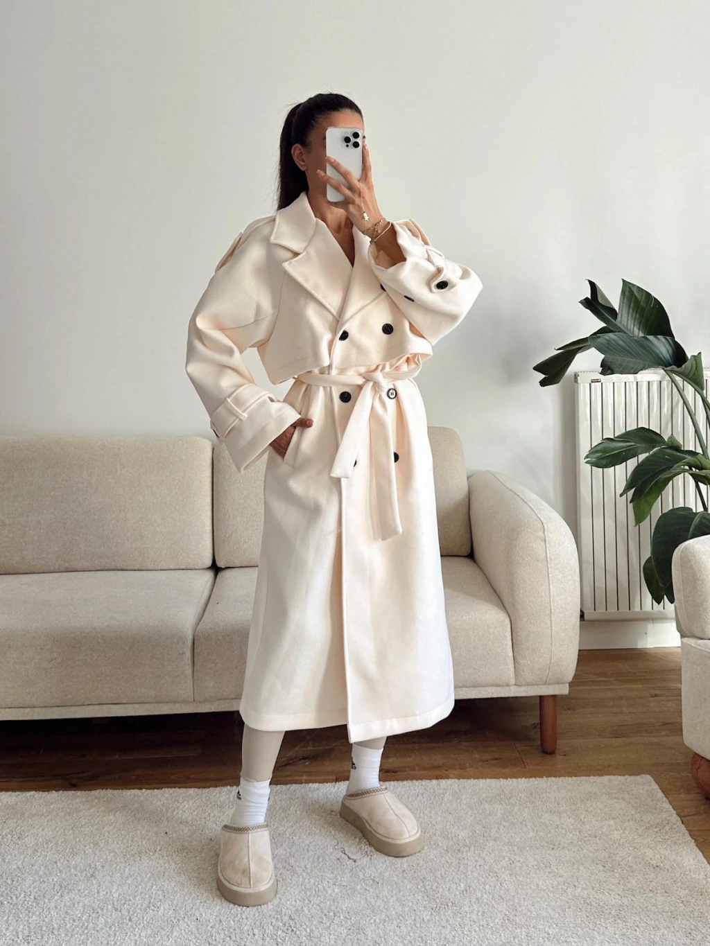 Beli Kuşaklı Kaşe Kaban - EKRU