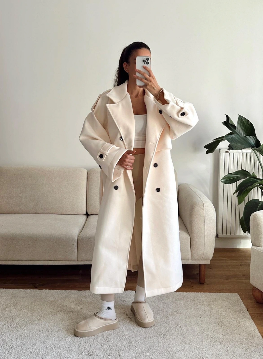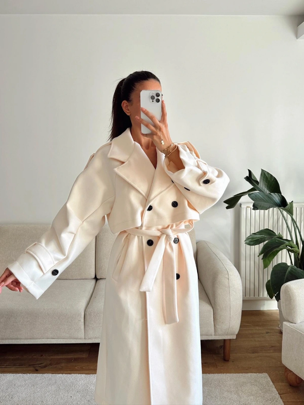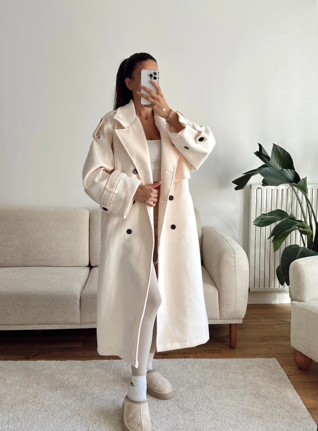 Beli Kuşaklı Kaşe Kaban - EKRU