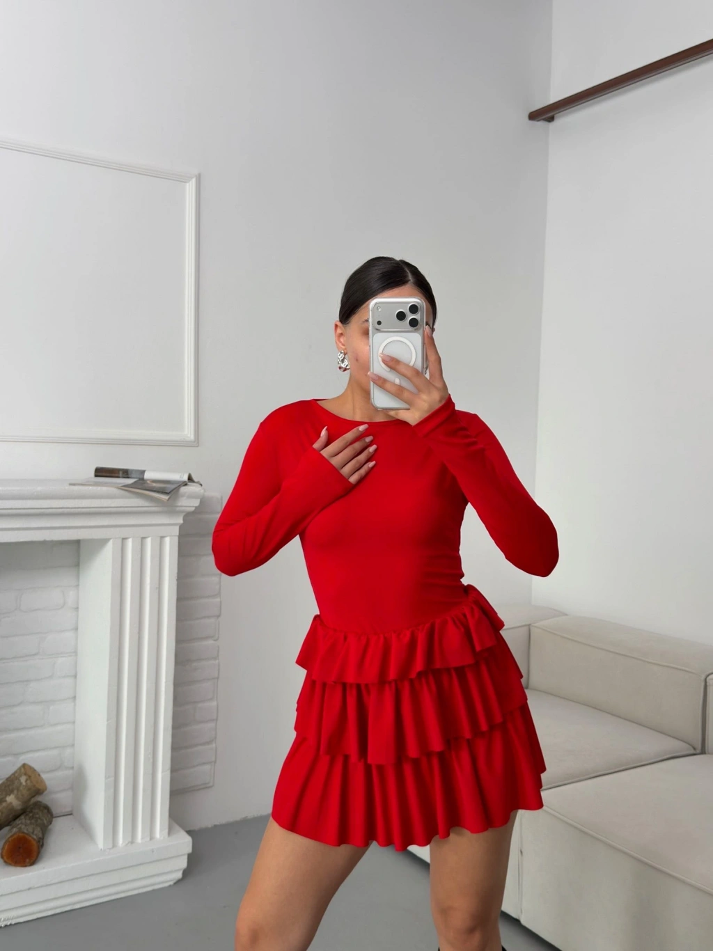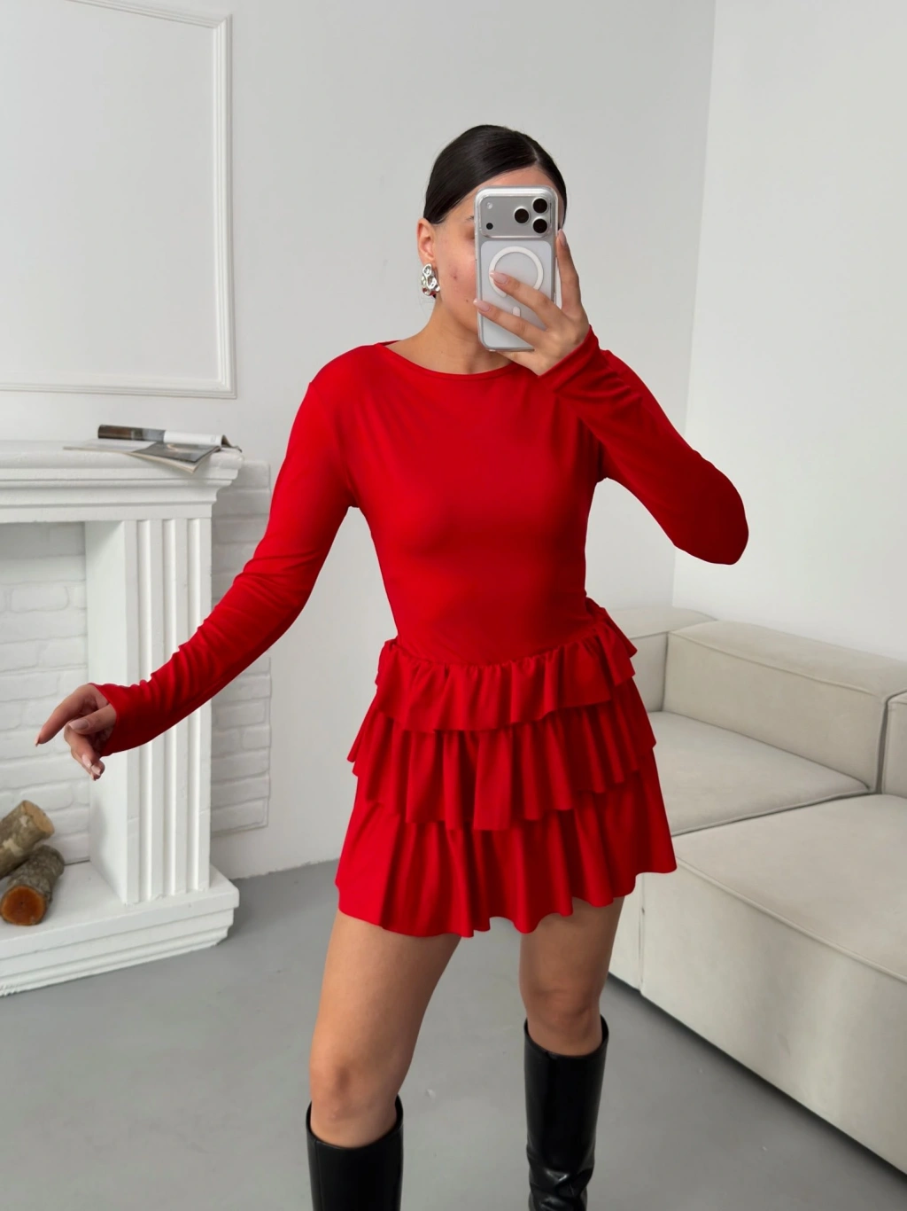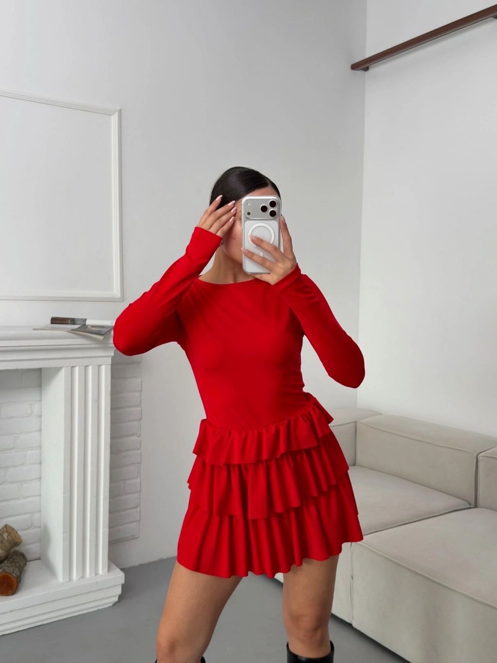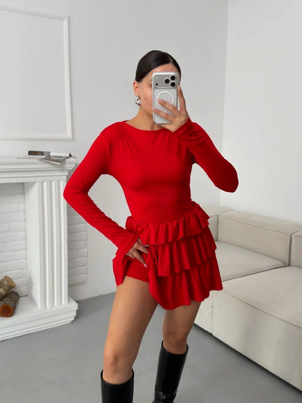 Bisiklet Yaka Fırfırlı Elbise - KIRMIZI