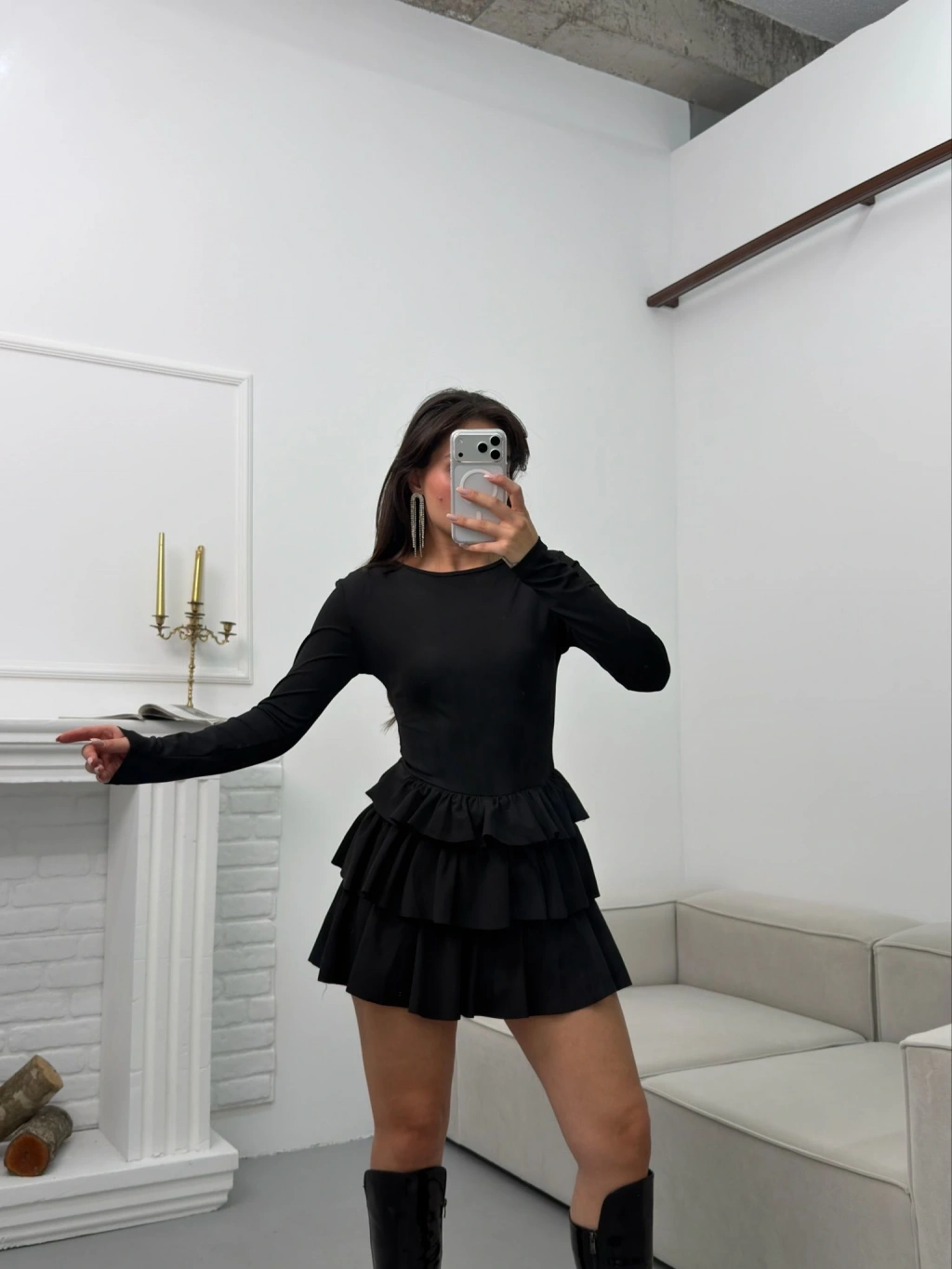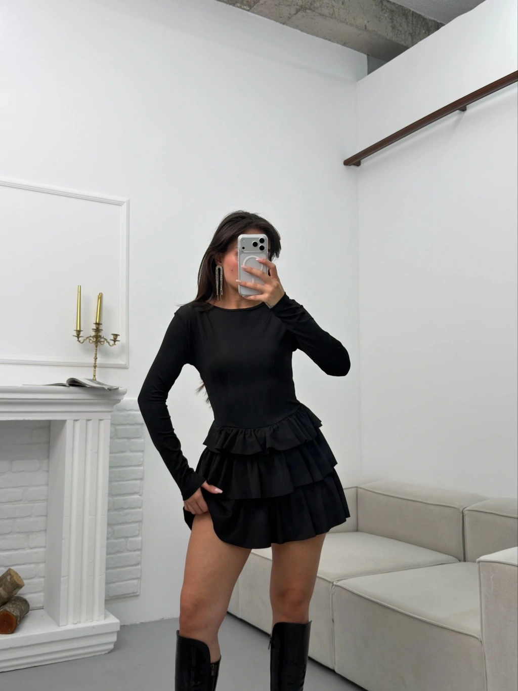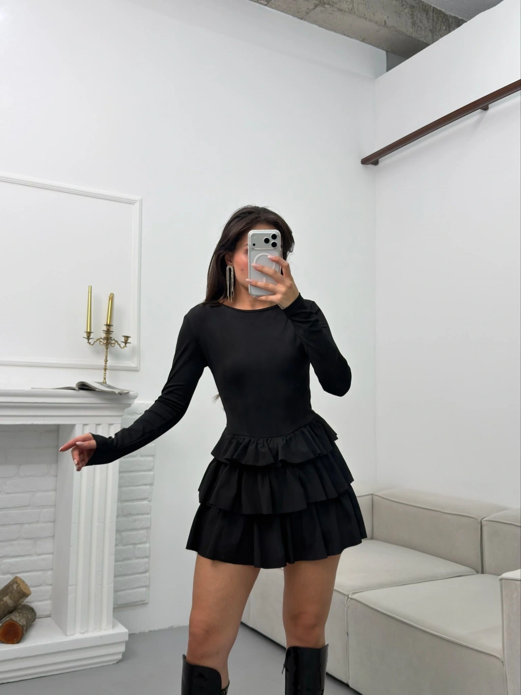 Bisiklet Yaka Fırfırlı Elbise - SİYAH