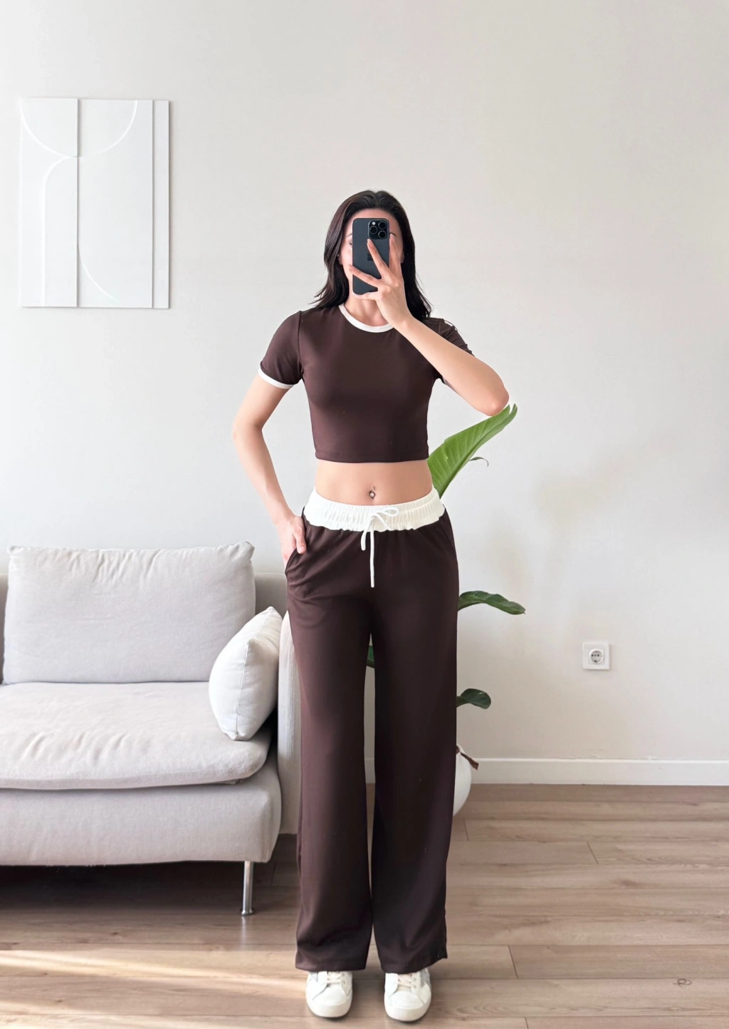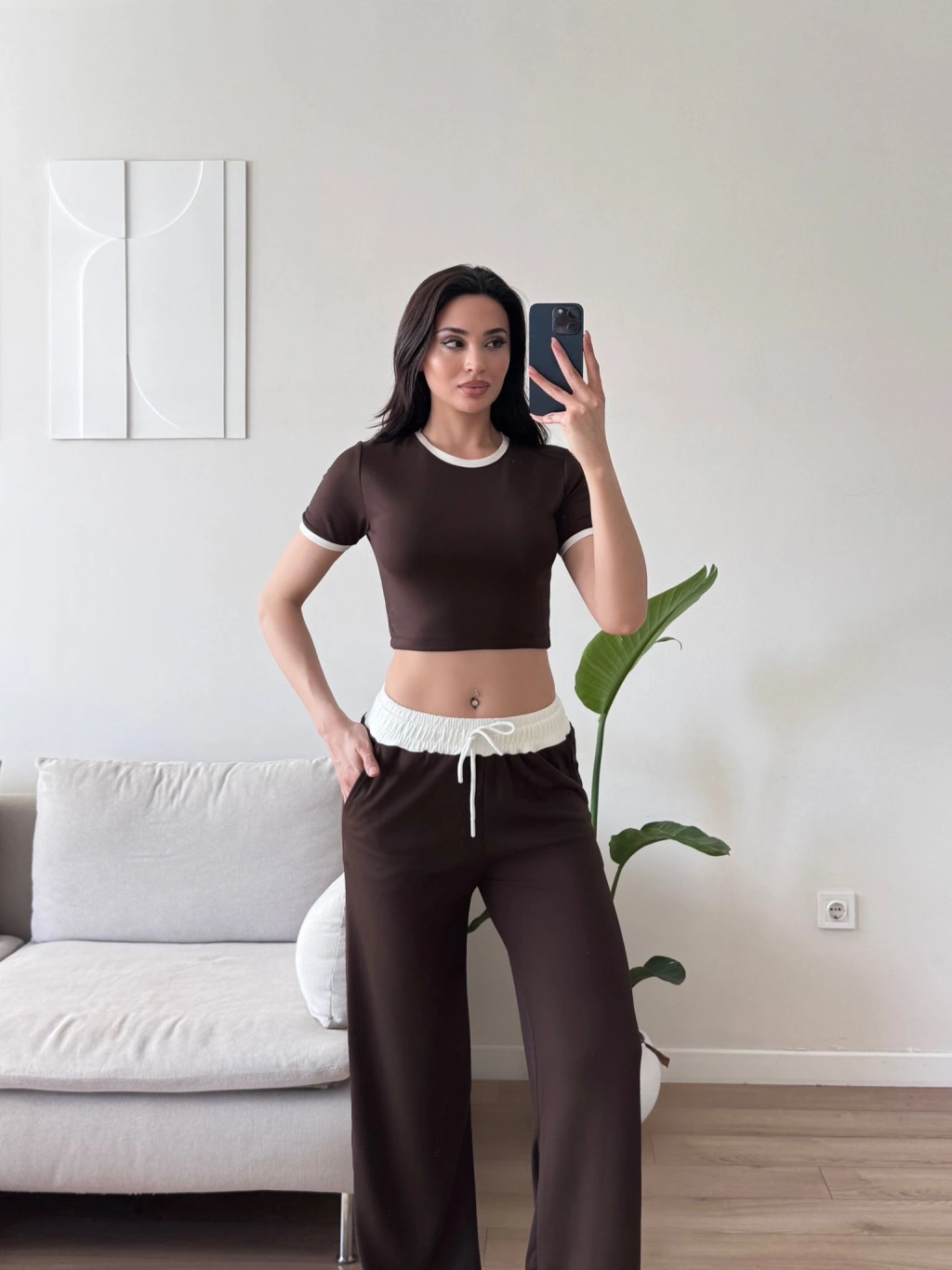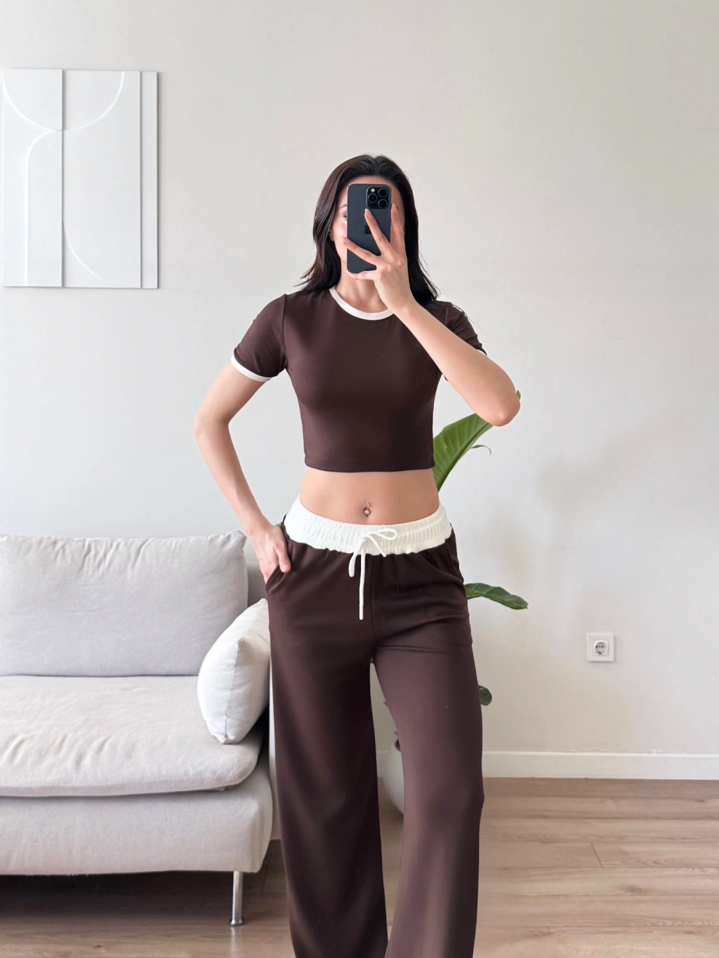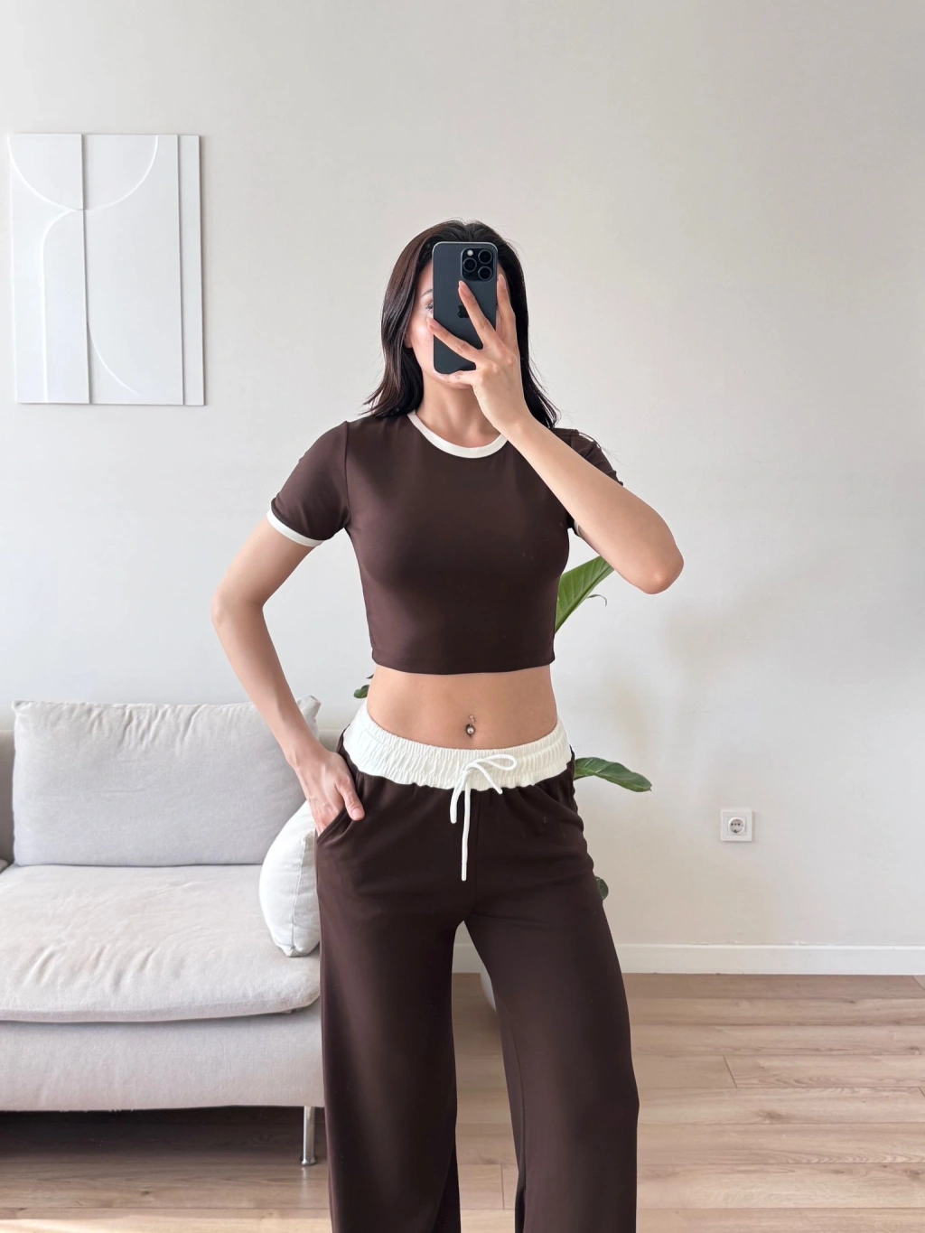 Biyeli Crop & Pantolon Takım - KAHVE
