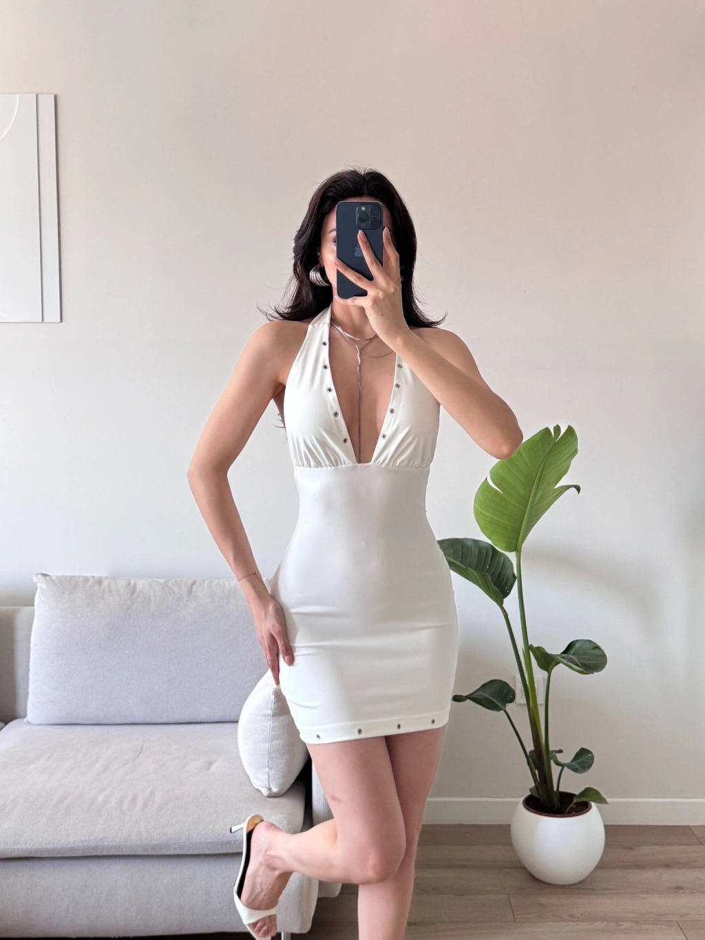 Boyun Bağlamalı Kuşgözü Elbise - BEYAZ