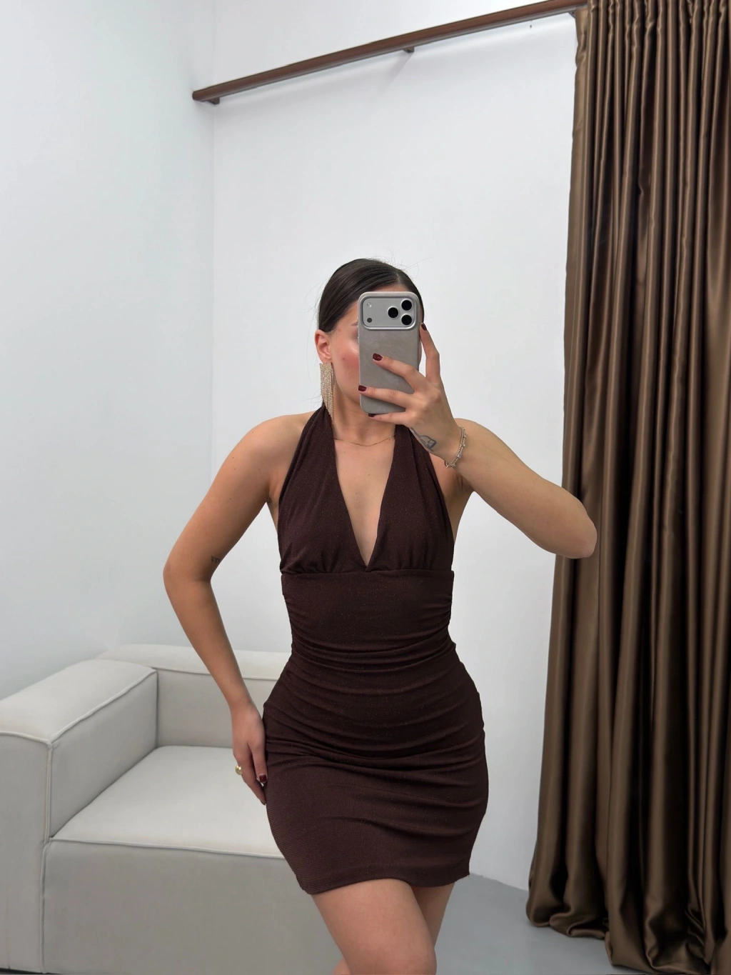 Boyun Bağlamalı Simli Elbise - KAHVE