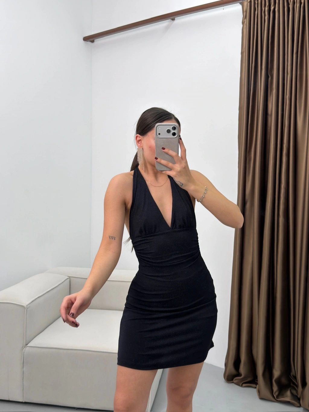 Boyun Bağlamalı Simli Elbise - SİYAH