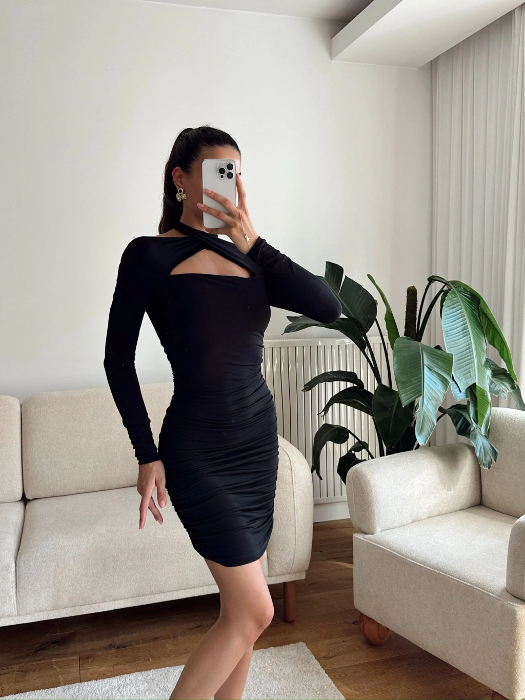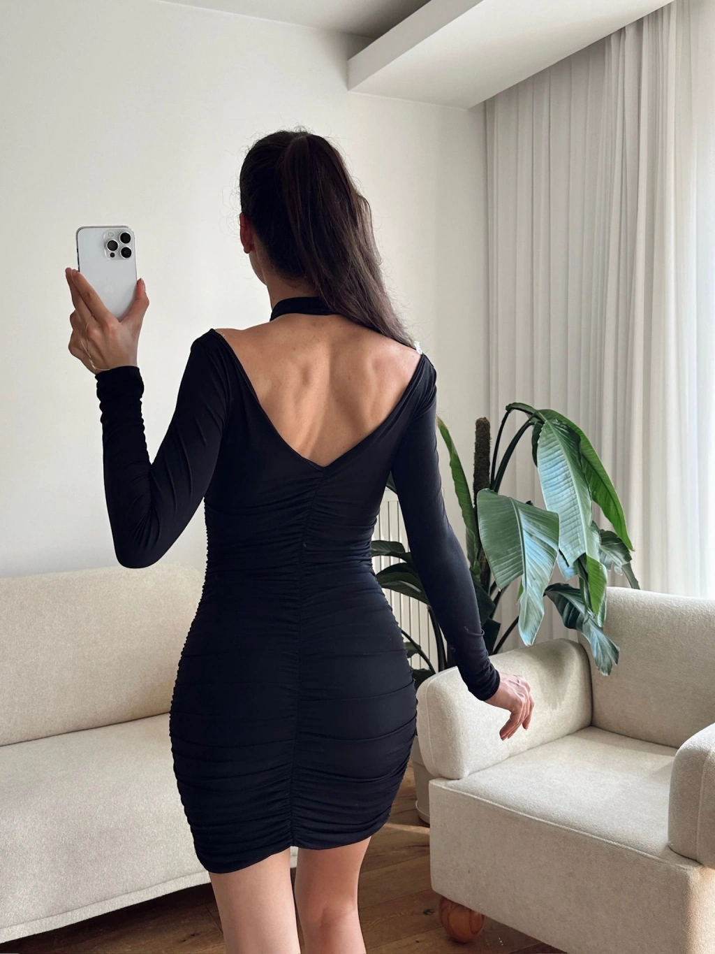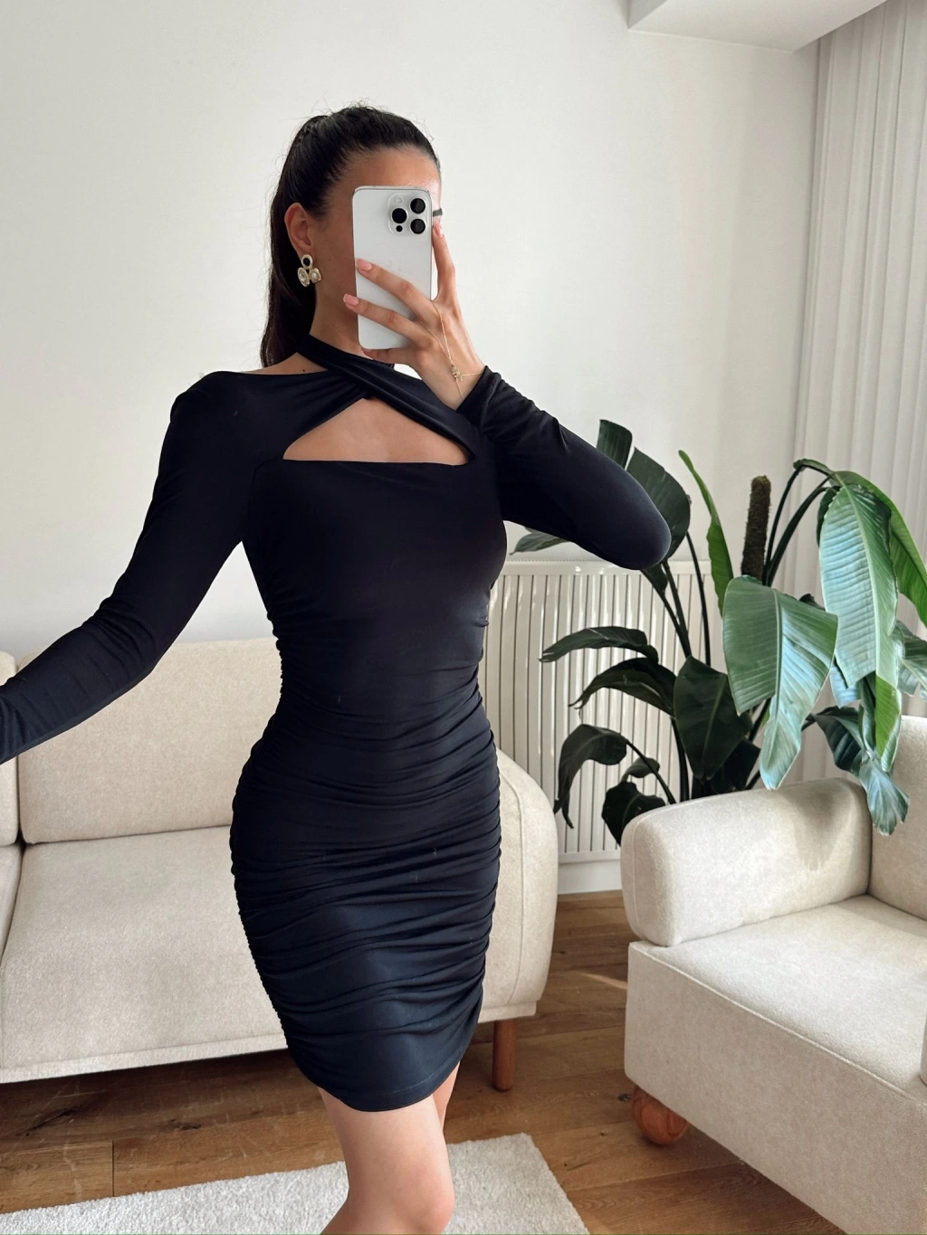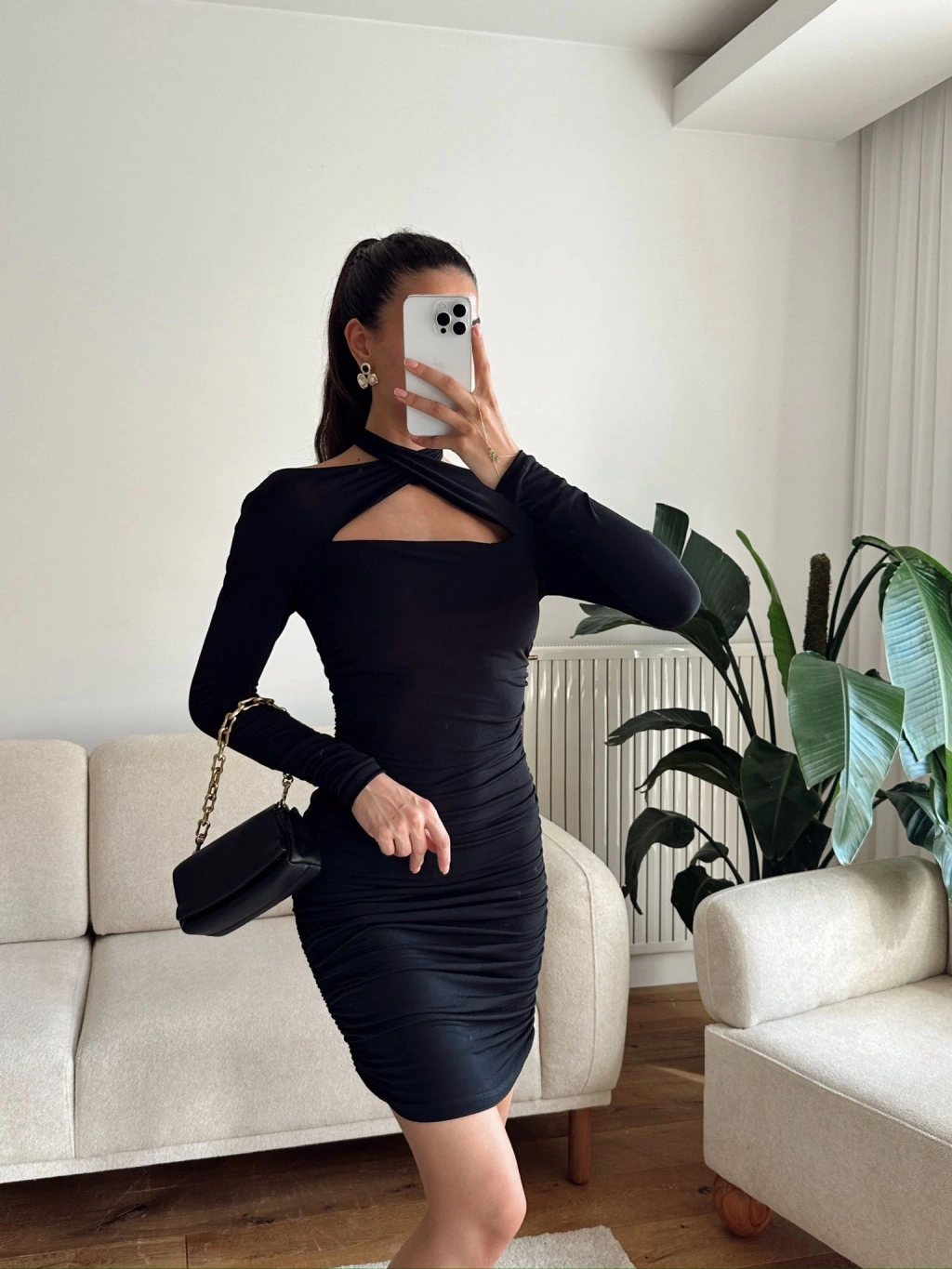 Boyun Çapraz Yan Büzgü Elbise - SİYAH