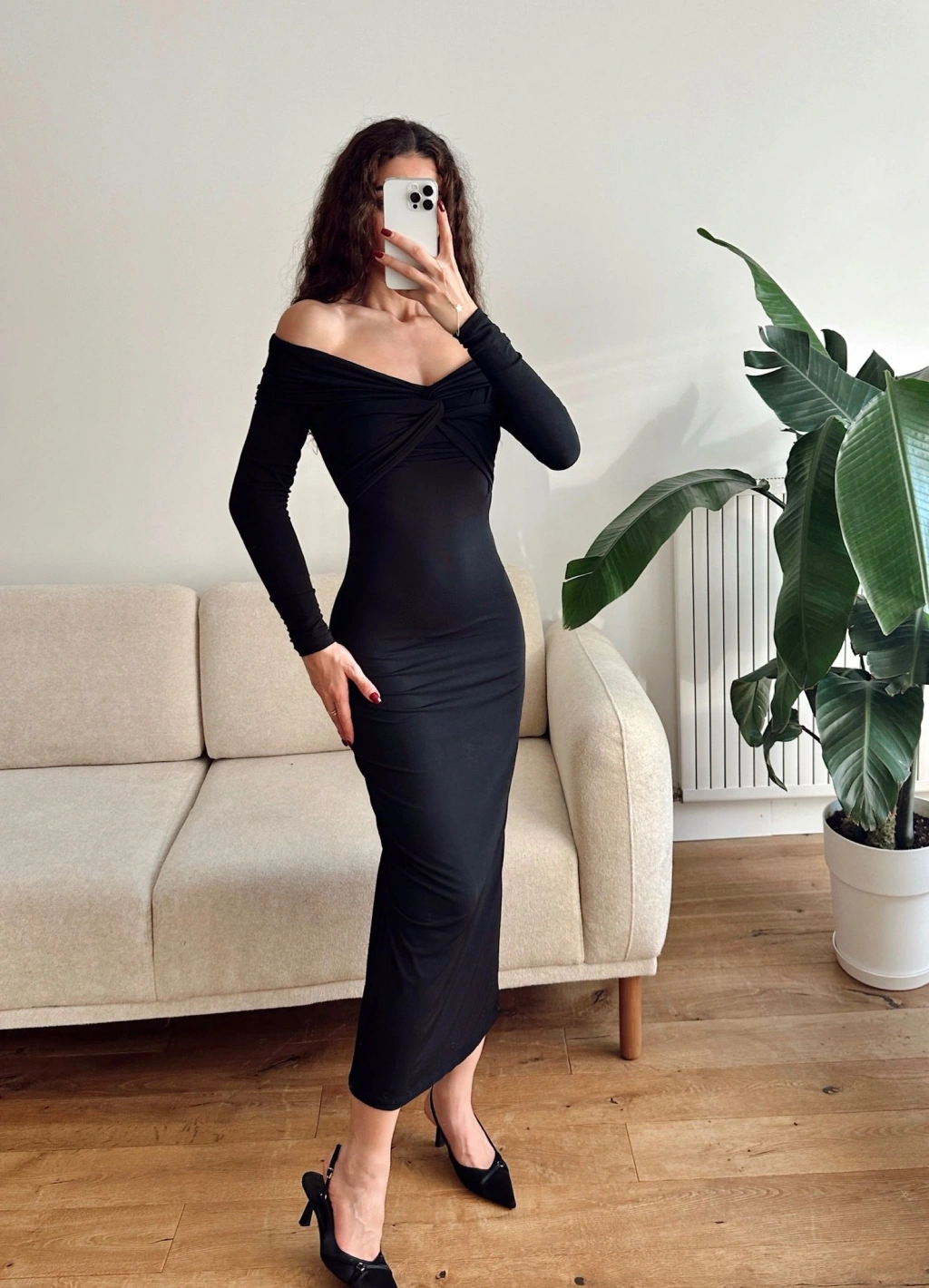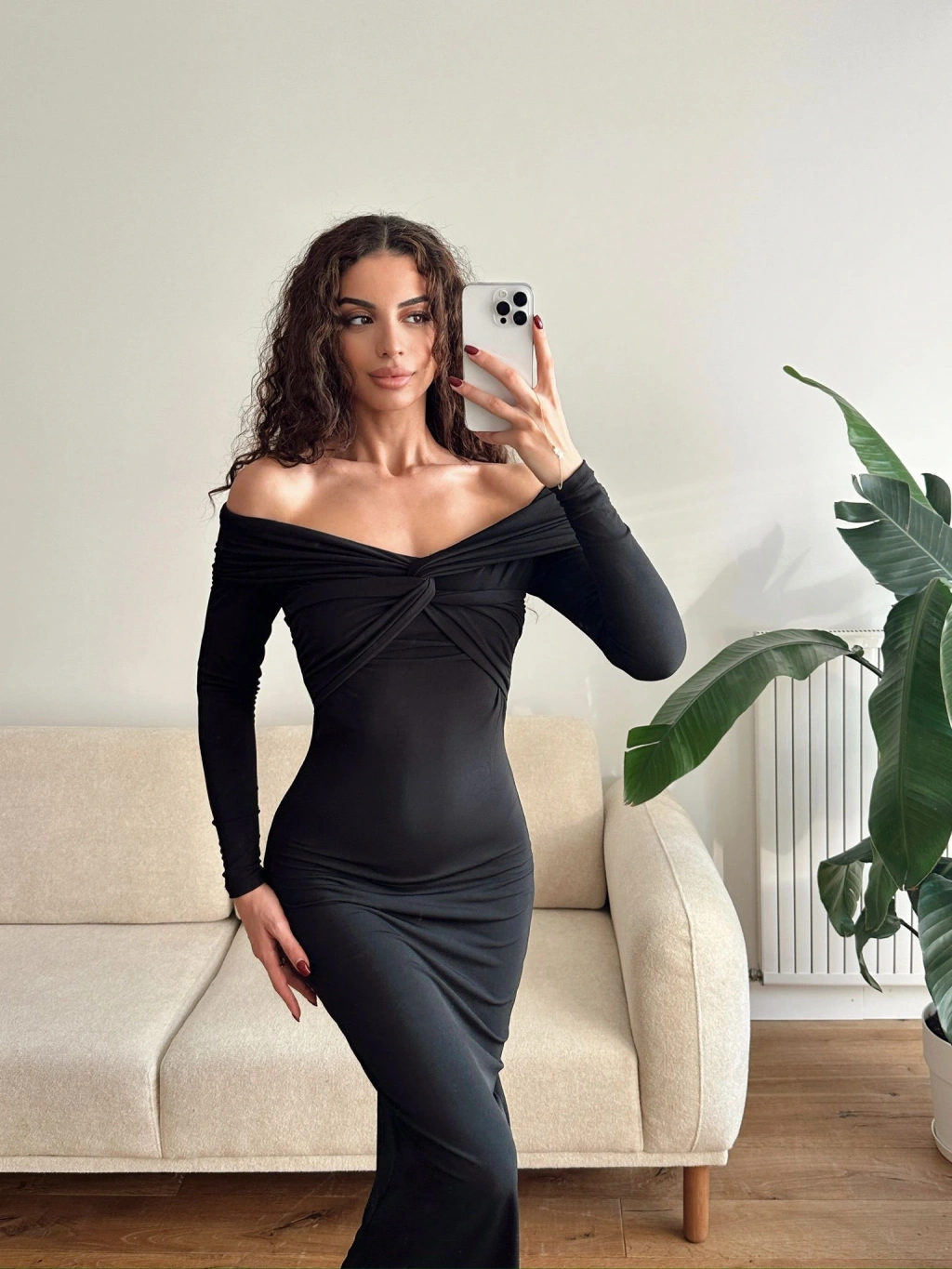 Büzgülü Madonna Yaka Elbise - SİYAH