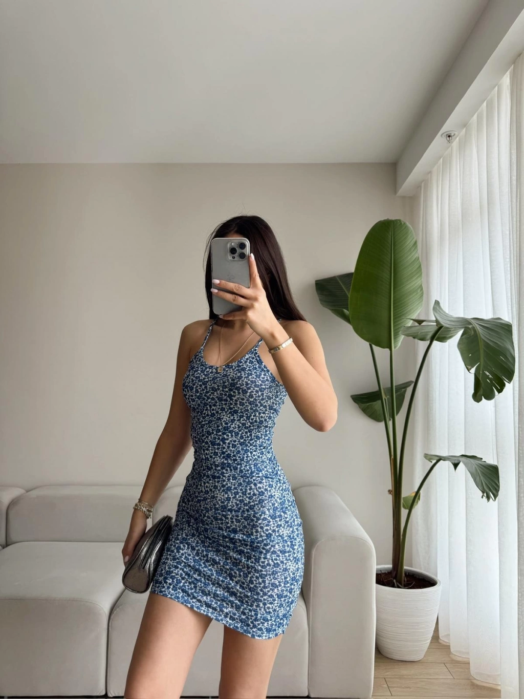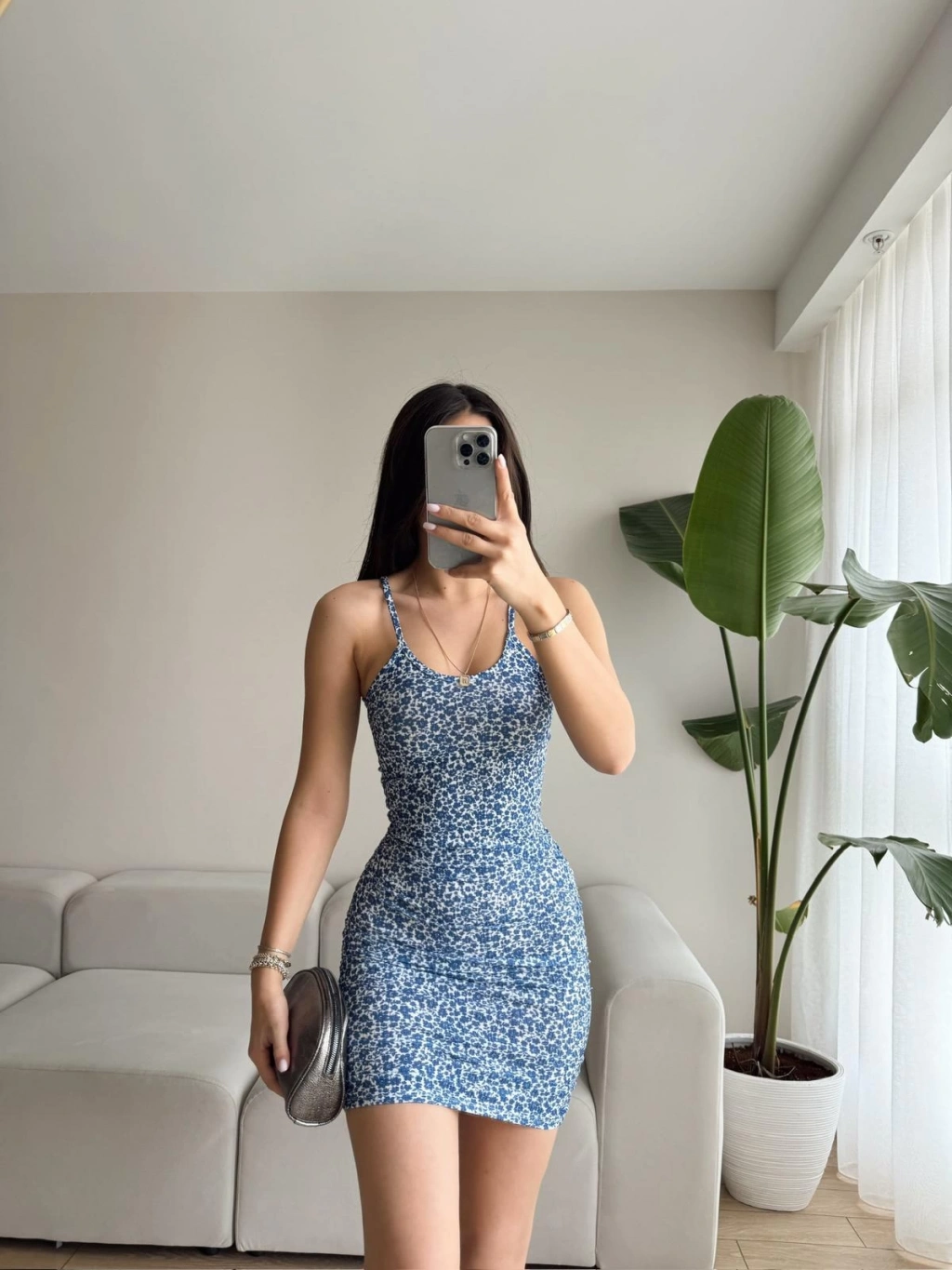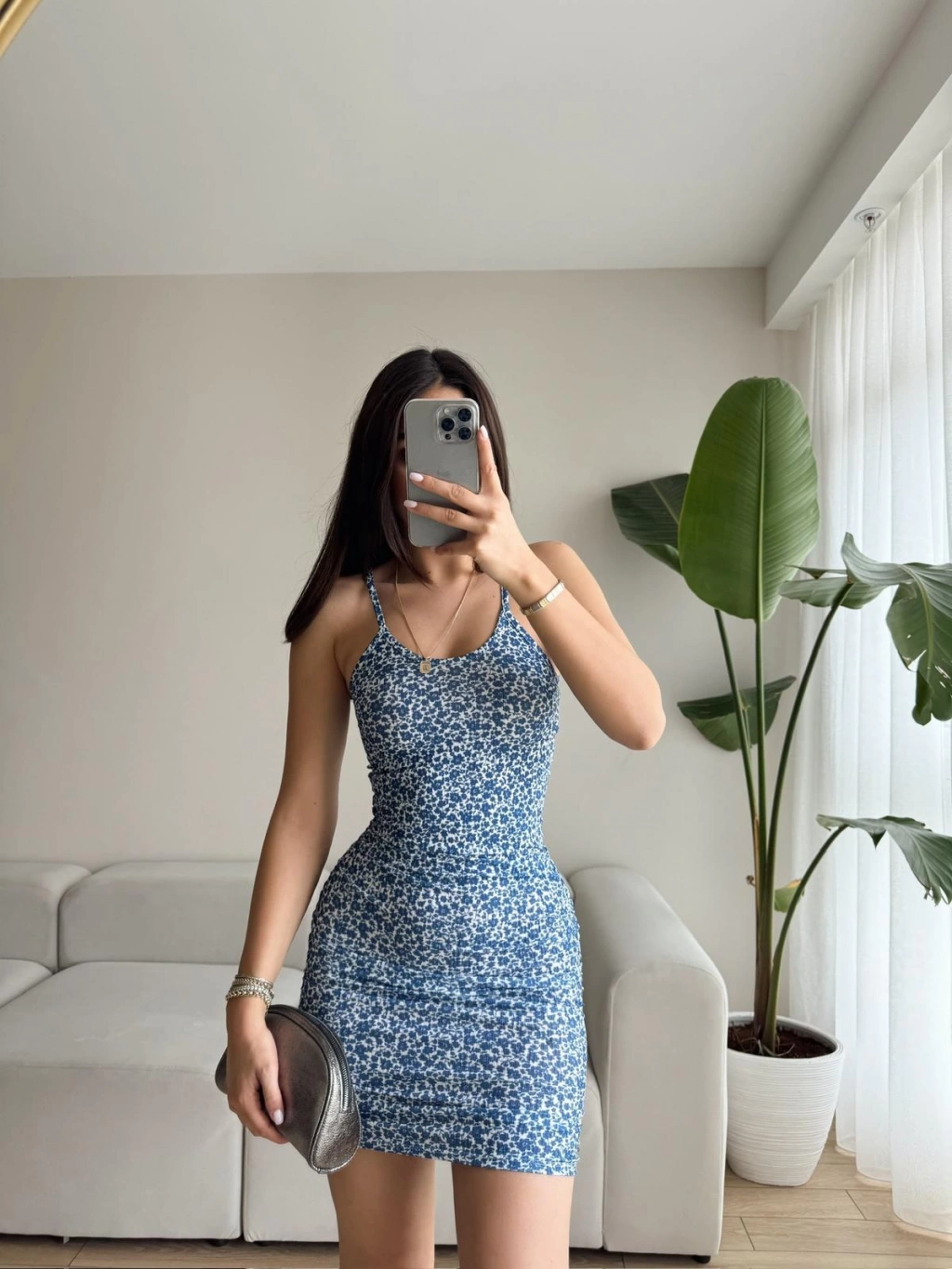 Çiçek Desen Askılı Elbise-MAVİ