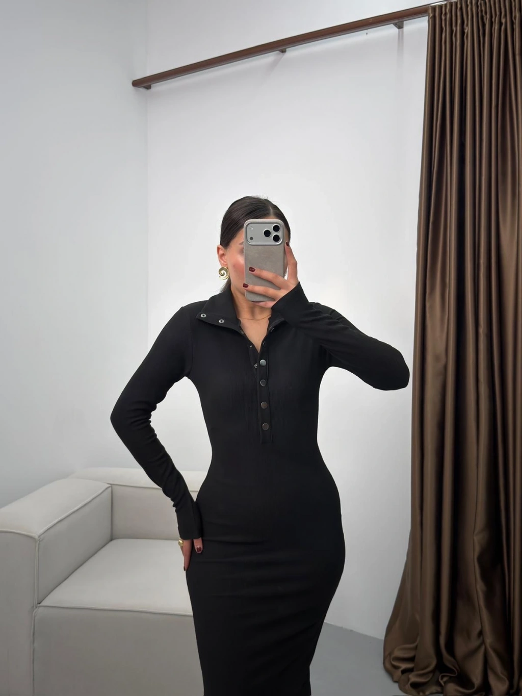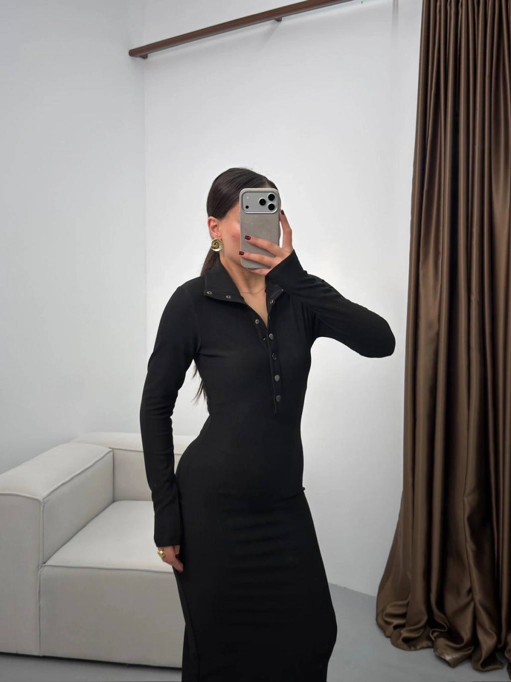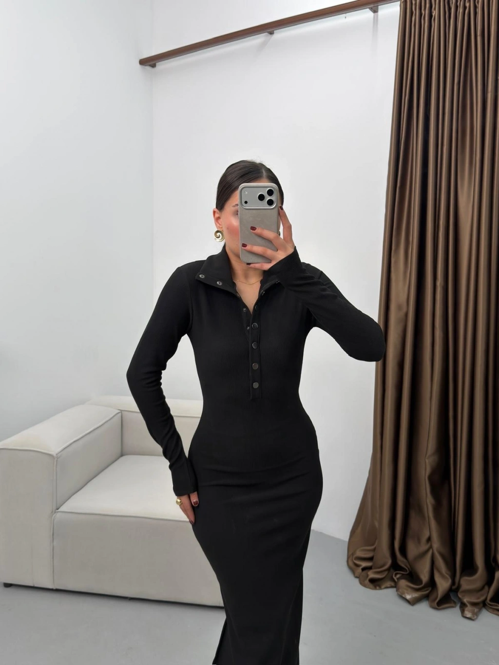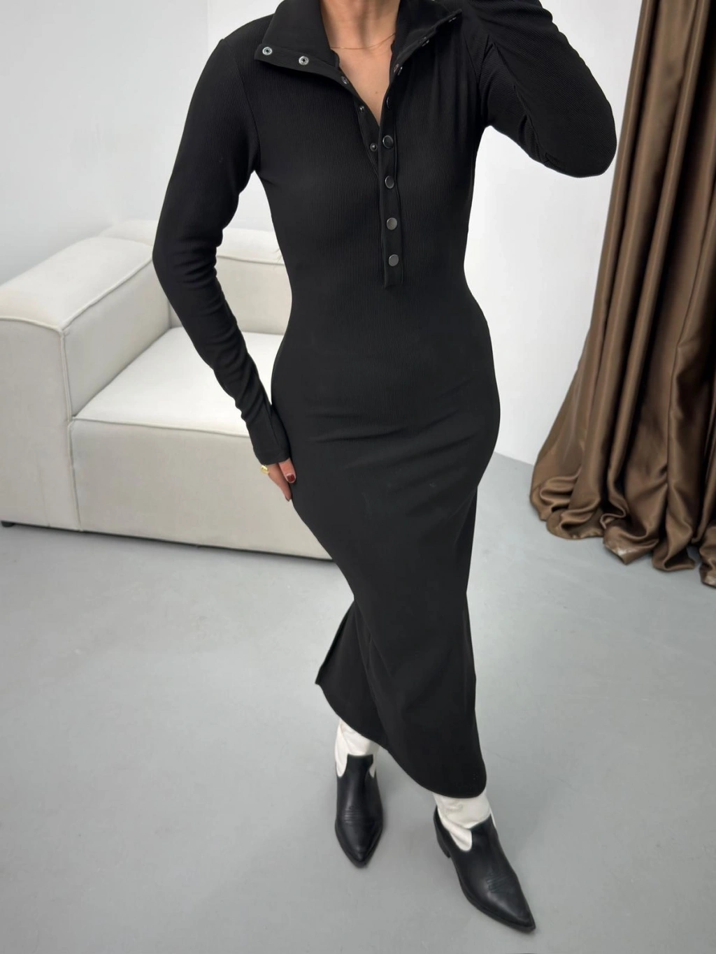 Çıtçıtlı Ottoman Long Elbise - SİYAH