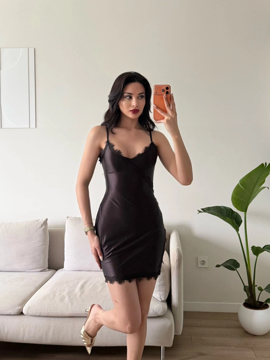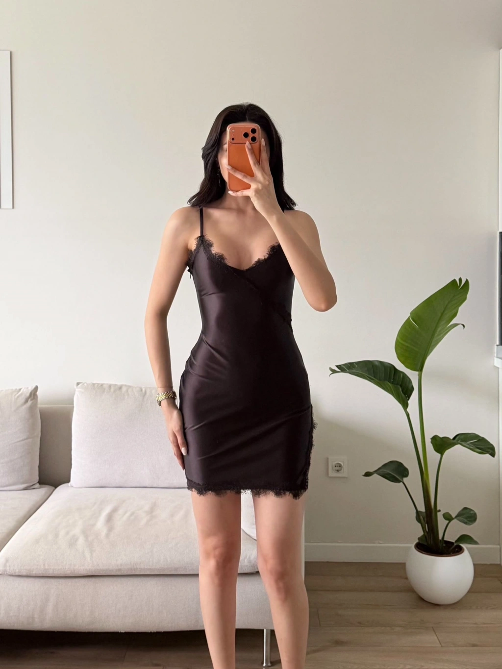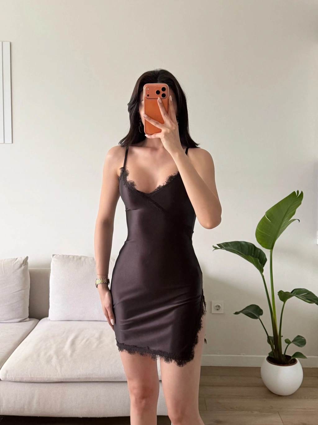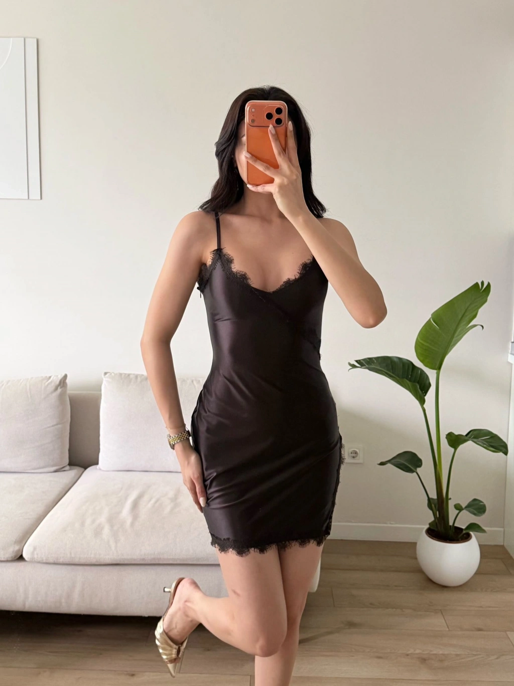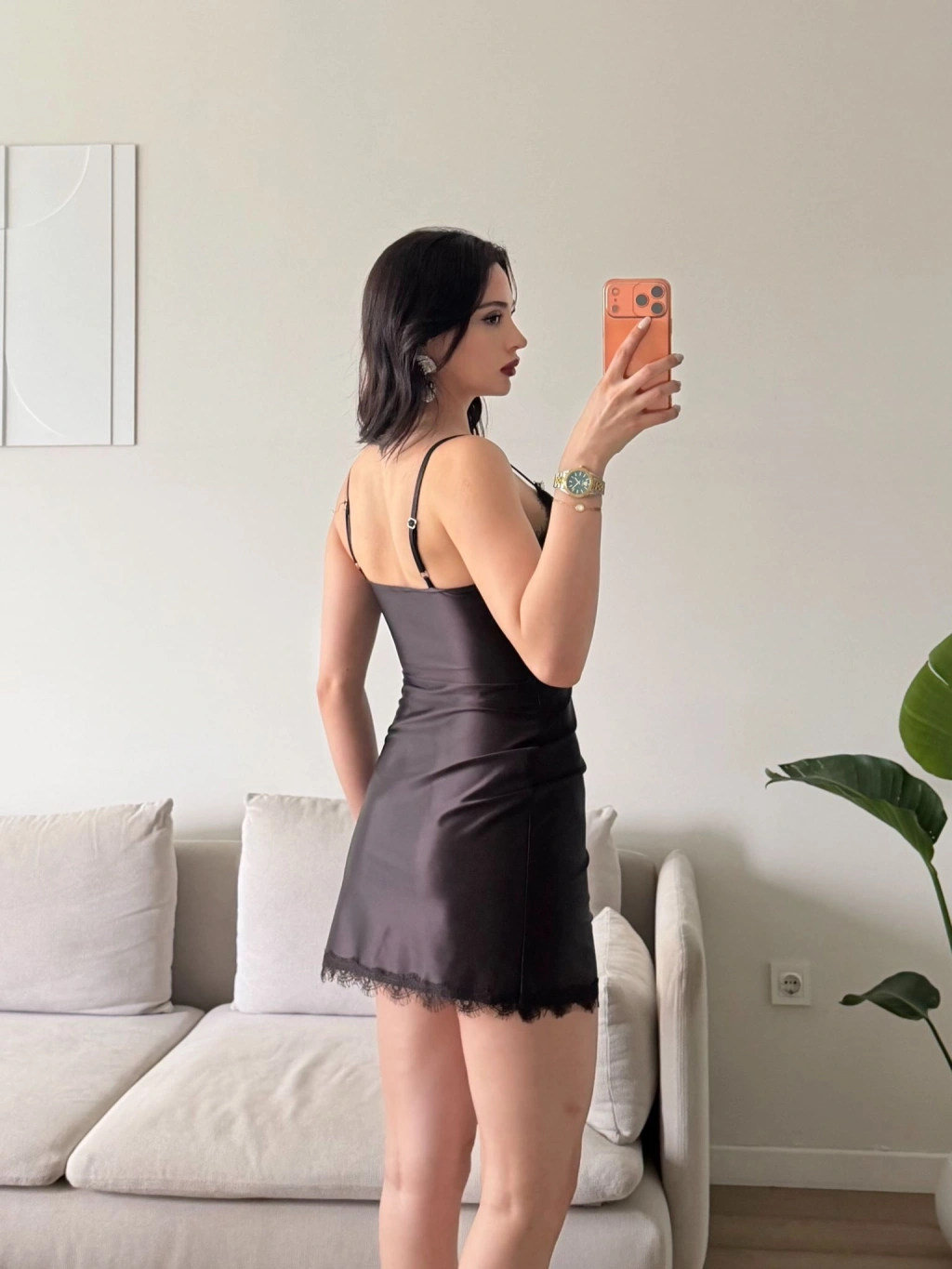 Dantel Detay Askılı Saten Elbise - KAHVE