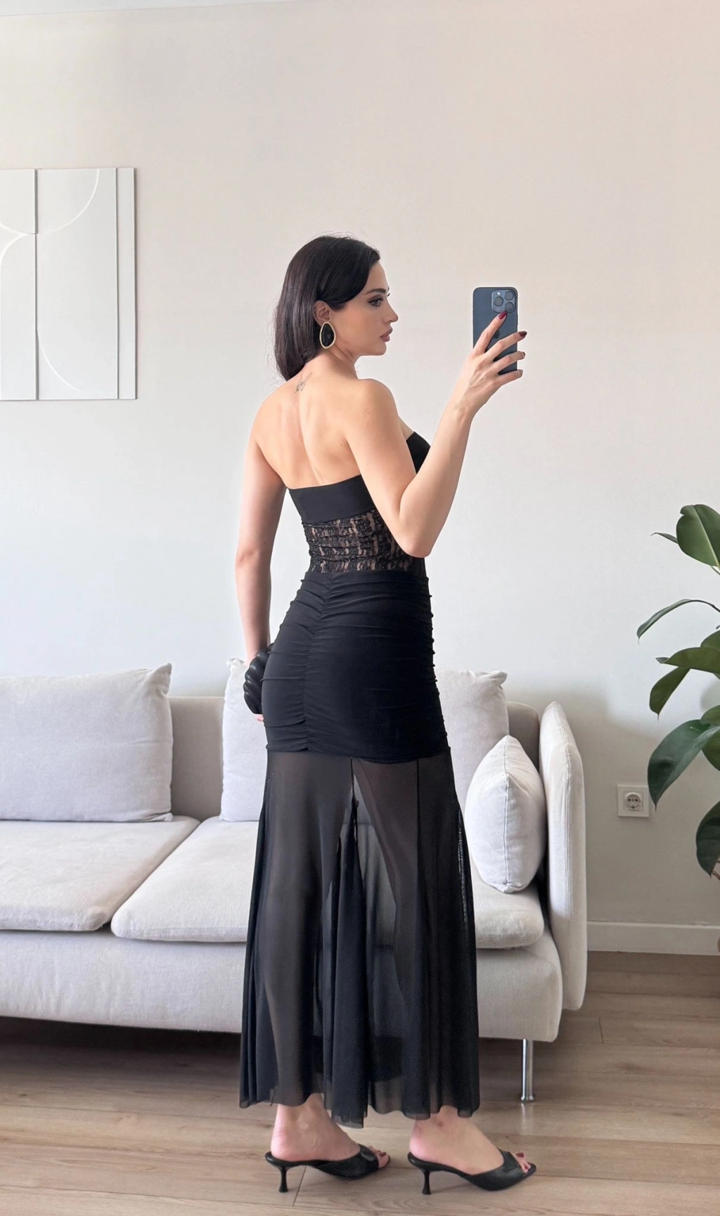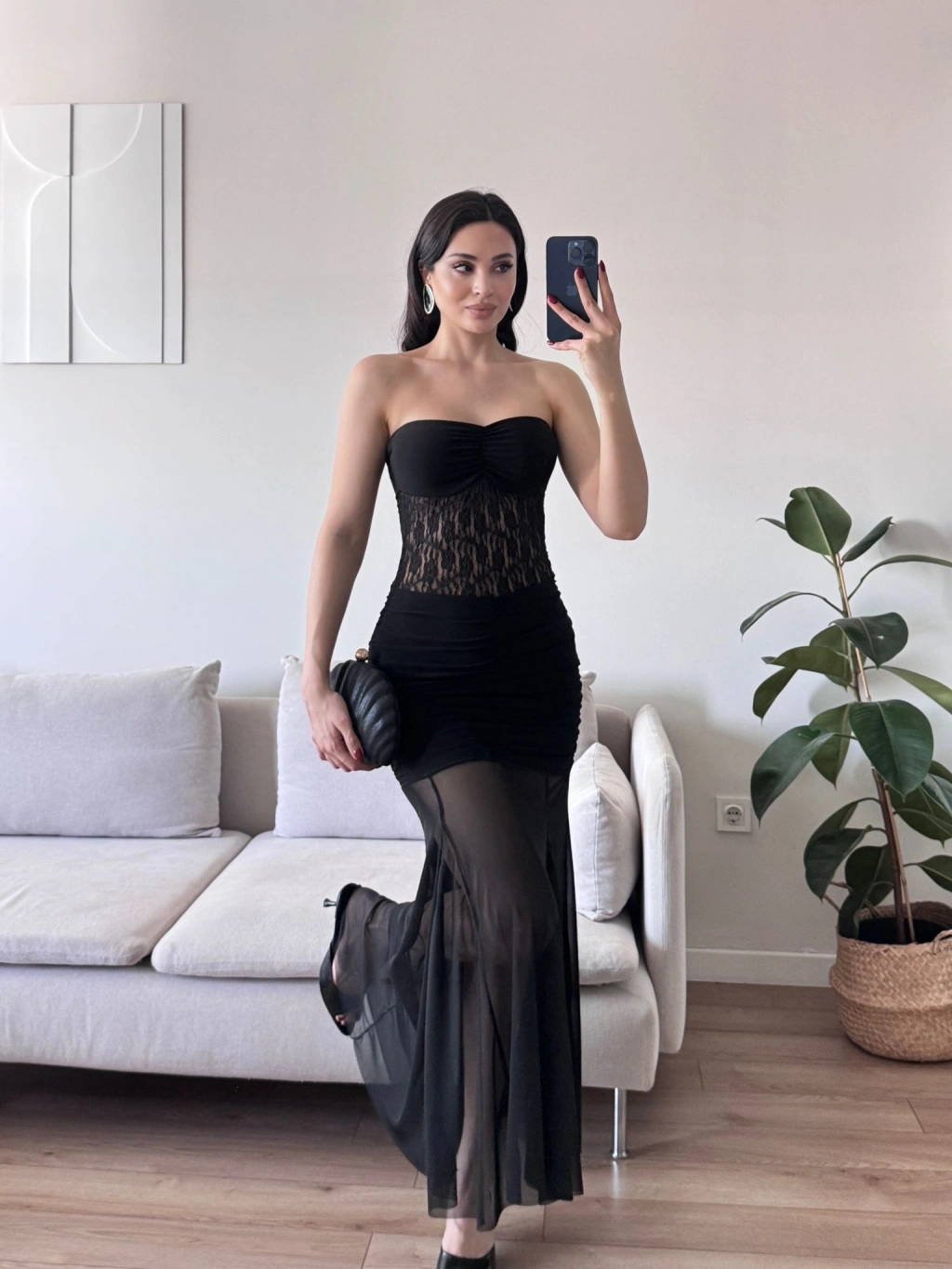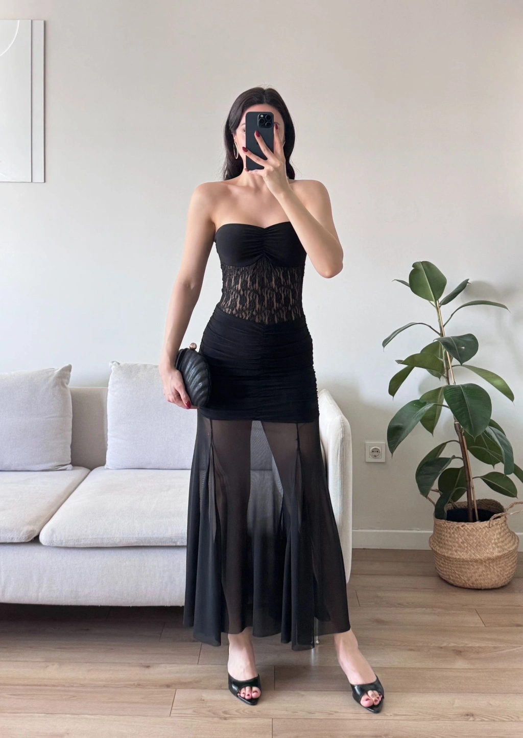 Dantel Detay Straplez Elbise - SİYAH