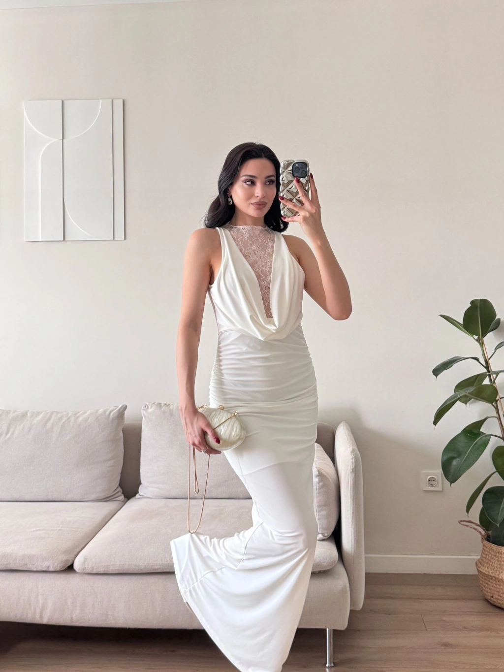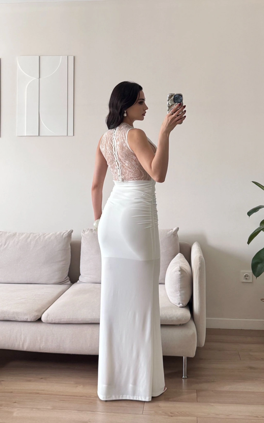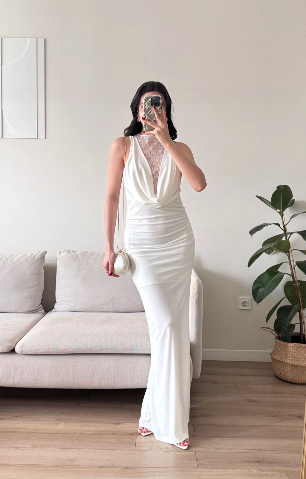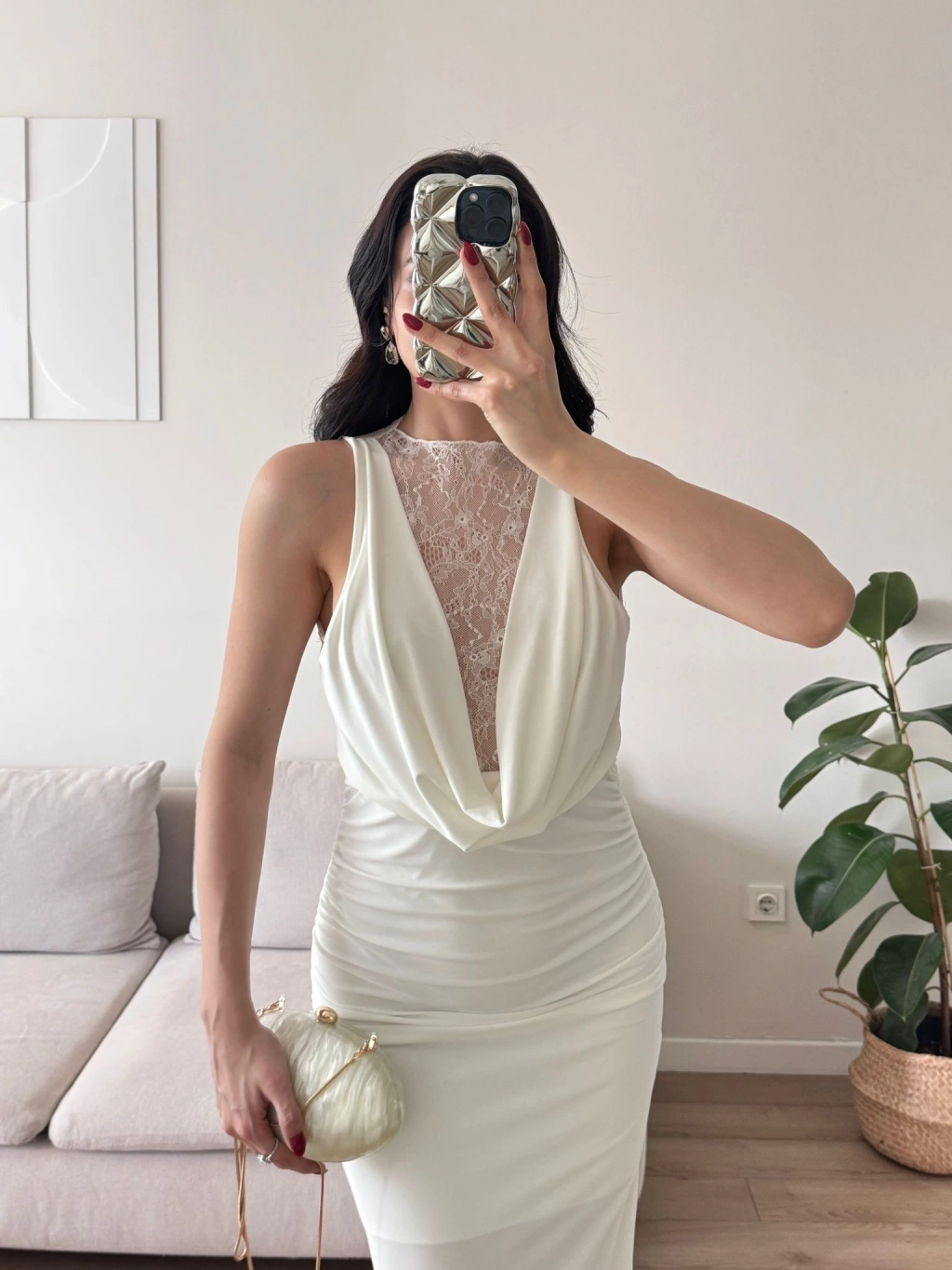 Degaje Yaka Dantel Detay Elbise - BEYAZ