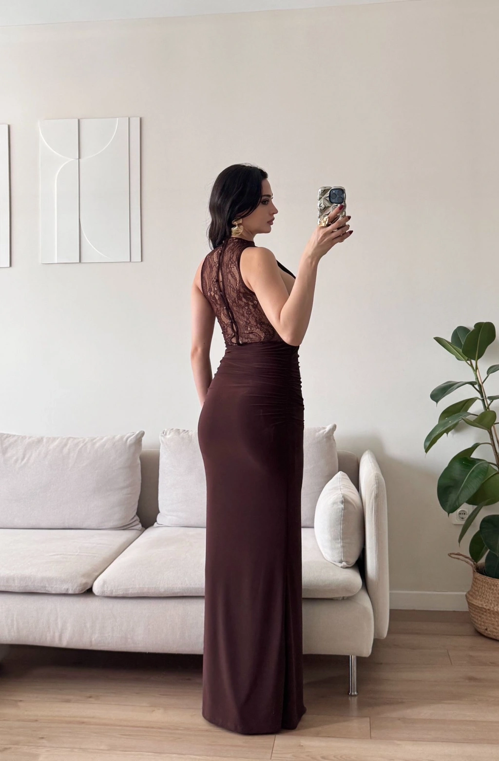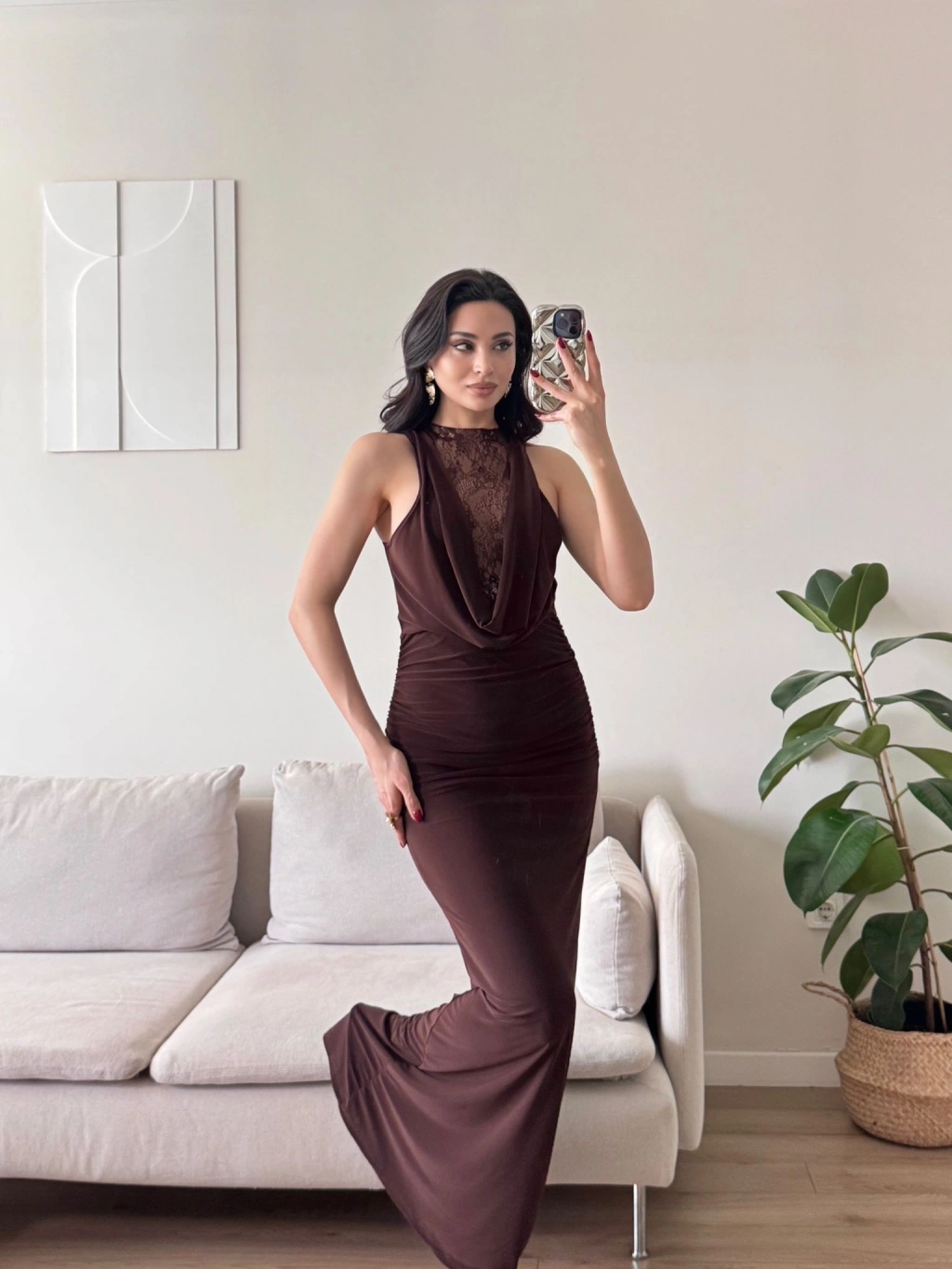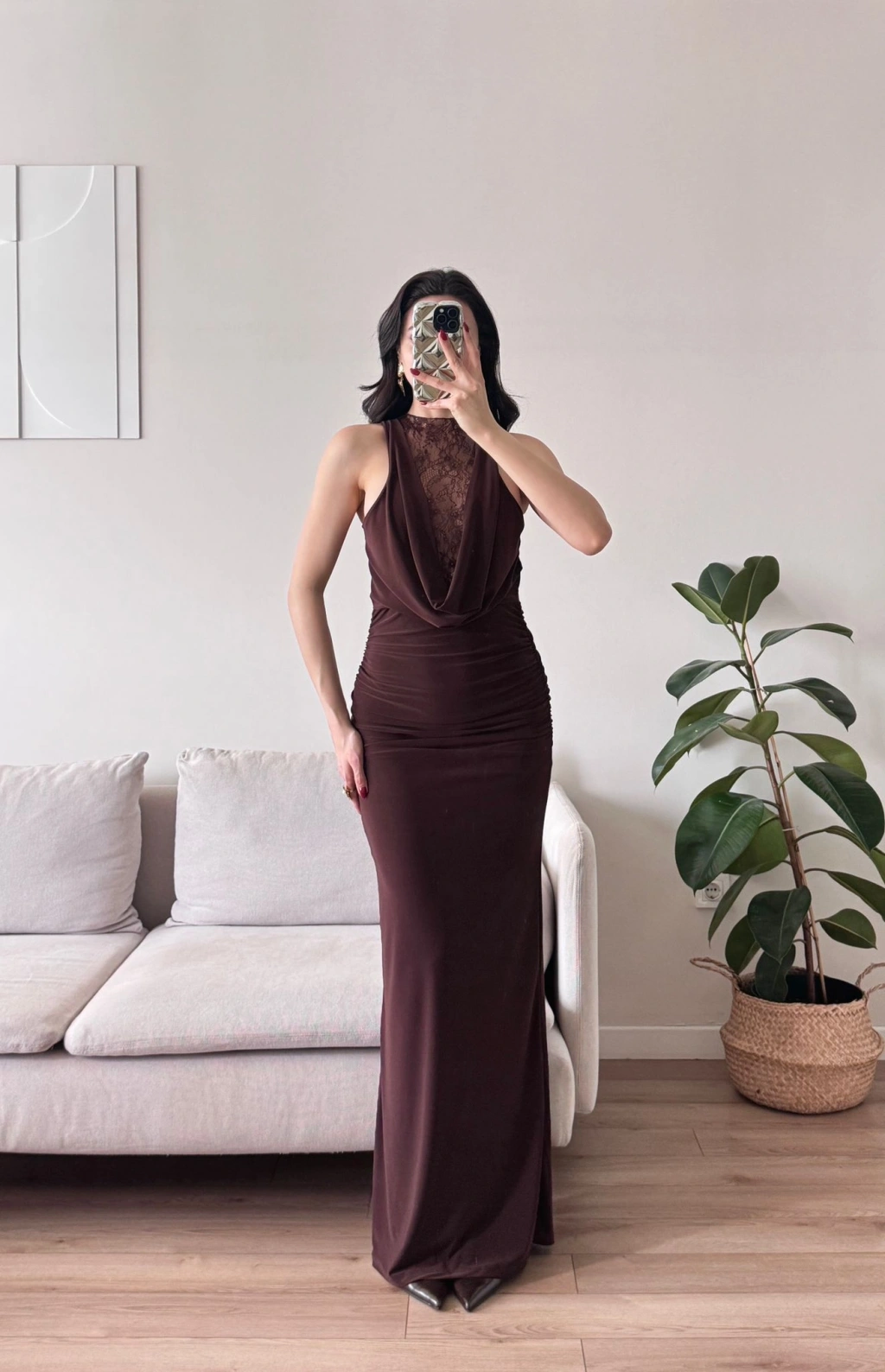 Degaje Yaka Dantel Detay Elbise - KAHVE