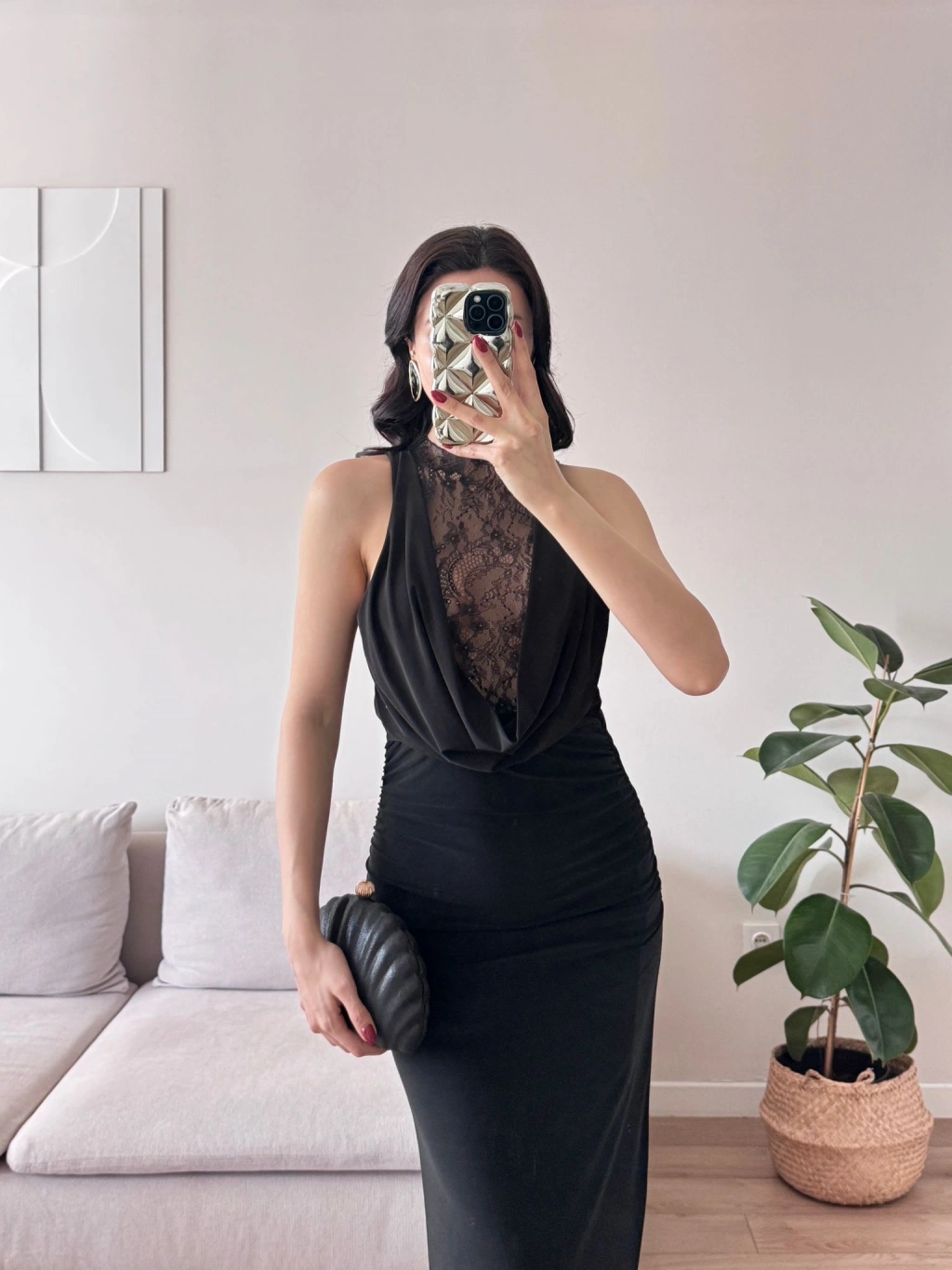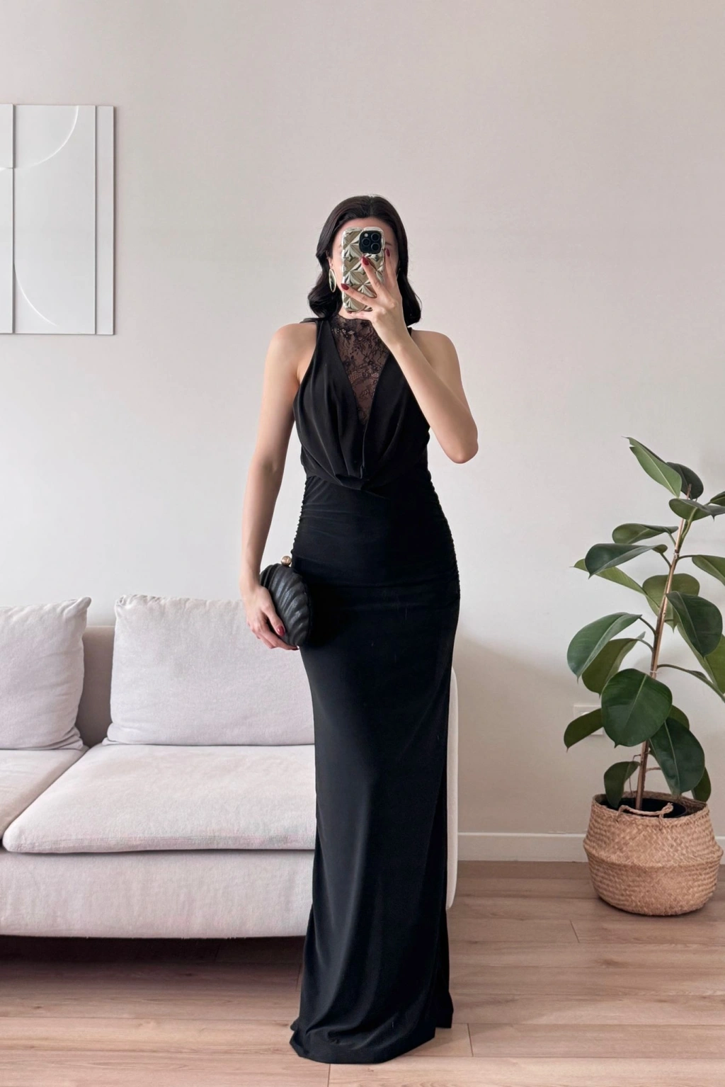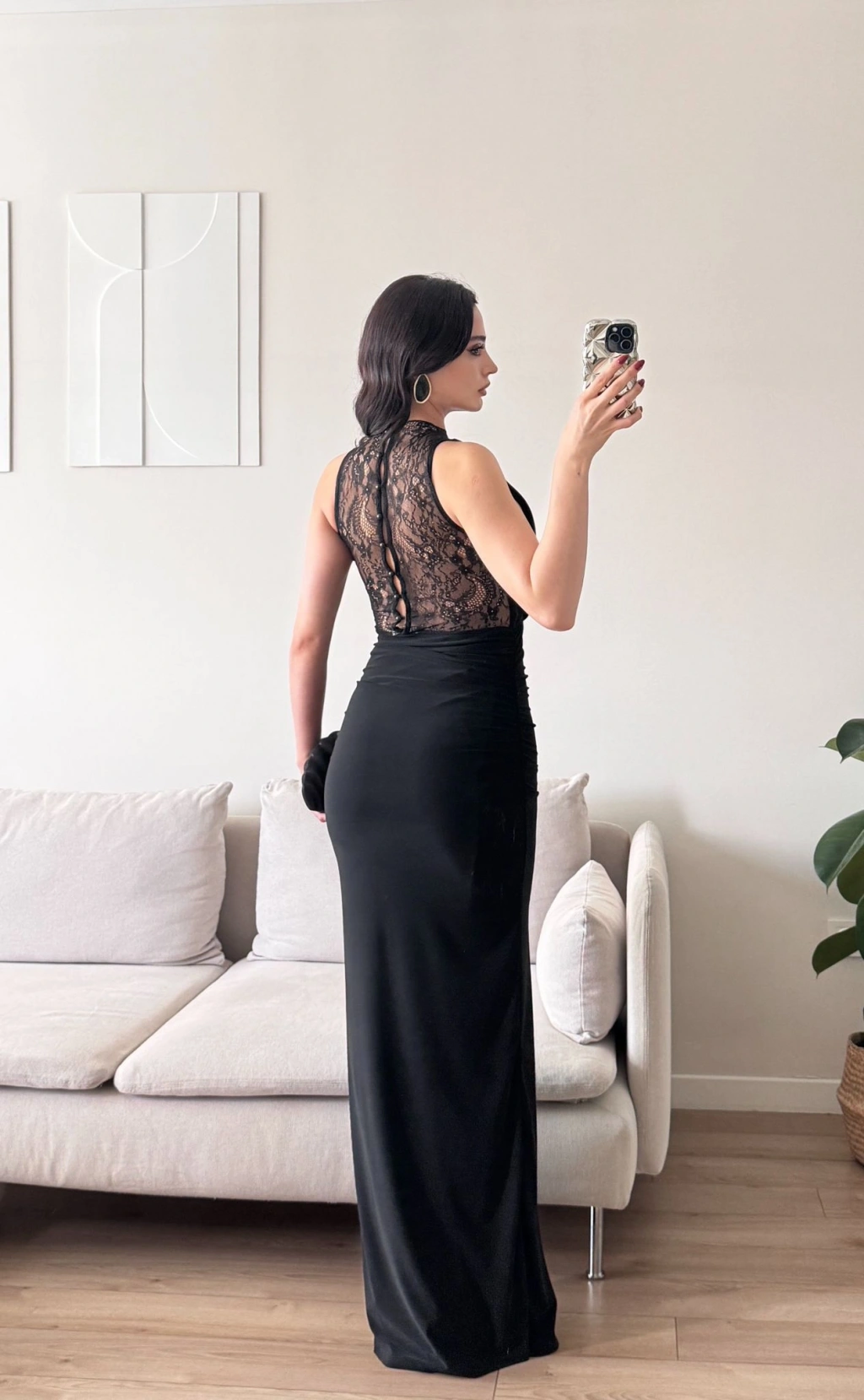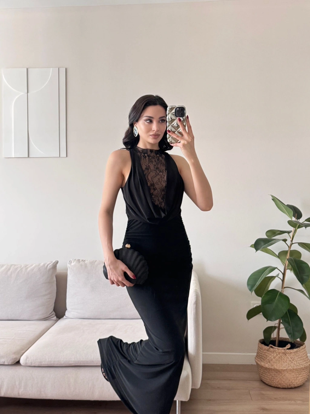 Degaje Yaka Dantel Detay Elbise - SİYAH