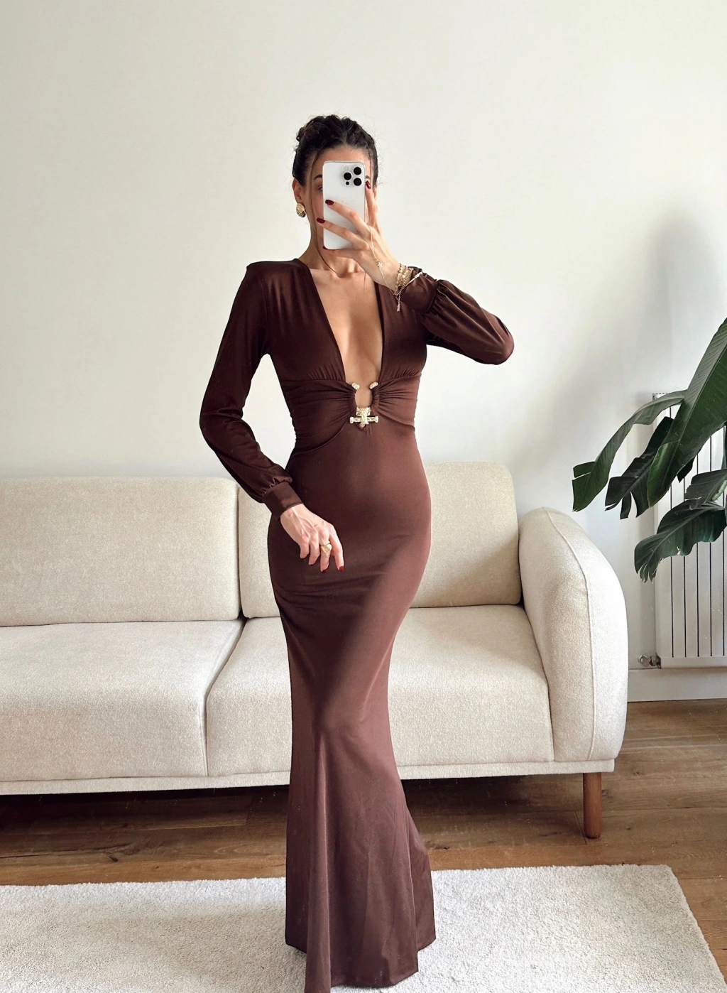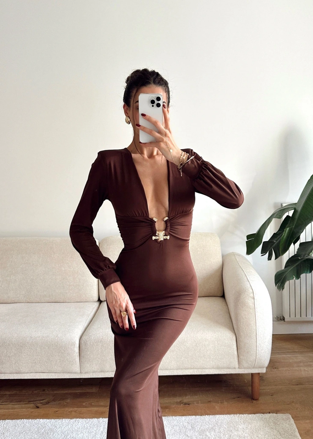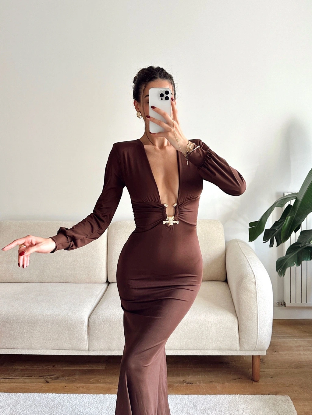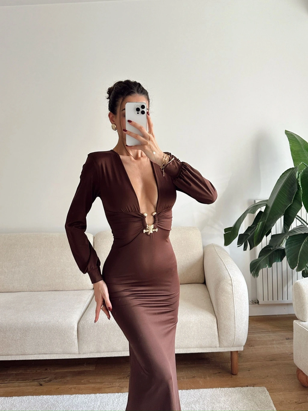 Derin Dekolte Aksesuar Elbise - KAHVE