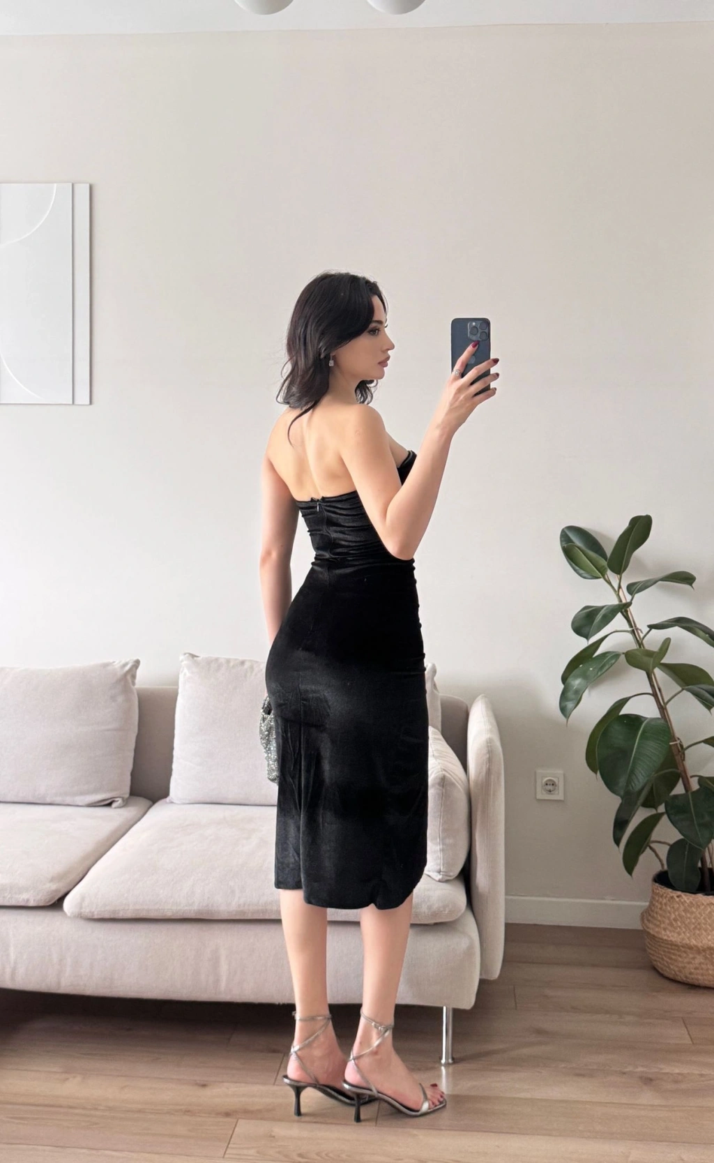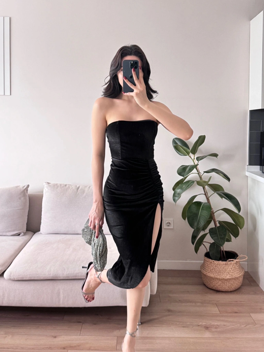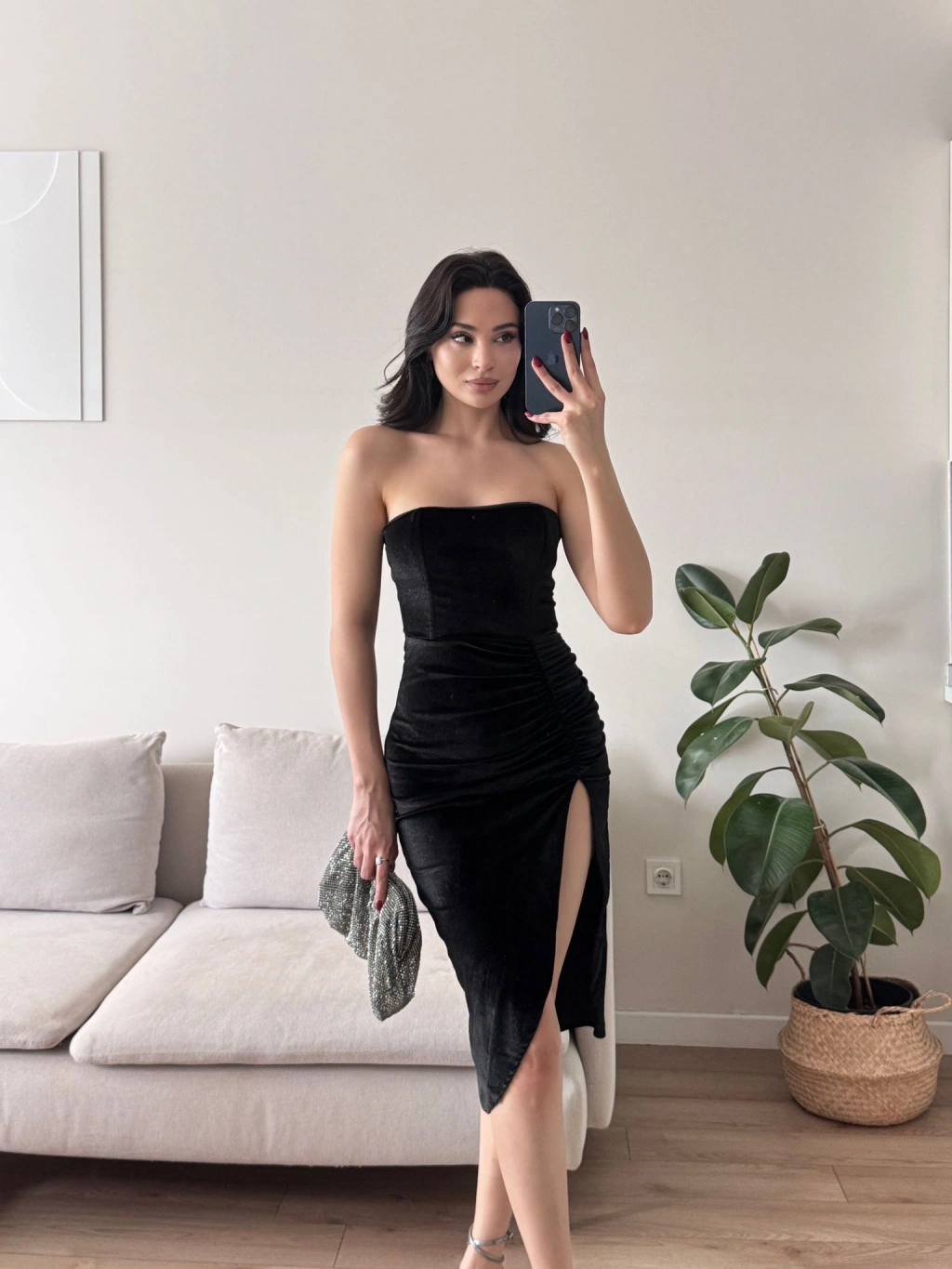 Derin Yırtmaç Straplez Elbise - SİYAH