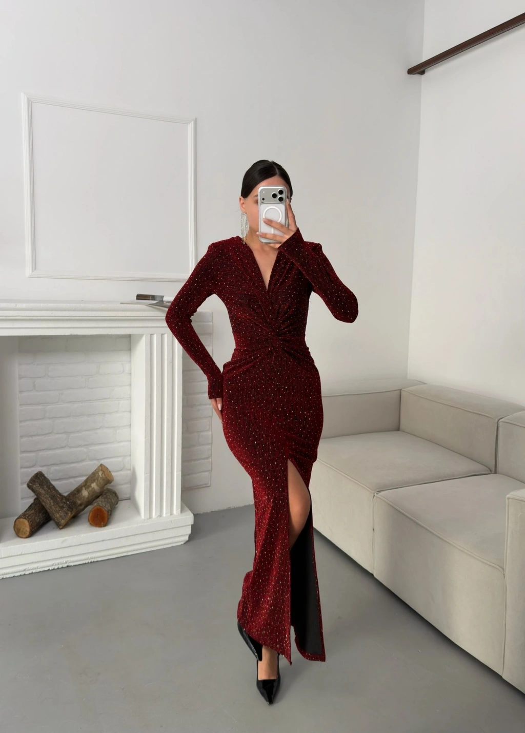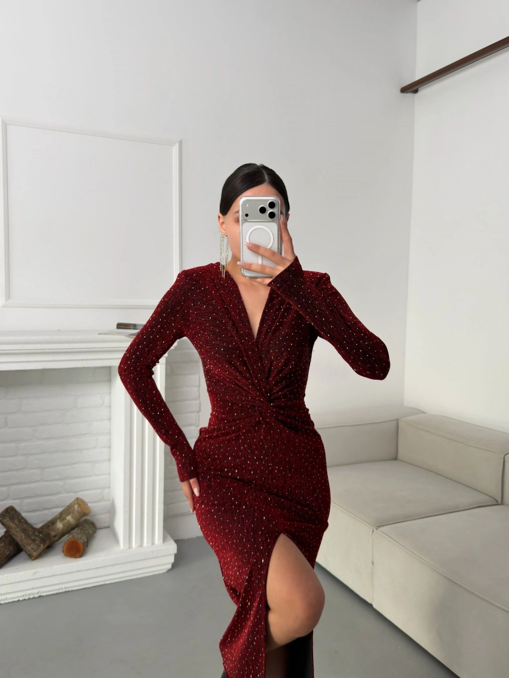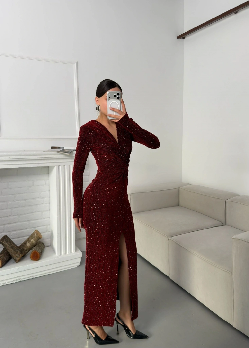 Derin Yırtmaçlı Kruvaze Elbise - BORDO