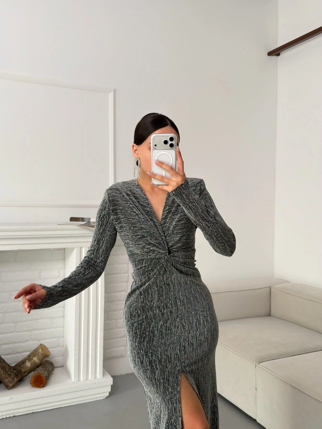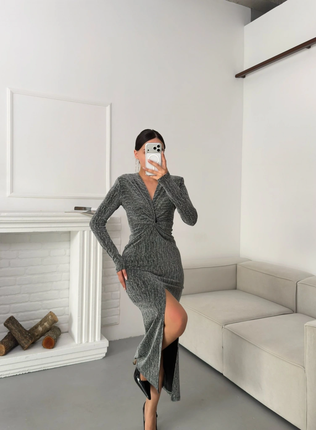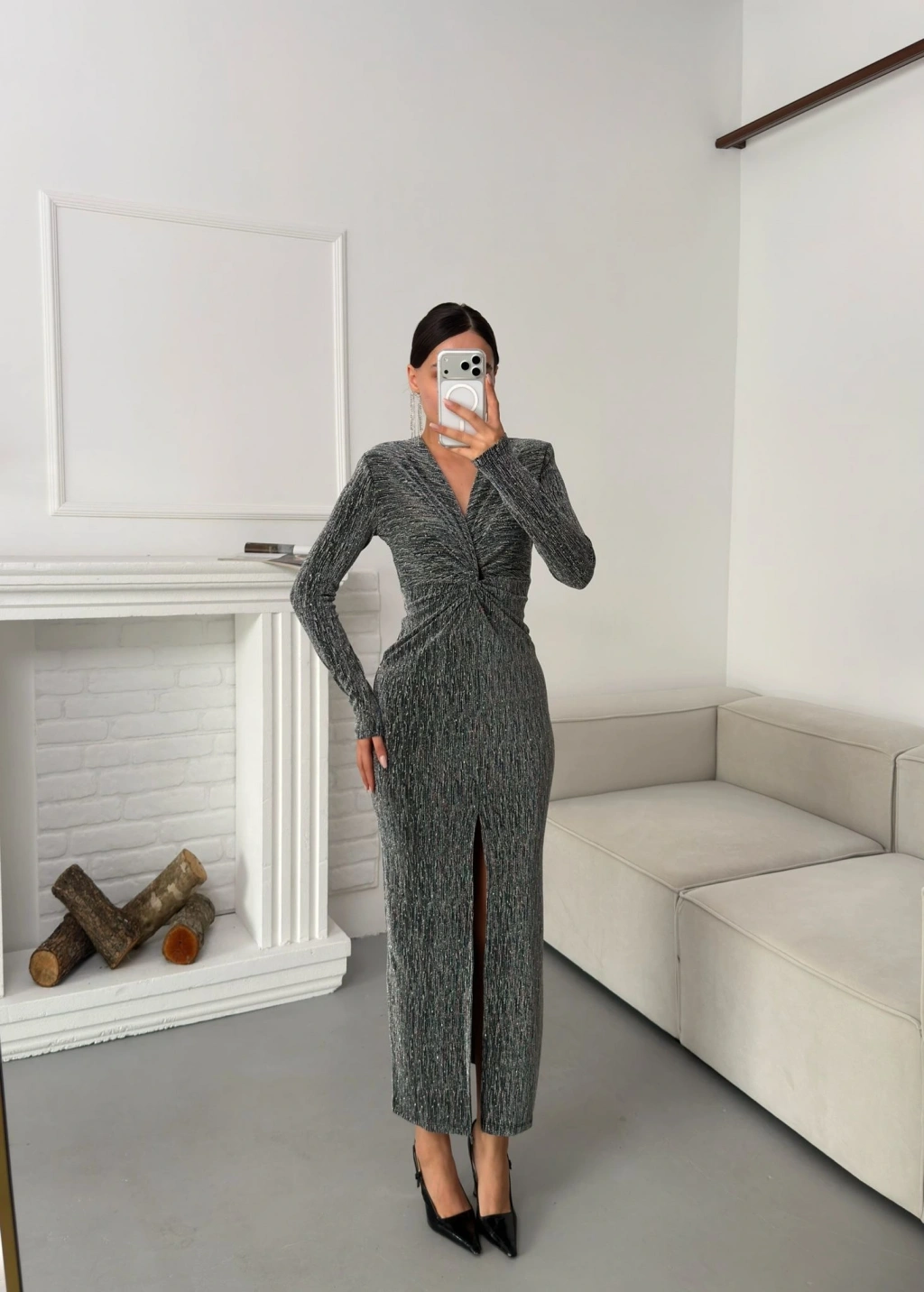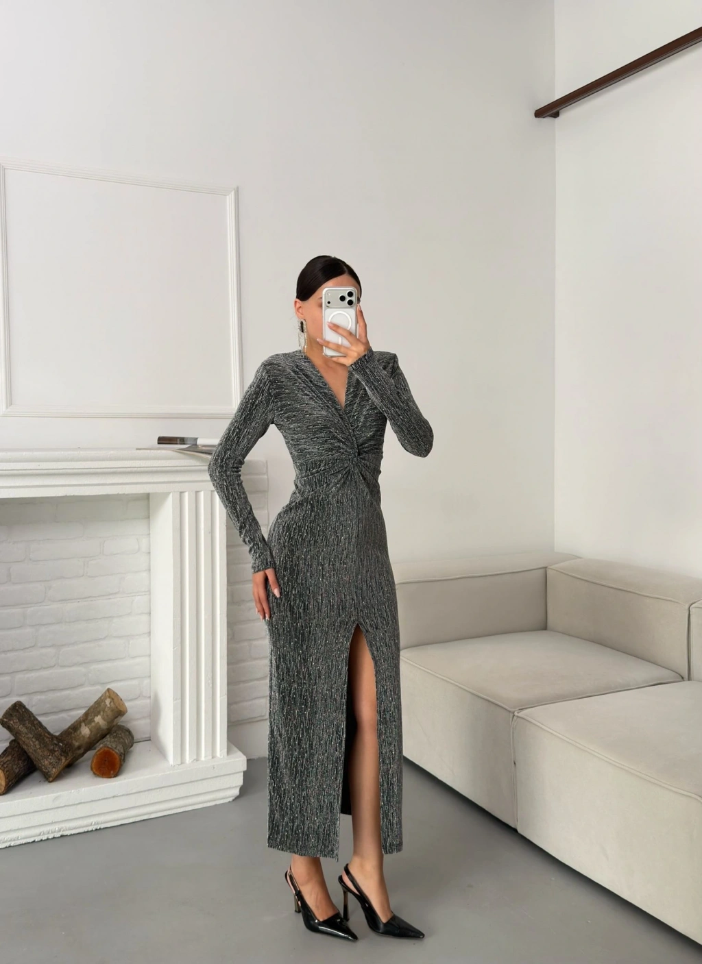 Derin Yırtmaçlı Kruvaze Elbise - GRİ
