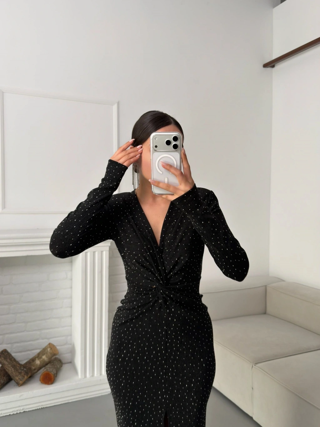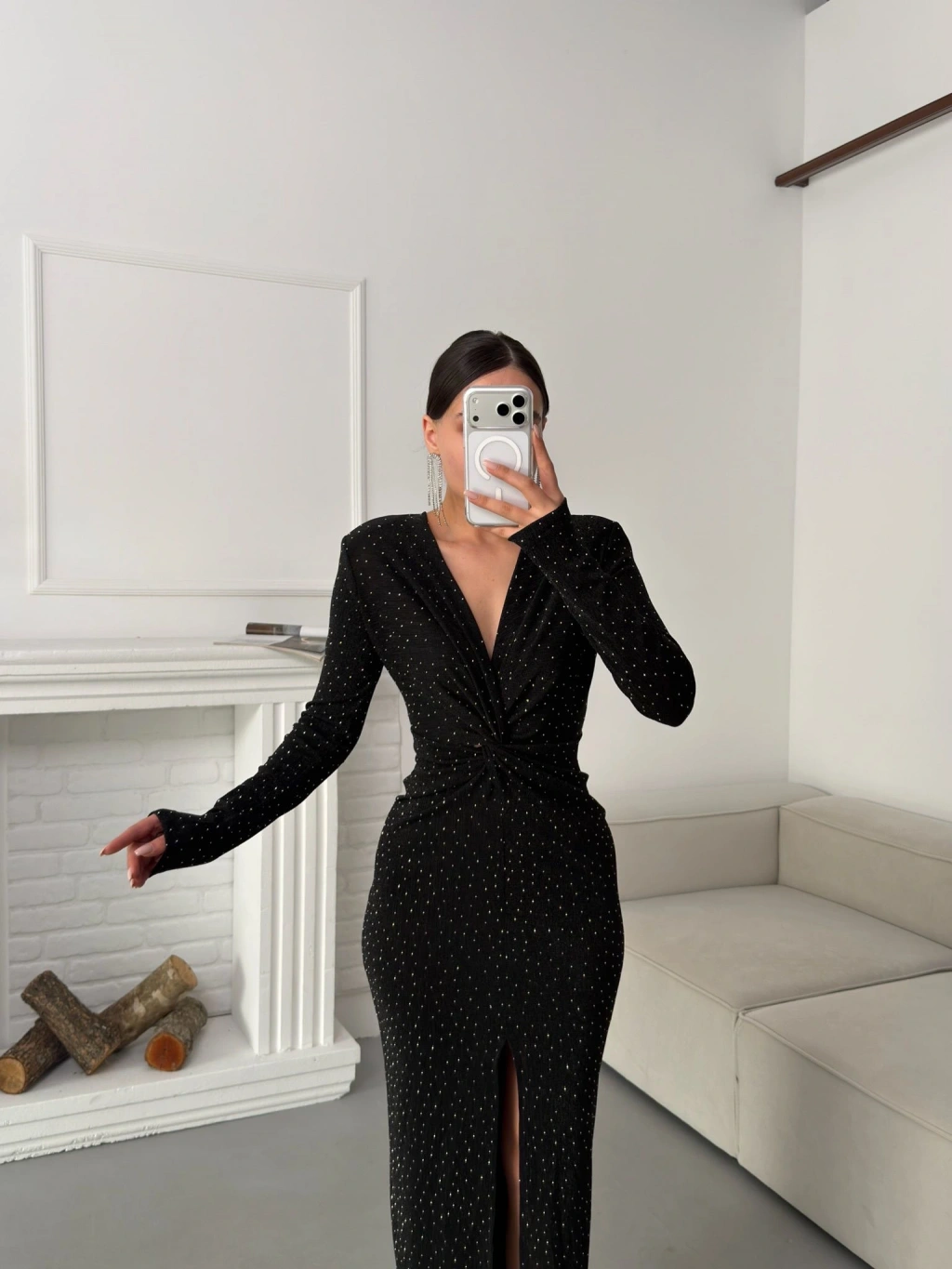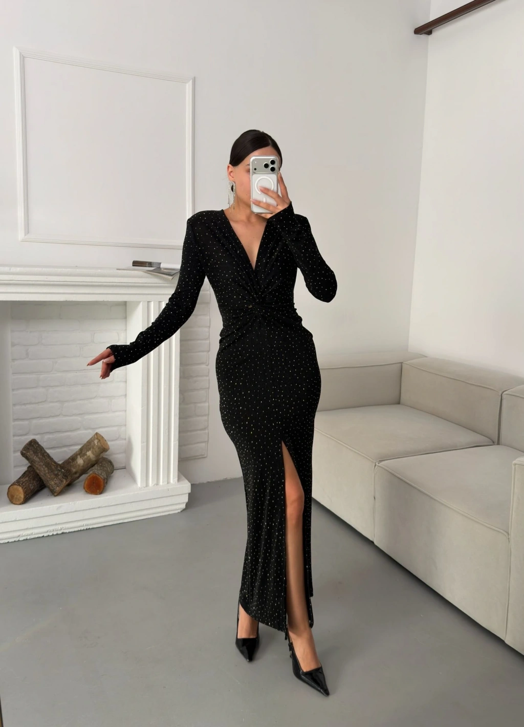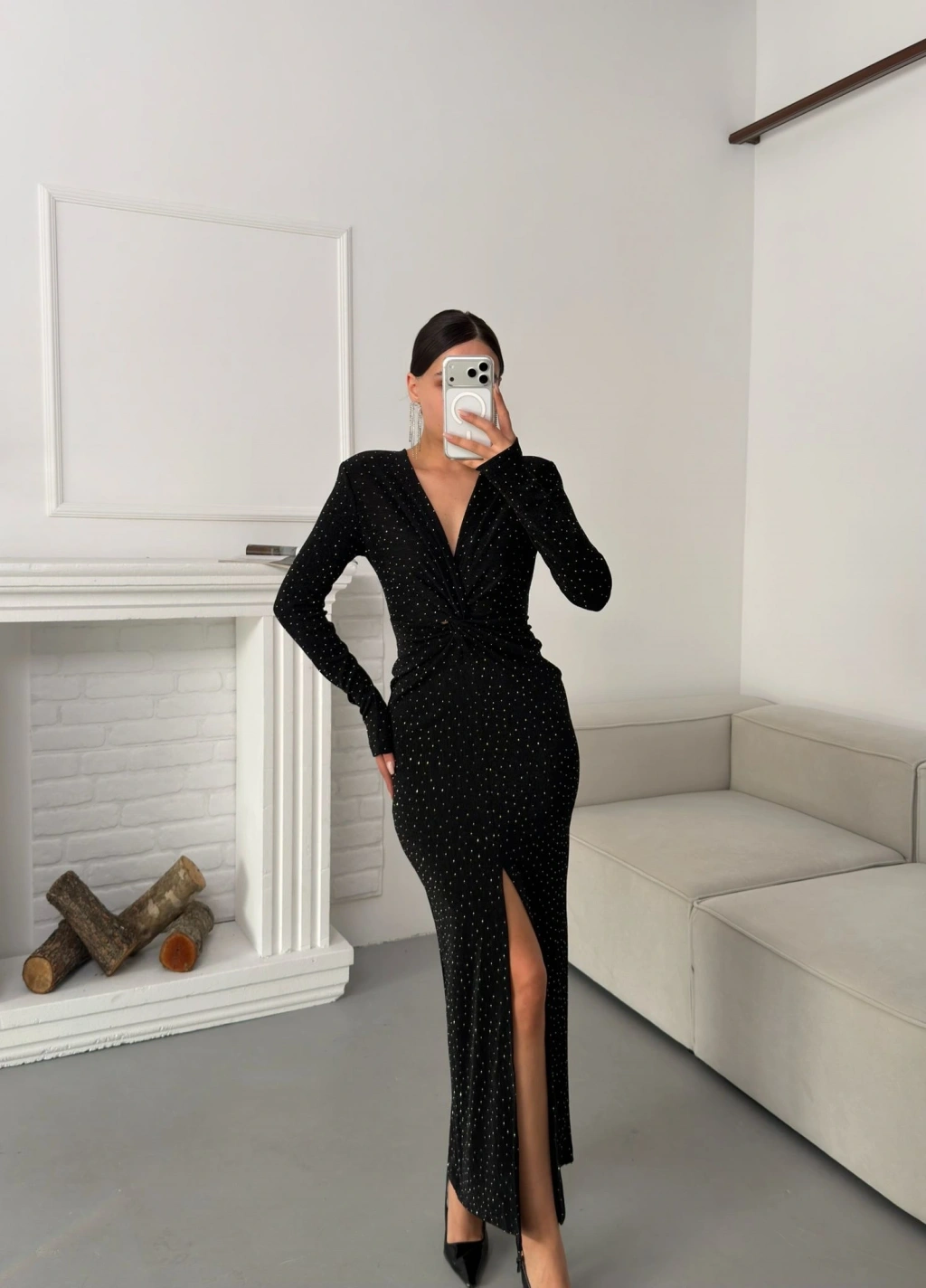 Derin Yırtmaçlı Kruvaze Elbise - SİYAH