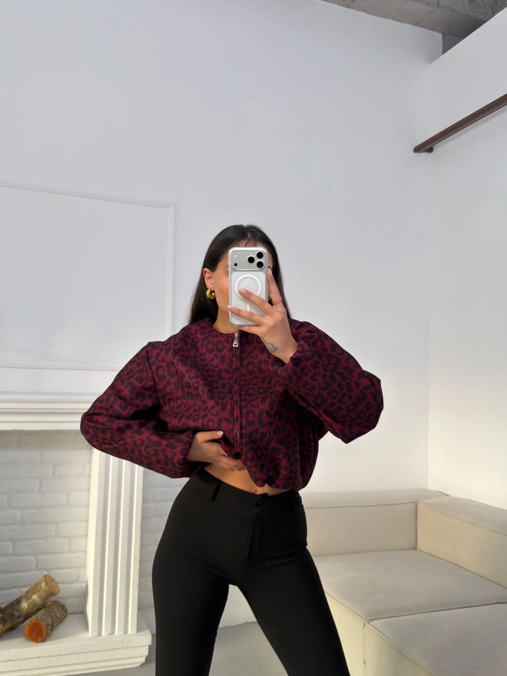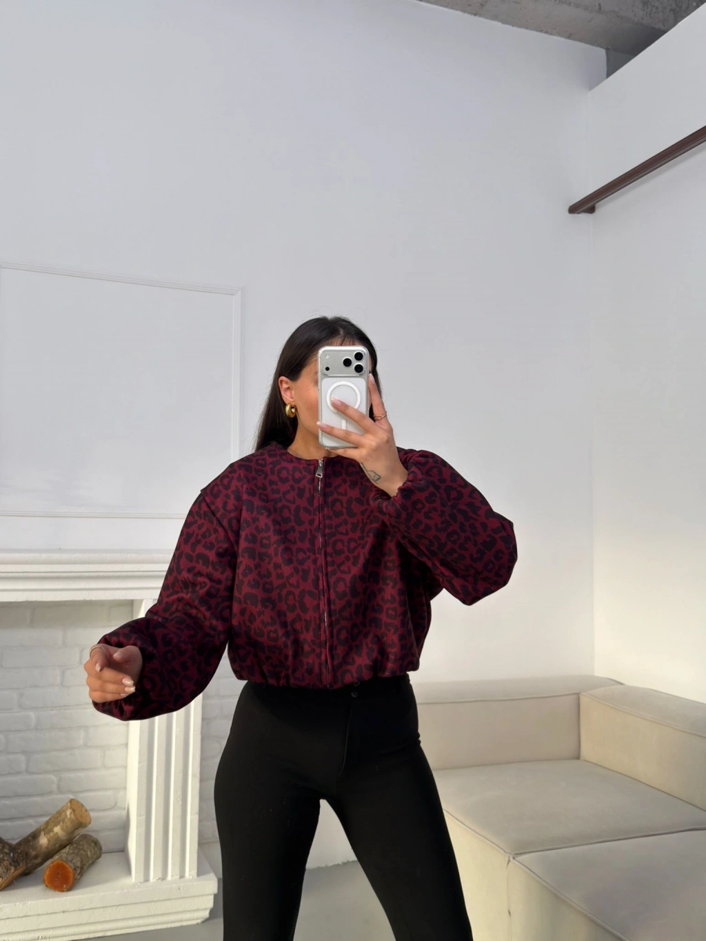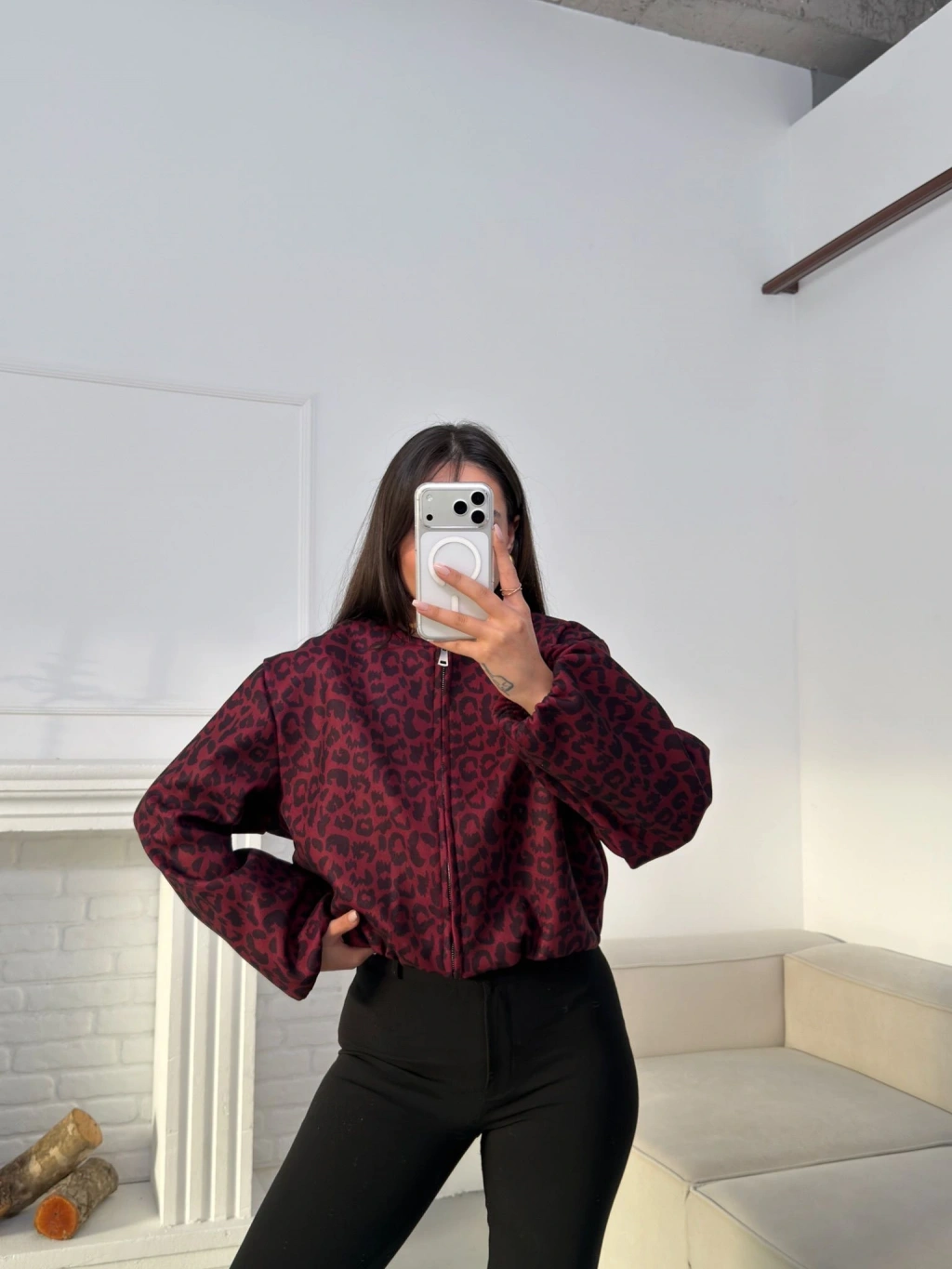 Desenli Oversize Crop Ceket - BORDO