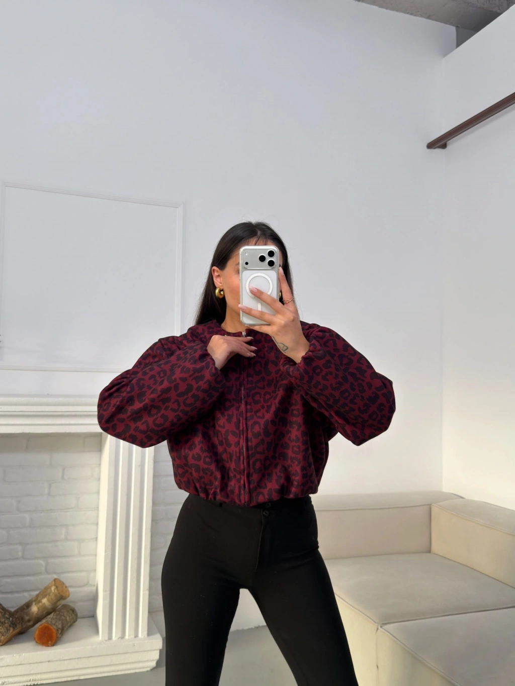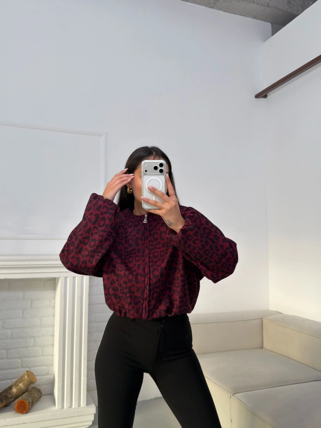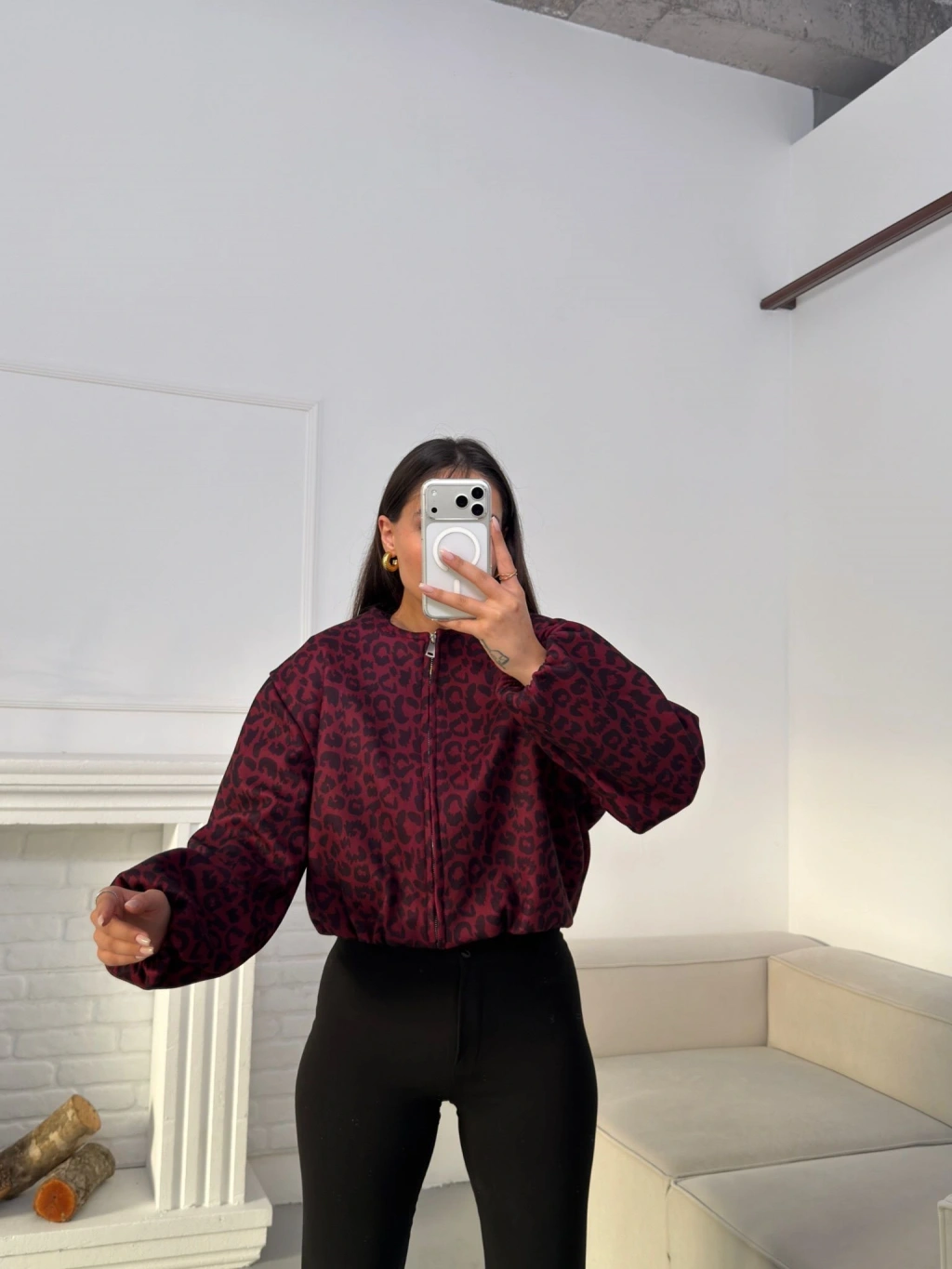 Desenli Oversize Crop Ceket - BORDO