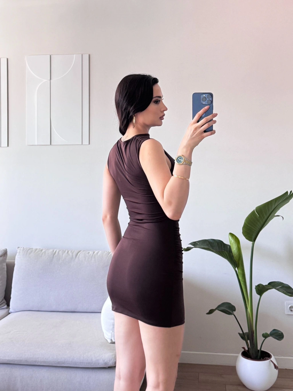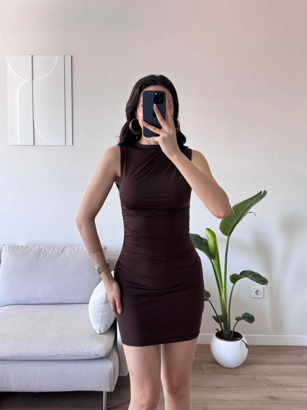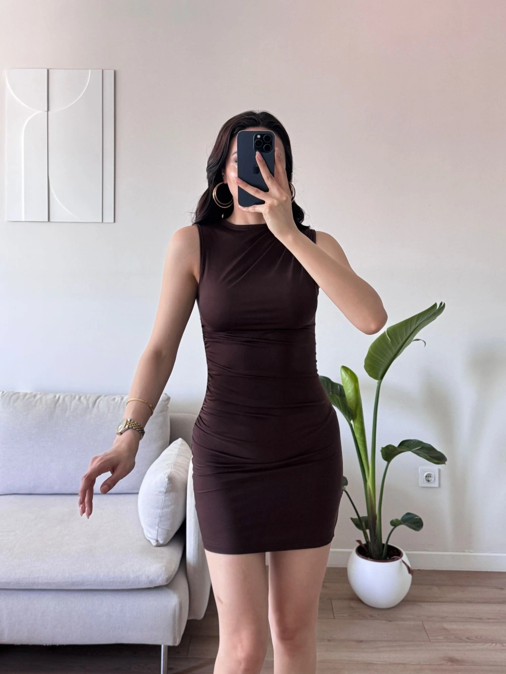 Drapeli Mini Elbise - KAHVE