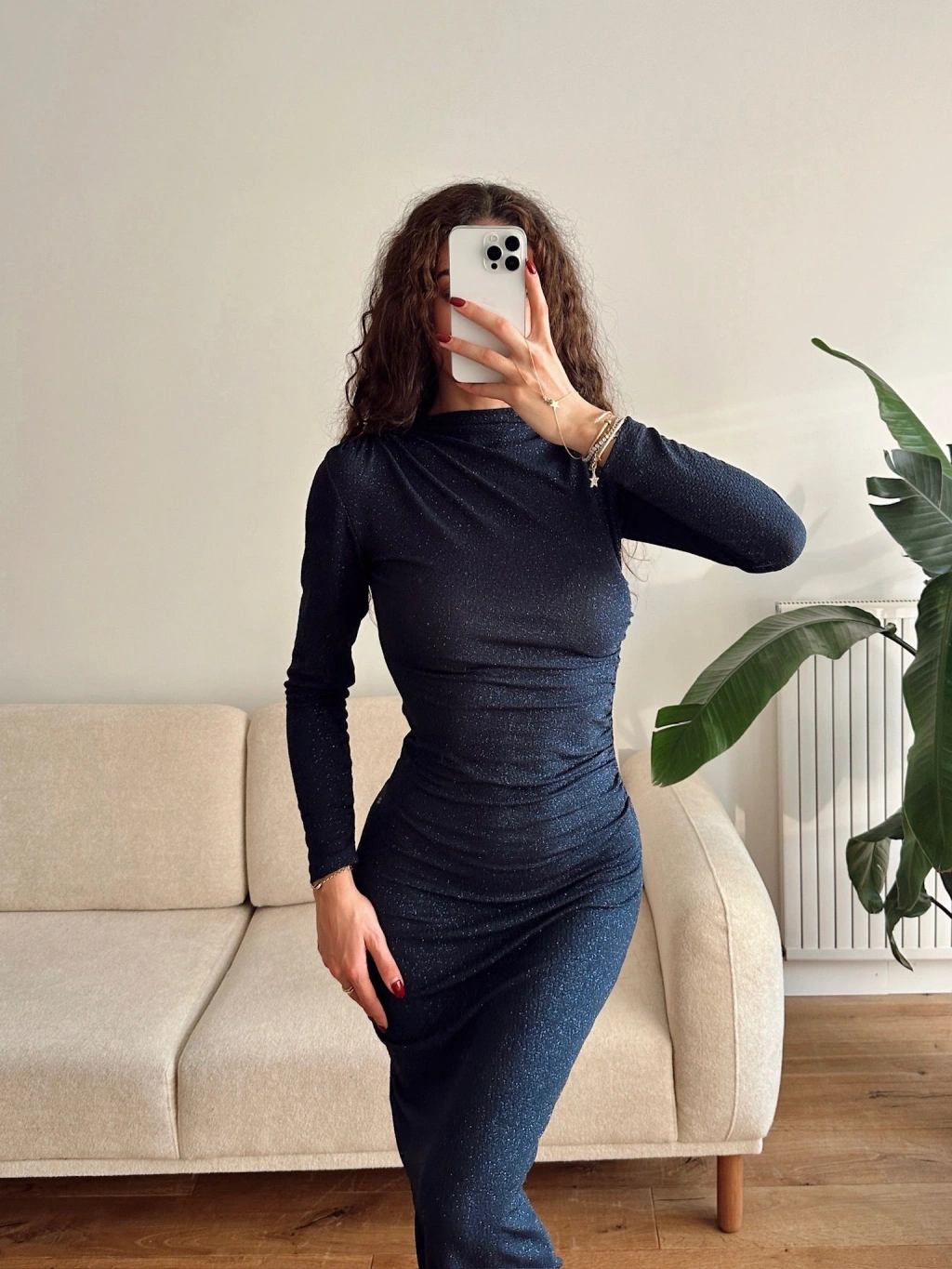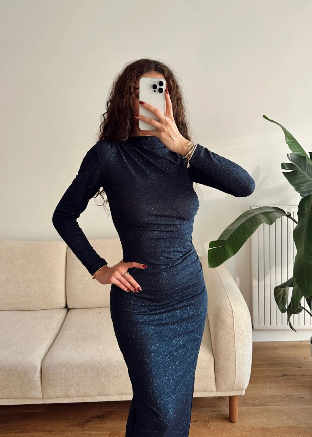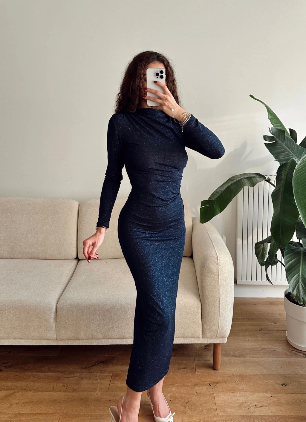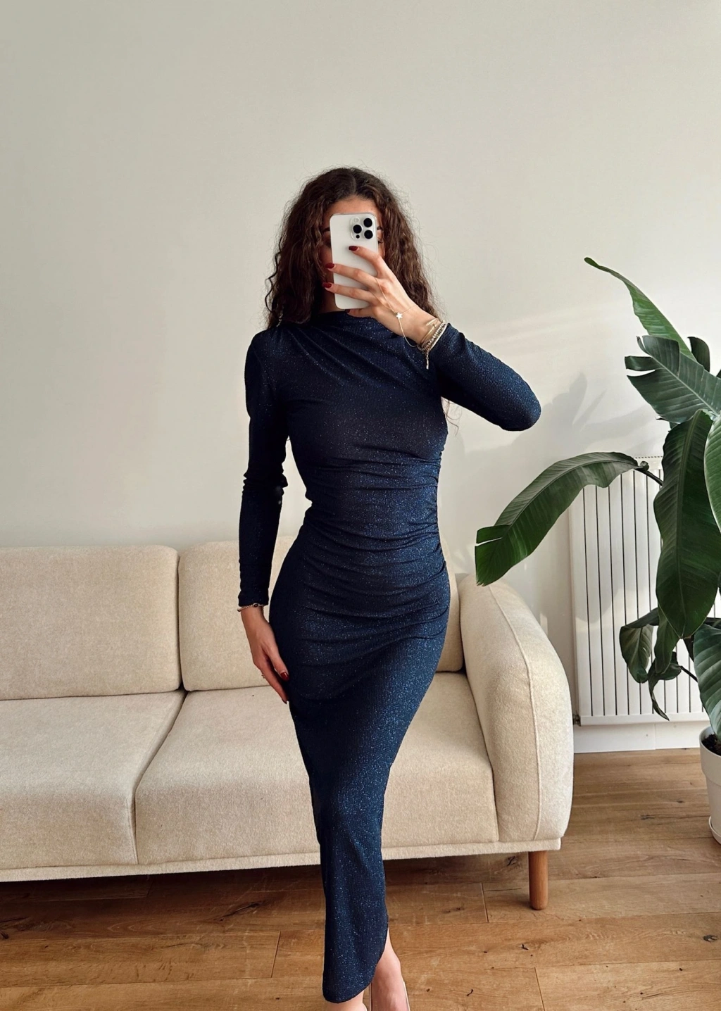 Drapeli Simli Long Elbise - LACİVERT
