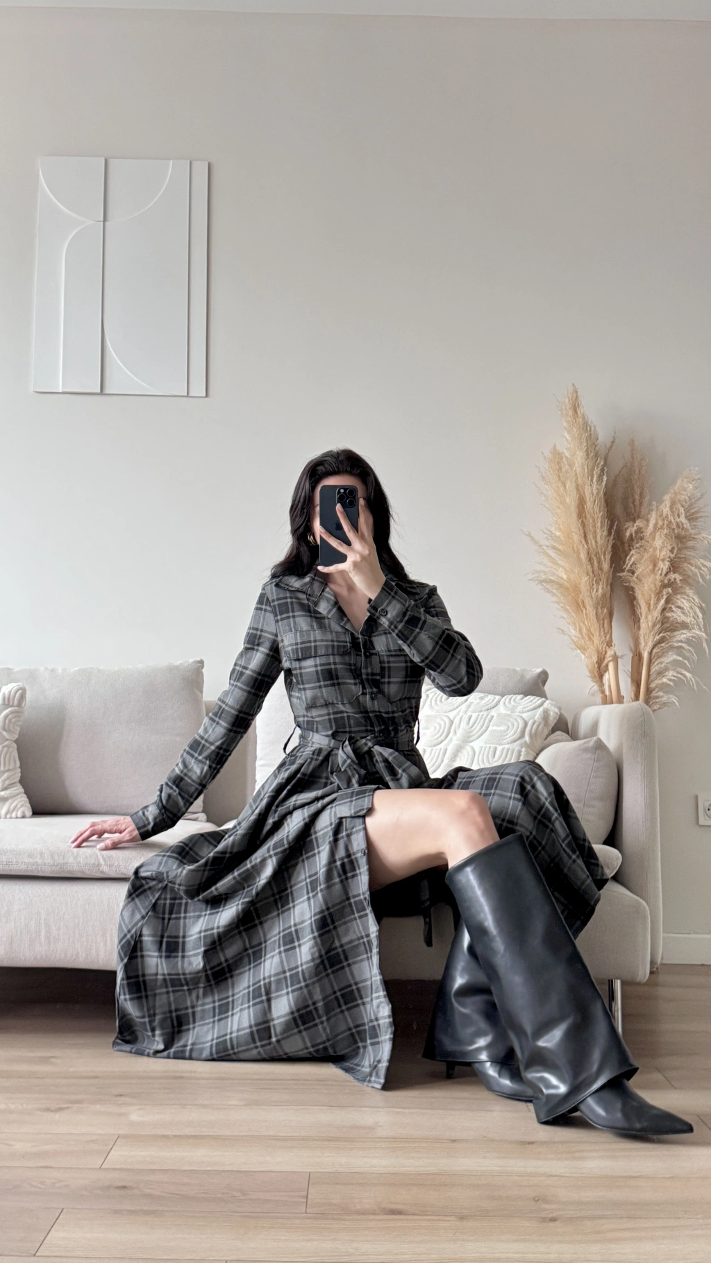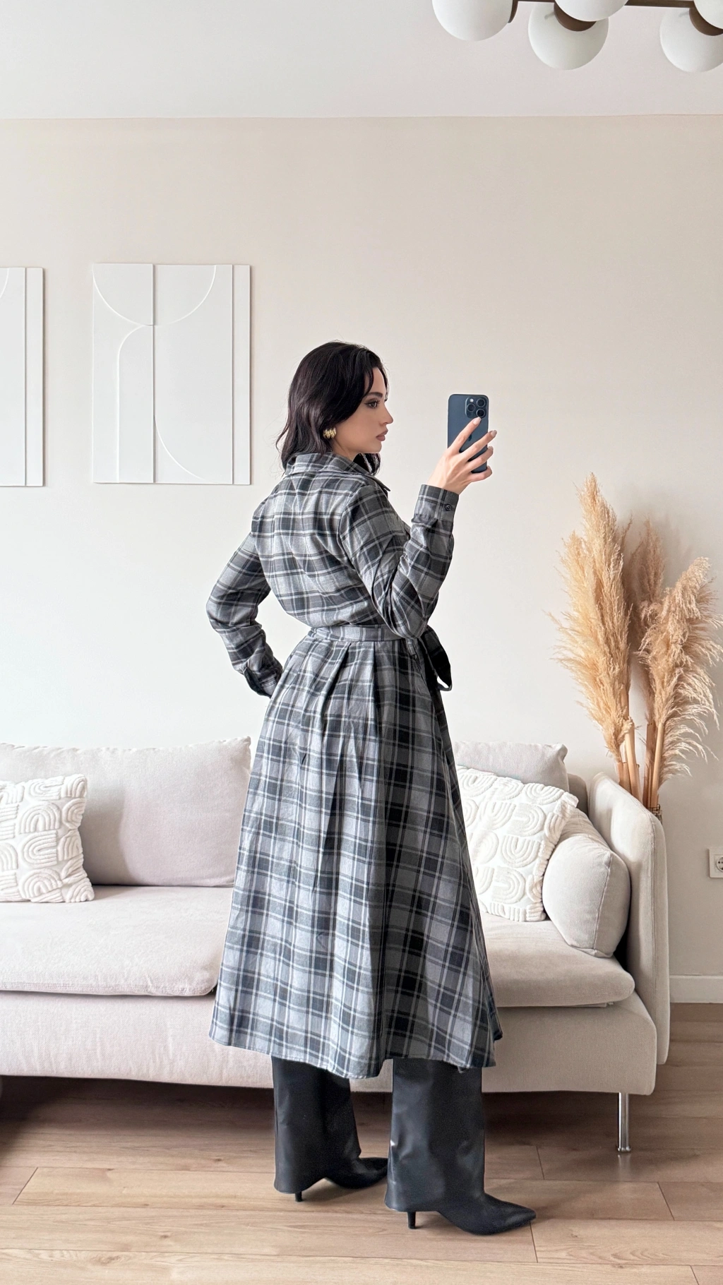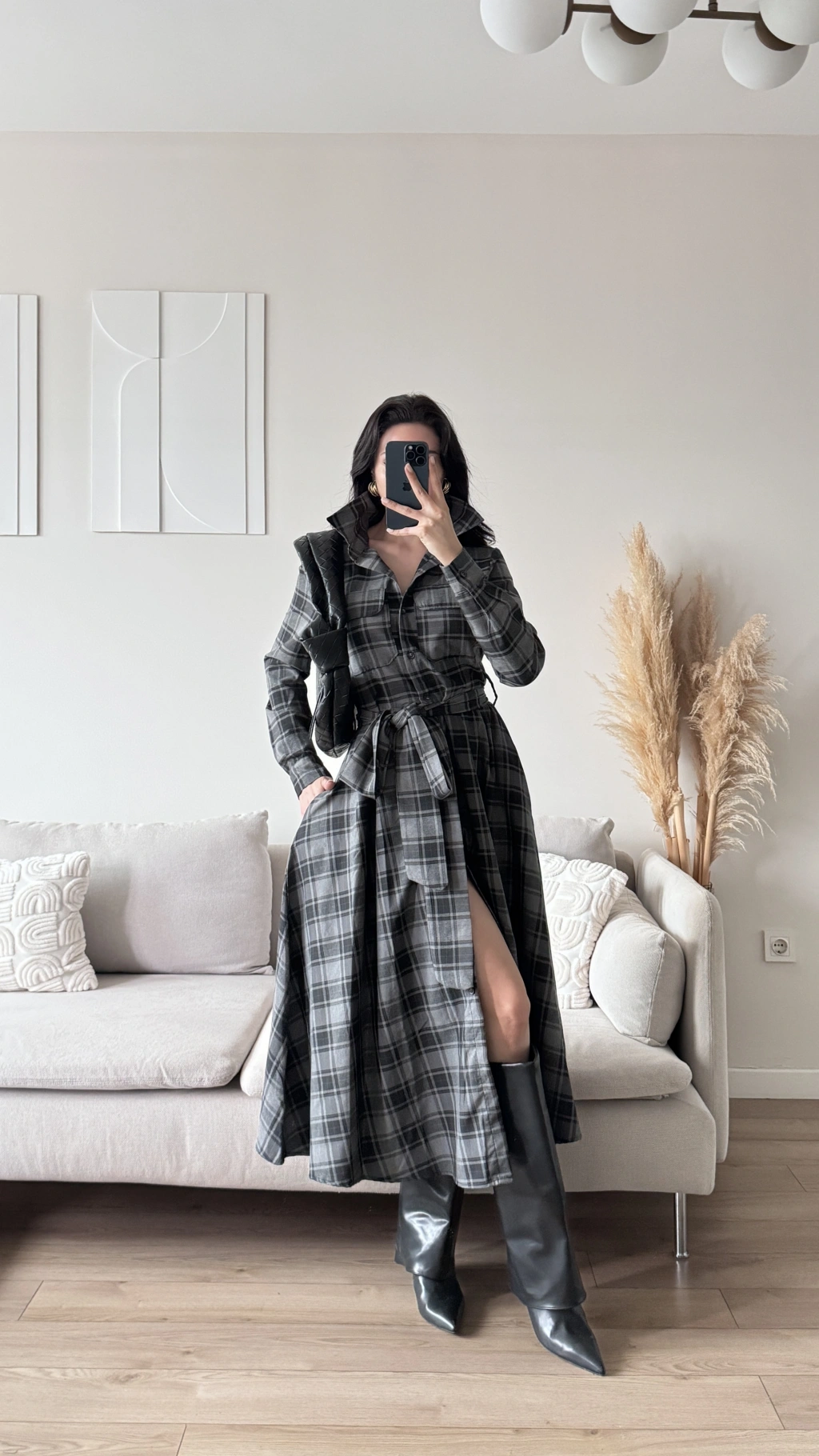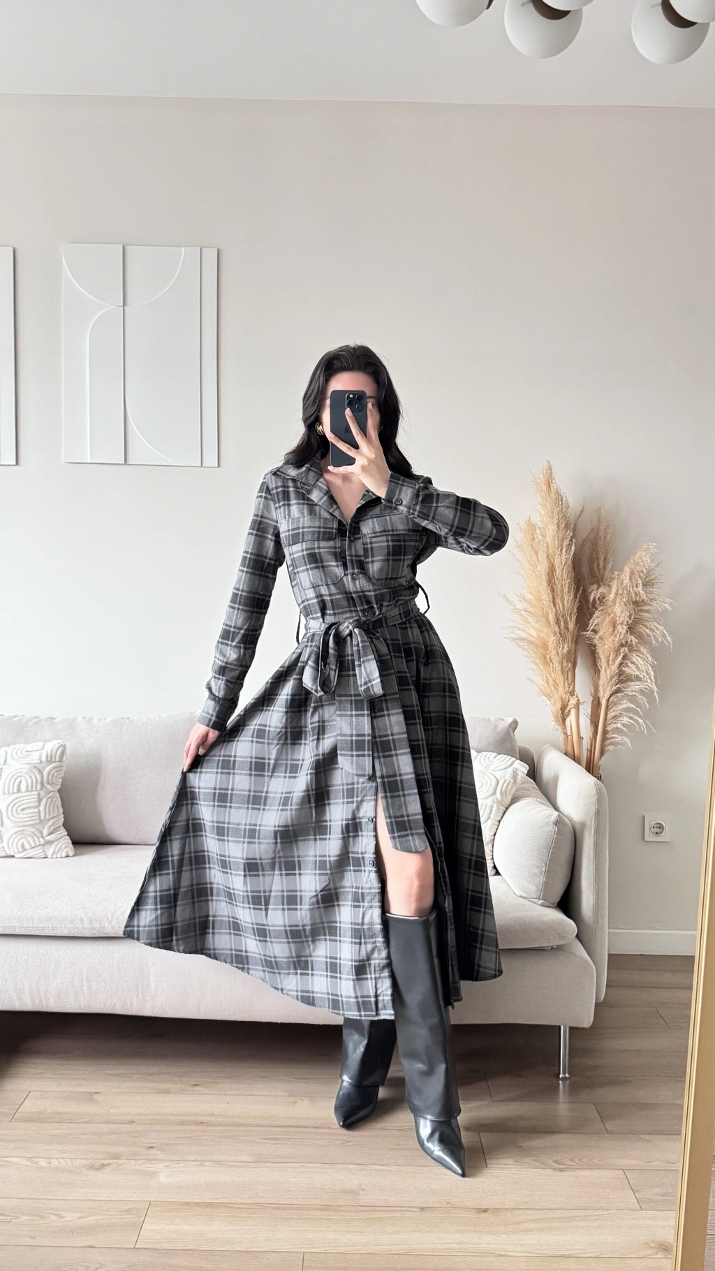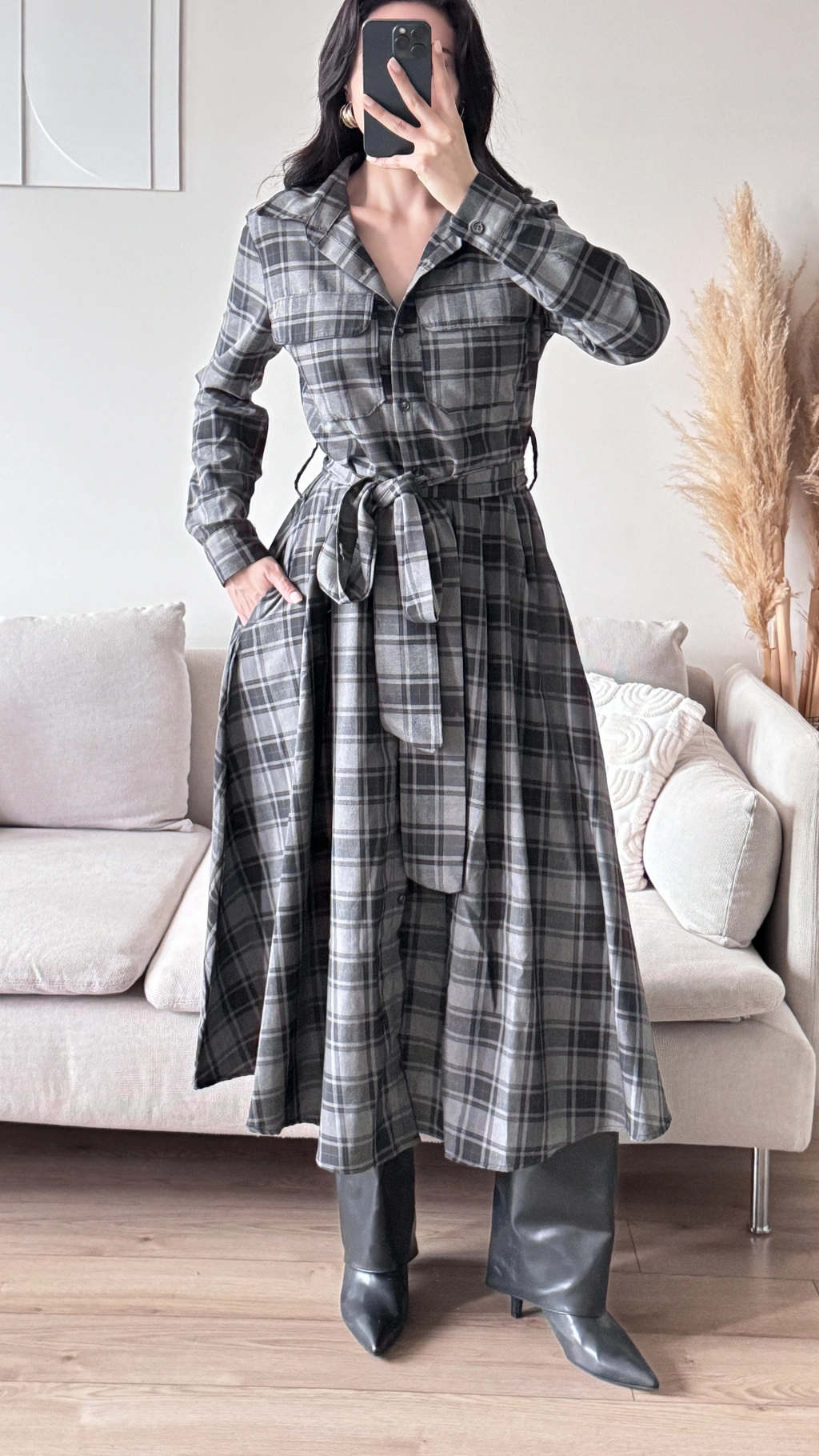 Ekose Kuşaklı Gömlek Elbise - GRİ