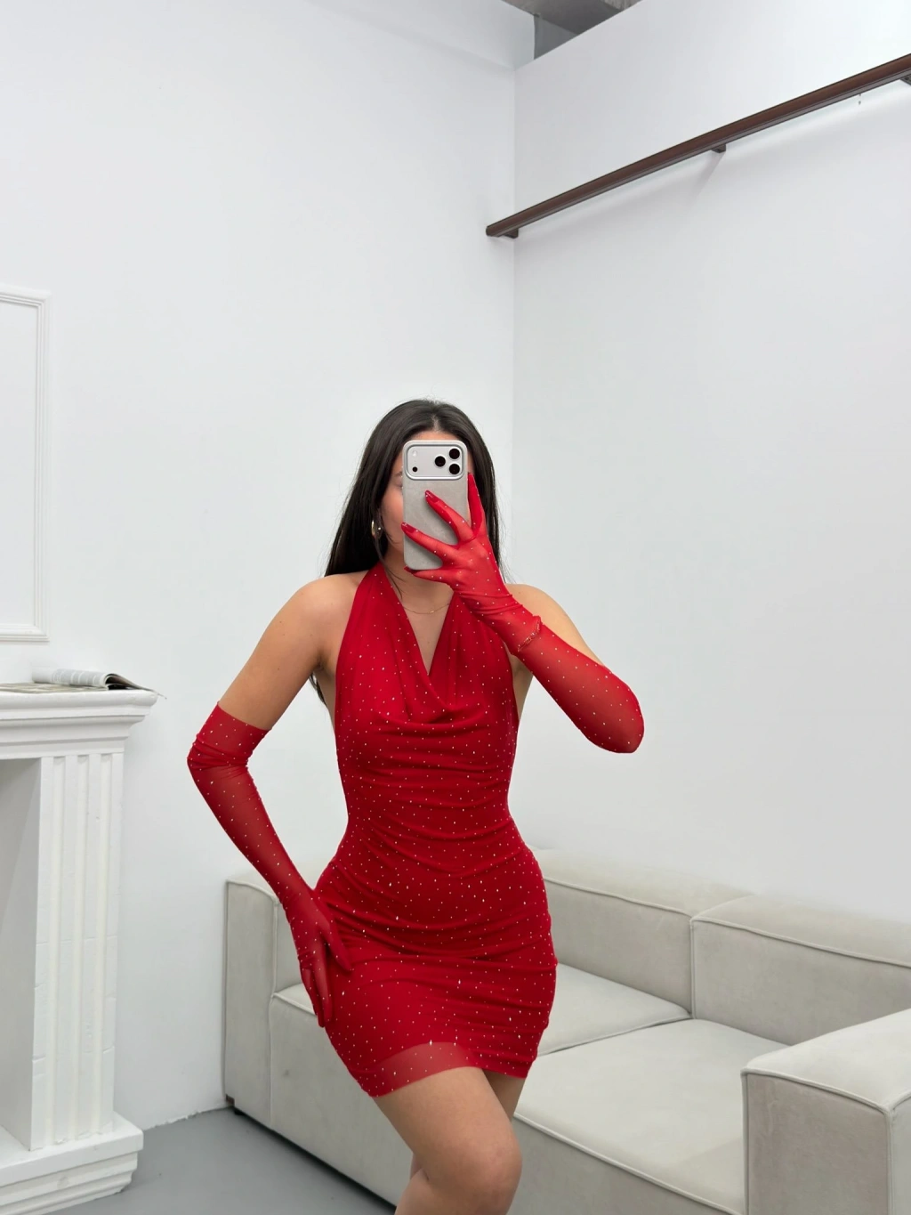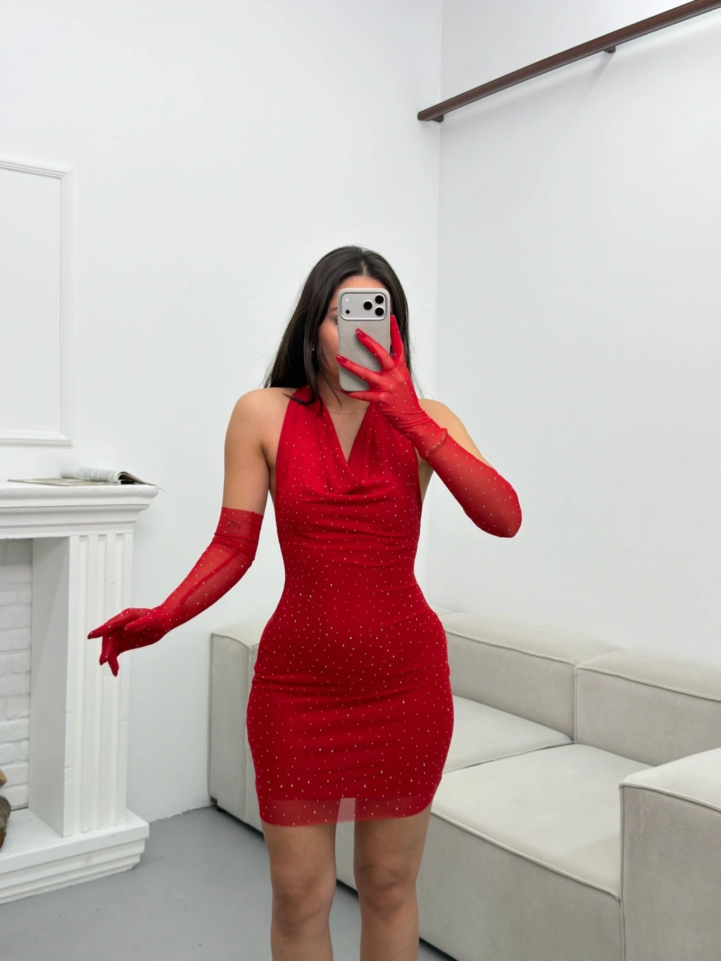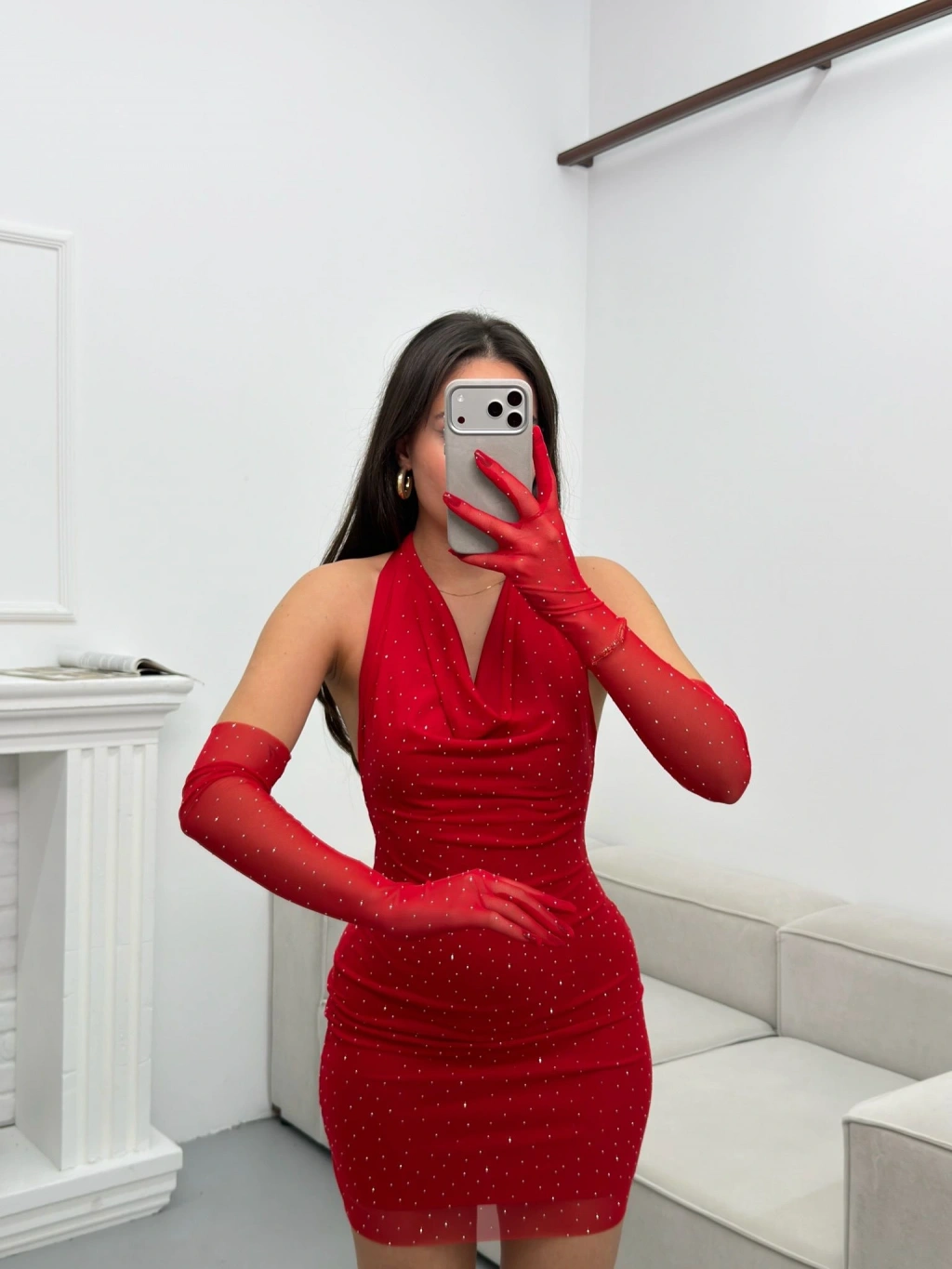 Eldivenli Taşlı Degaje Elbise - KIRMIZI