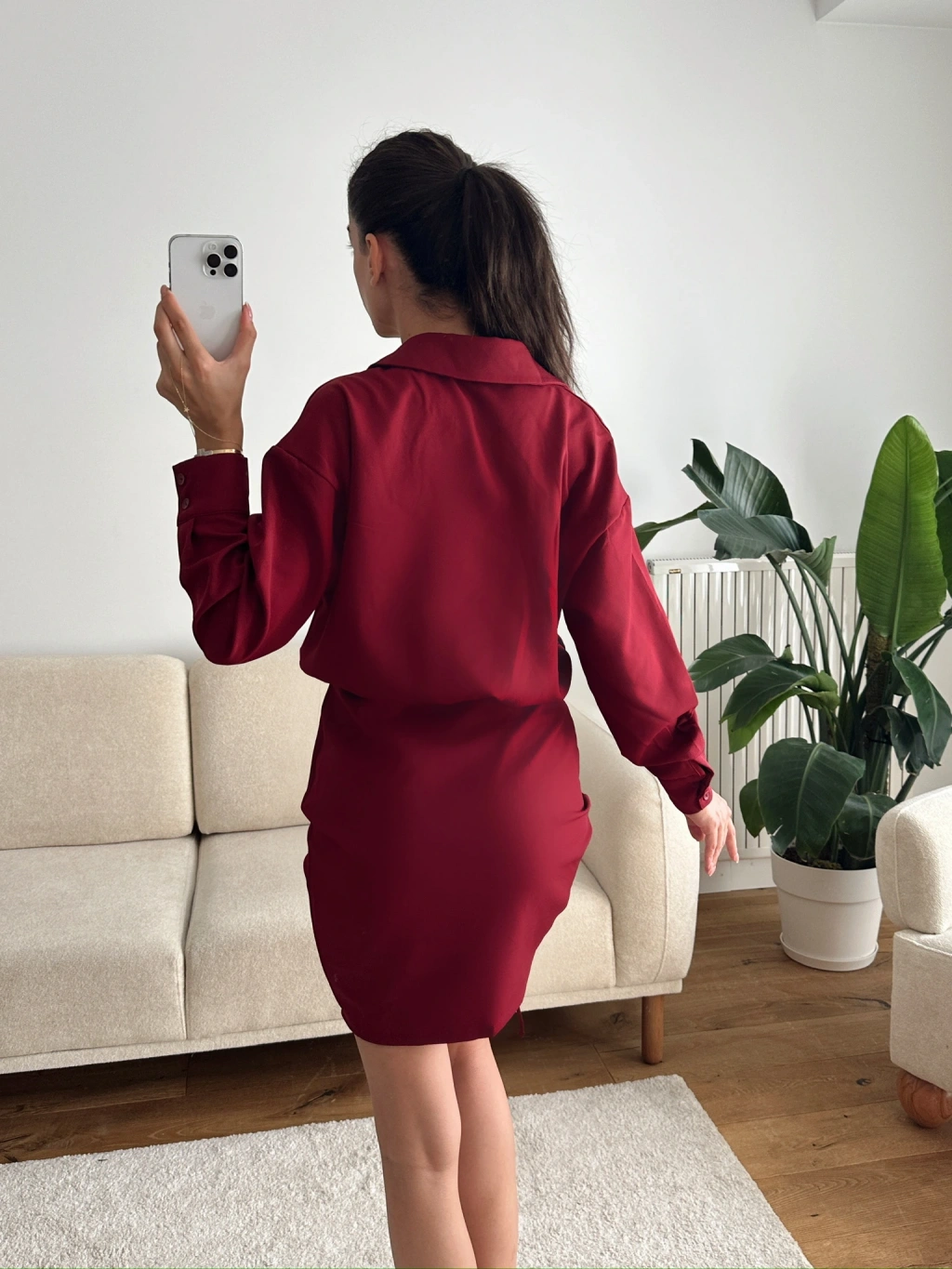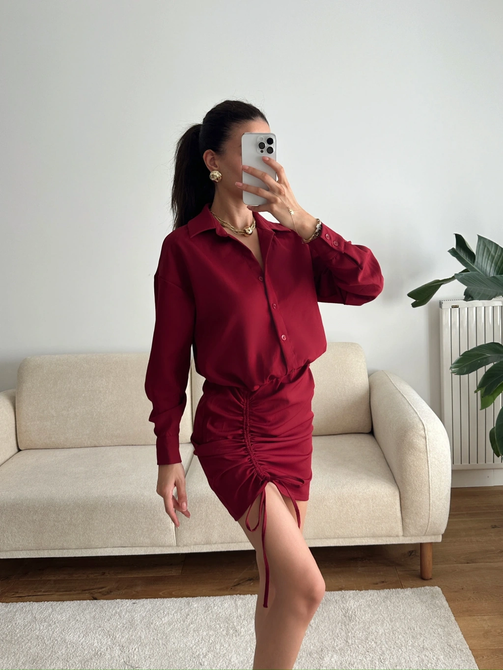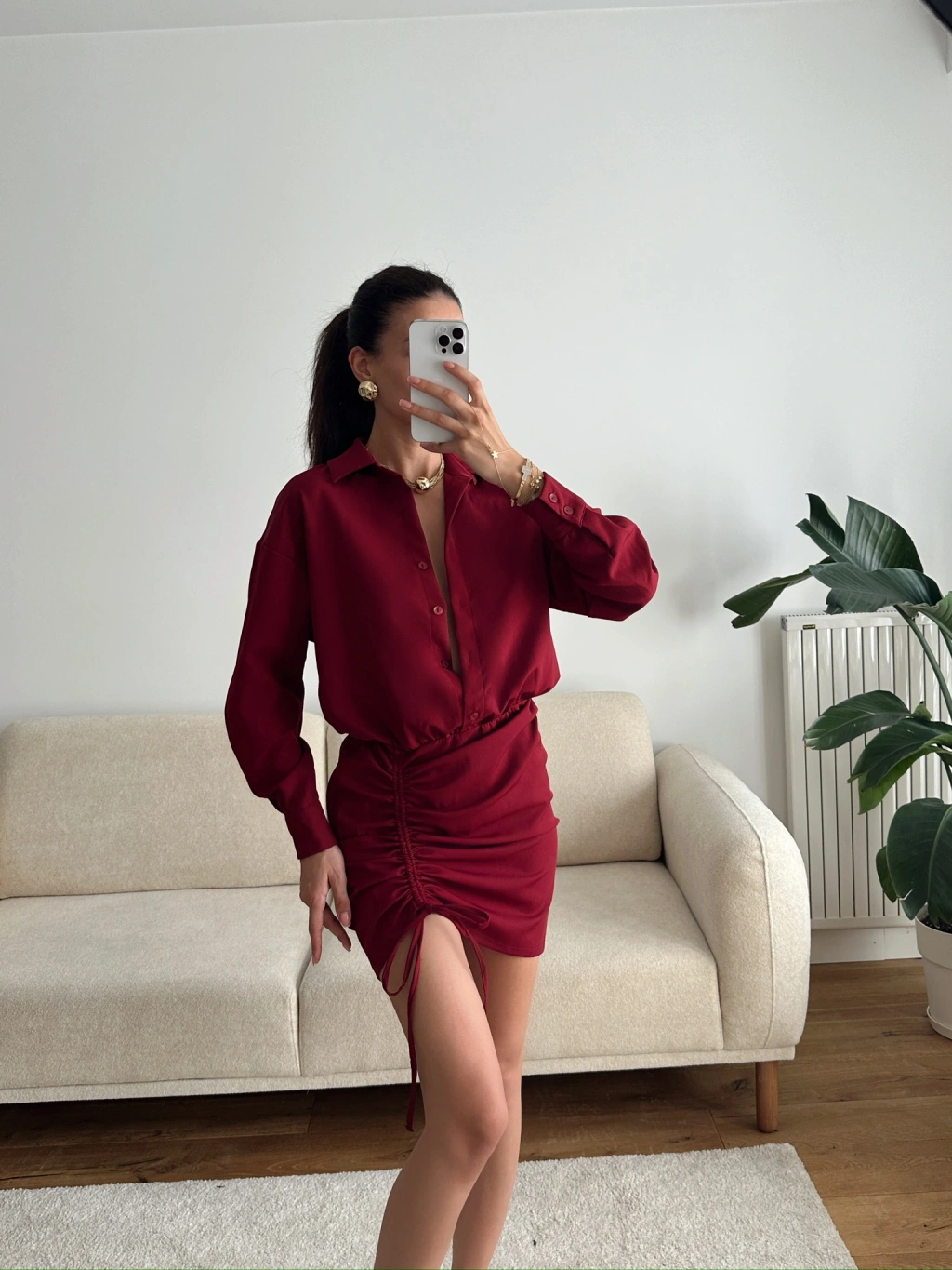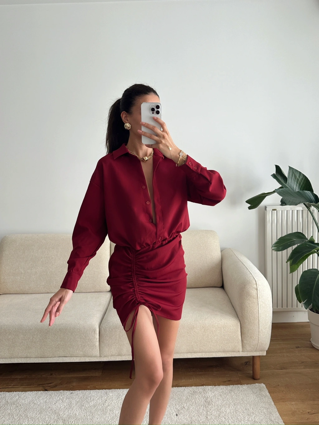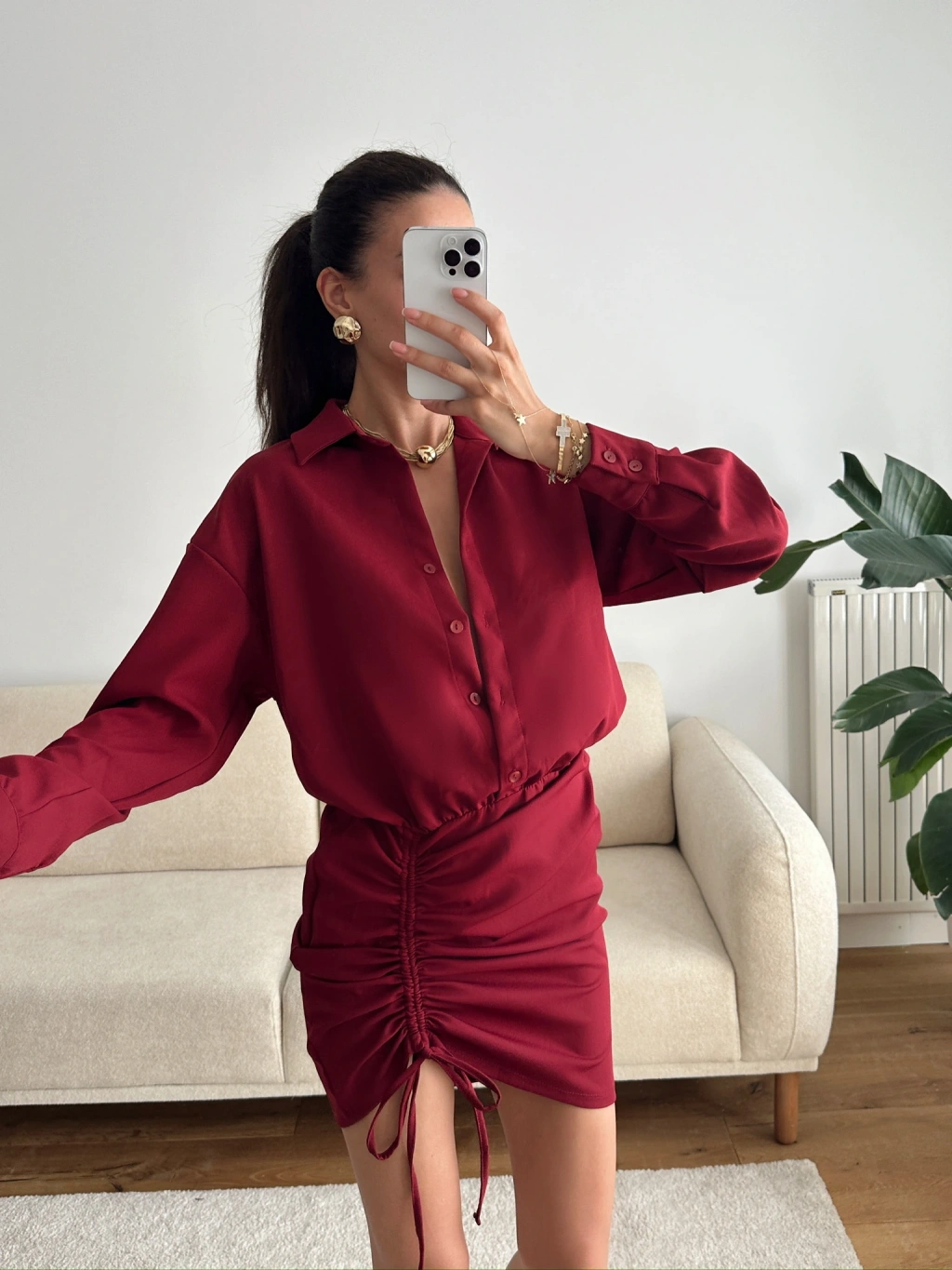 Eteği Büzgülü Gömlek Elbise - BORDO