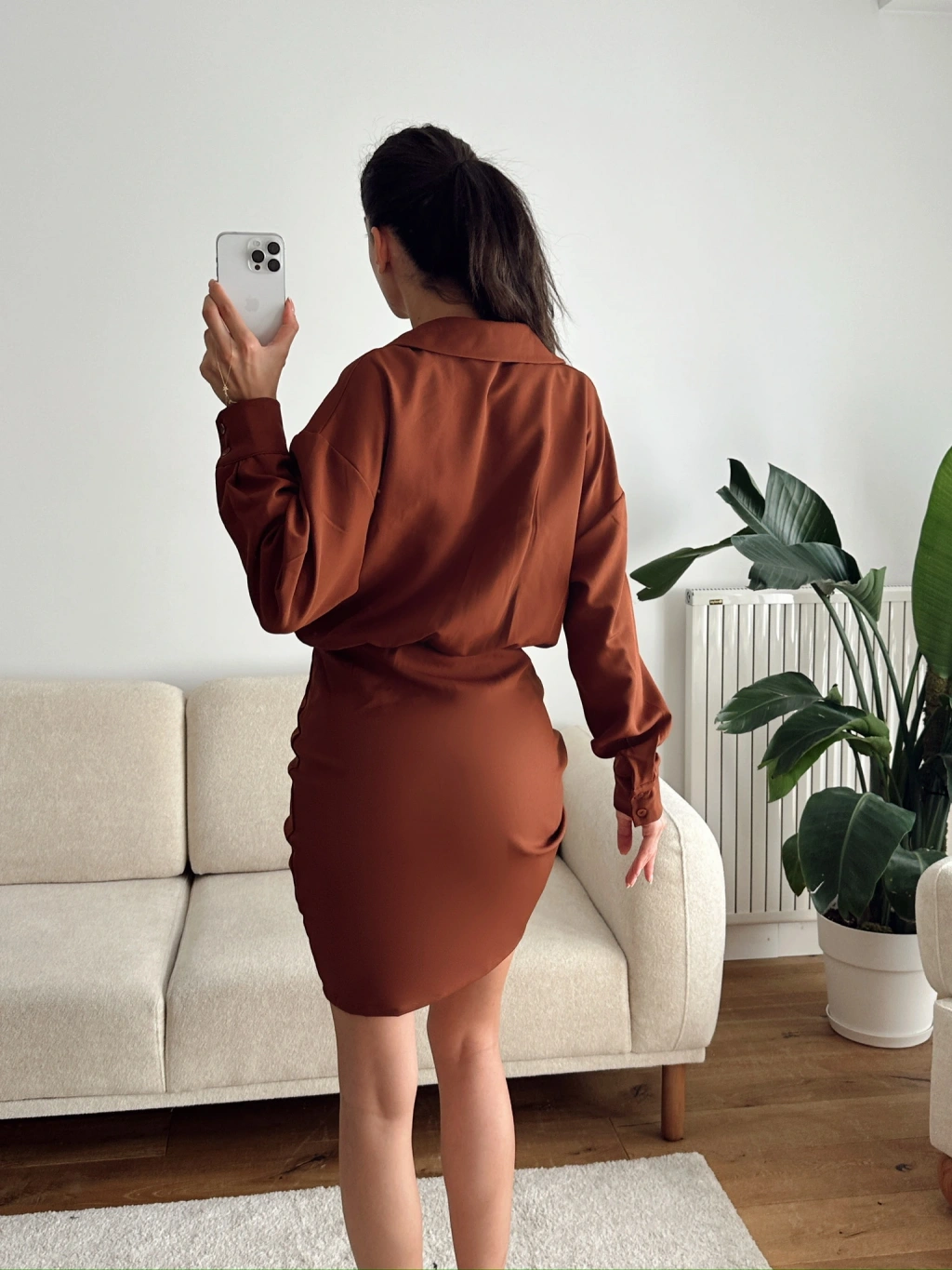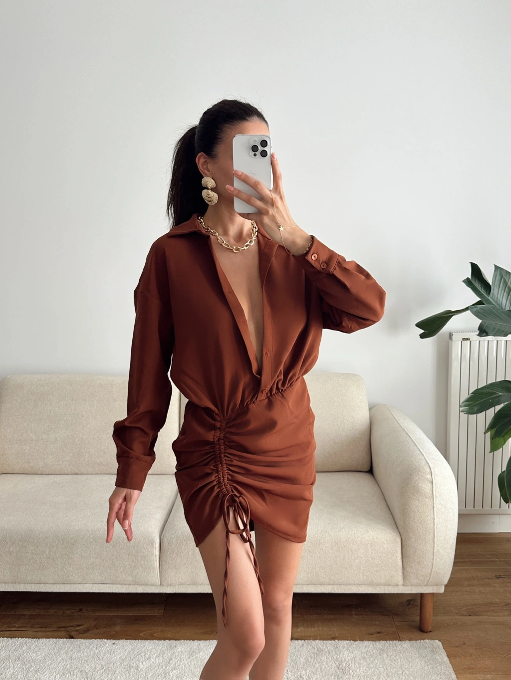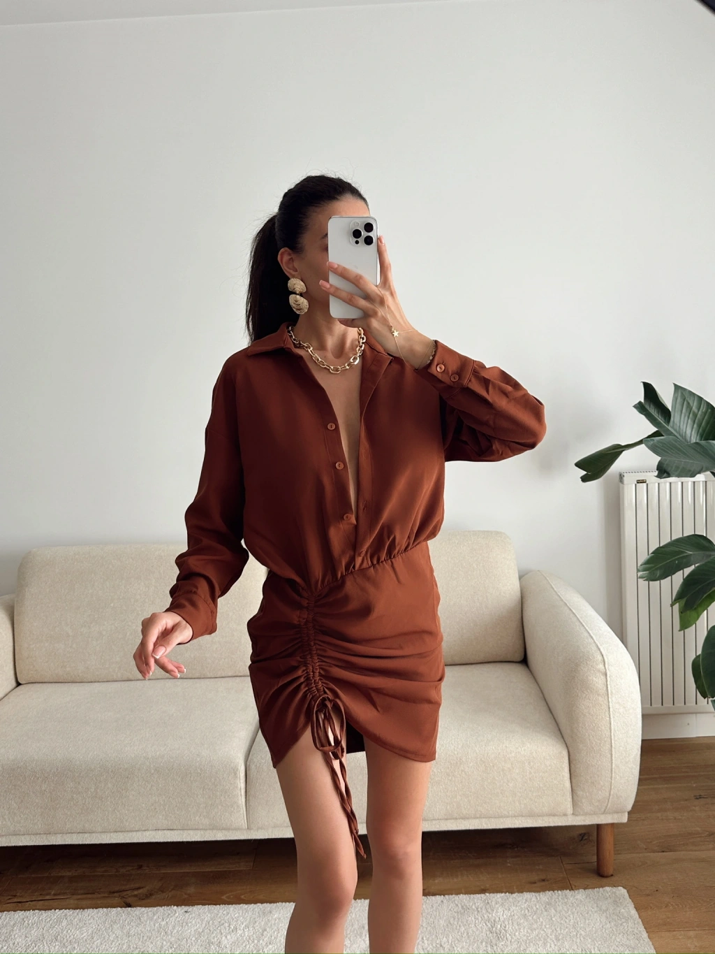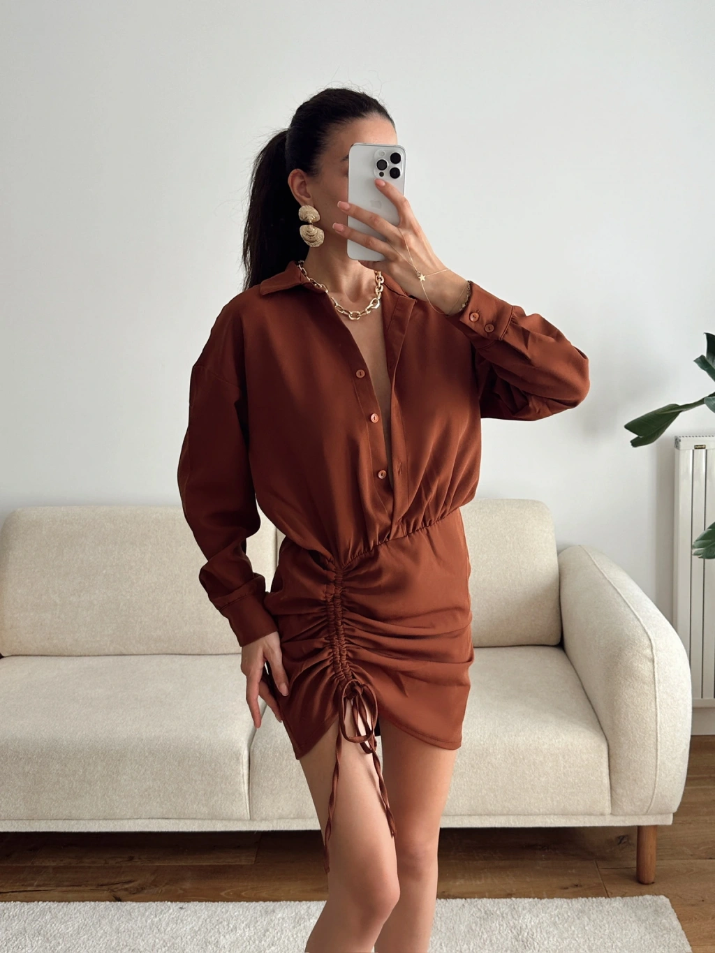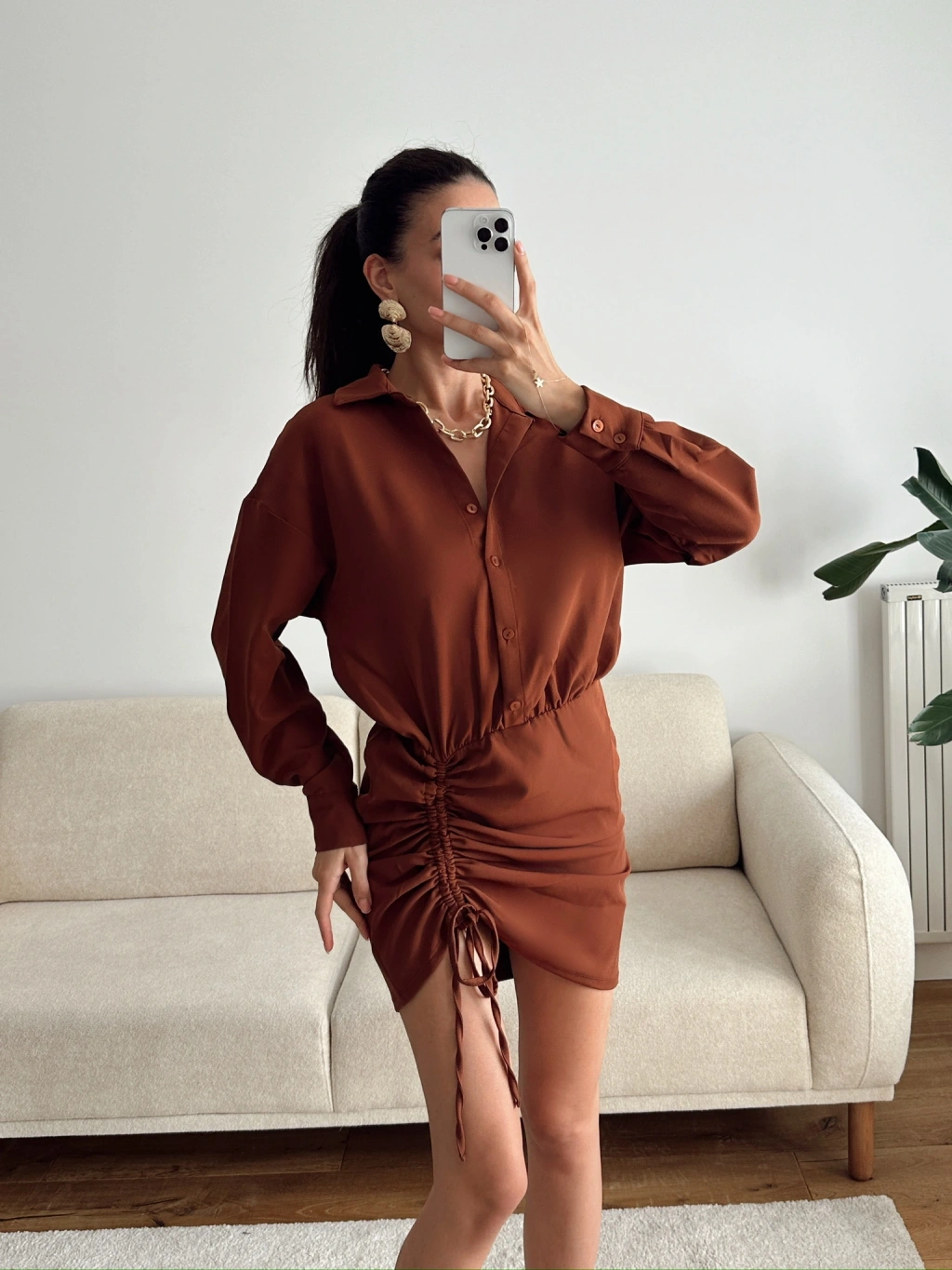 Eteği Büzgülü Gömlek Elbise - KAHVE