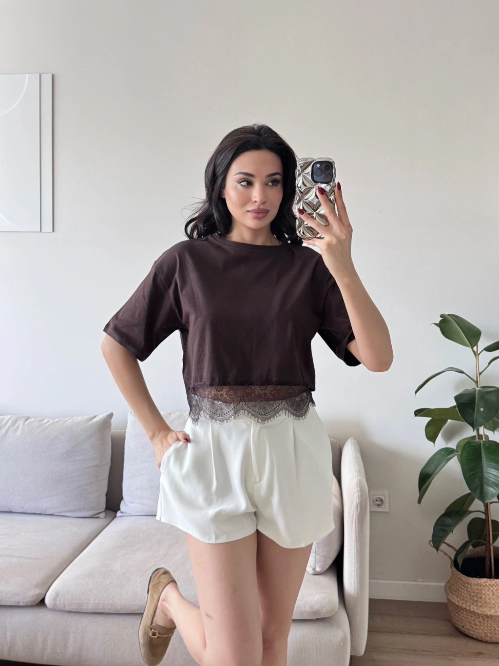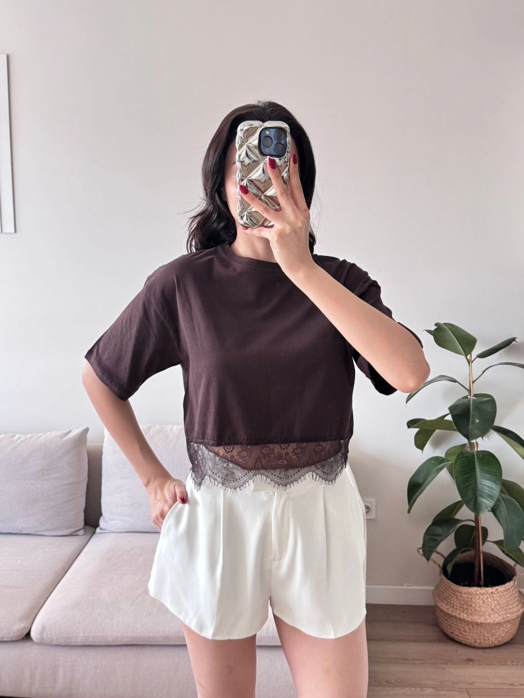 Eteği Dantel Crop T-shirt - KAHVE