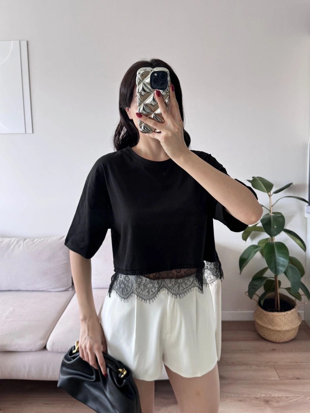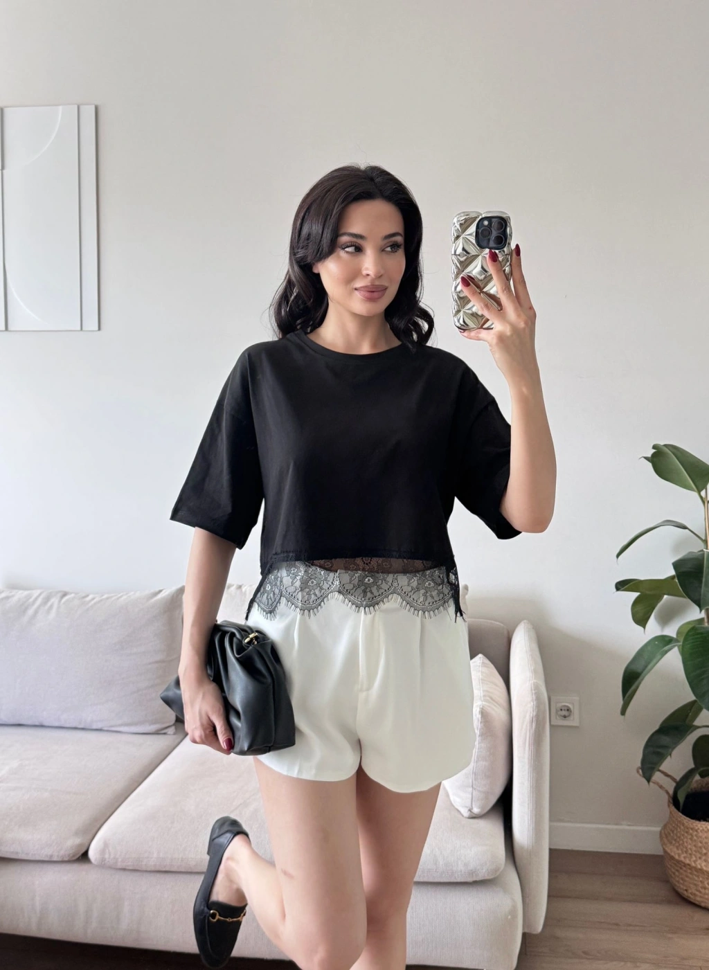Eteği Dantel Crop T-shirt - SİYAH
