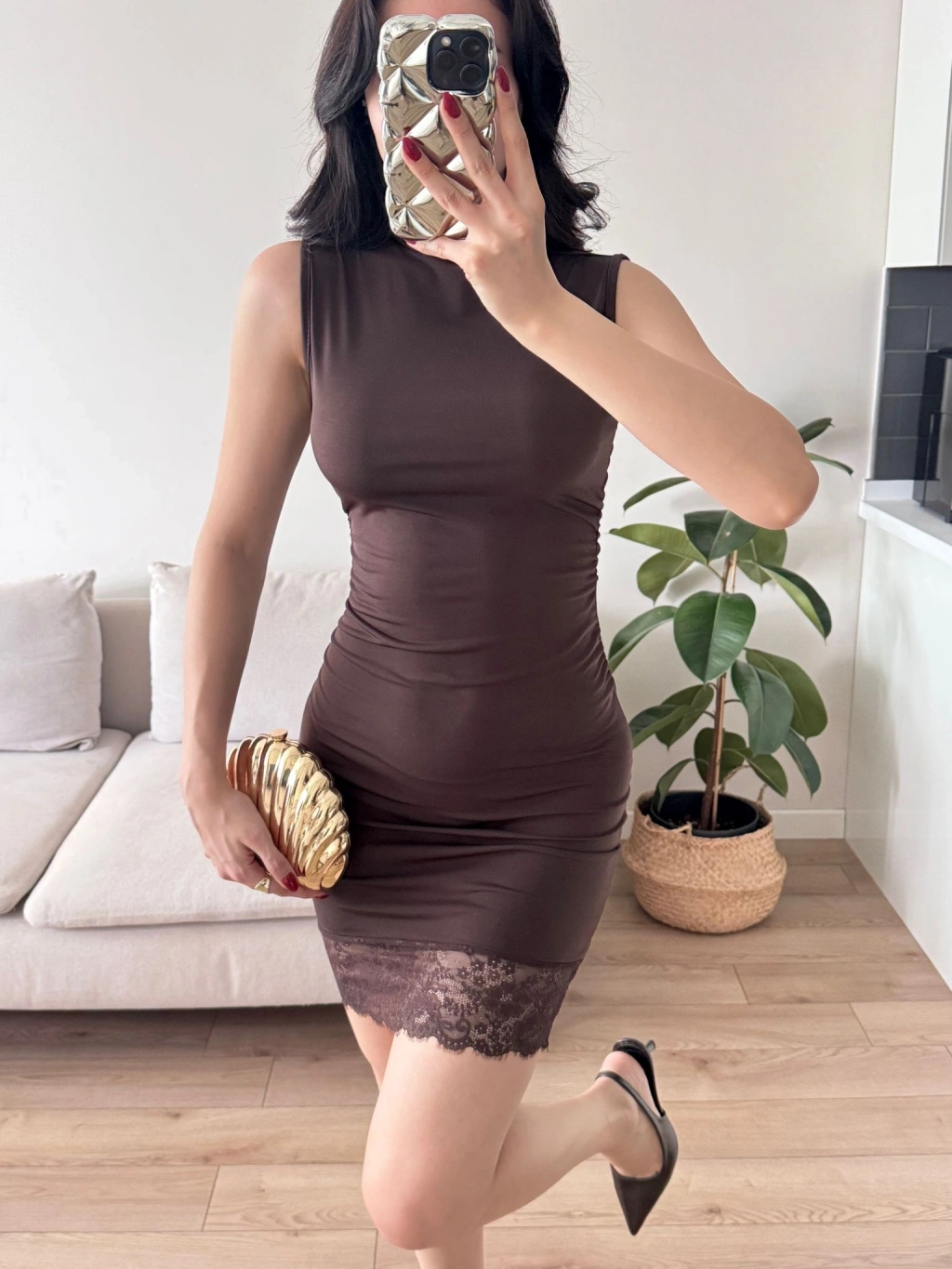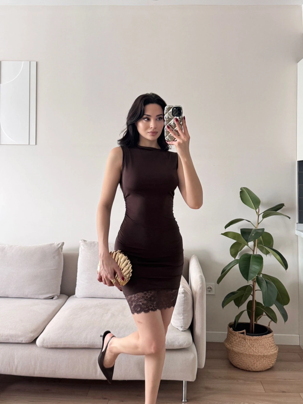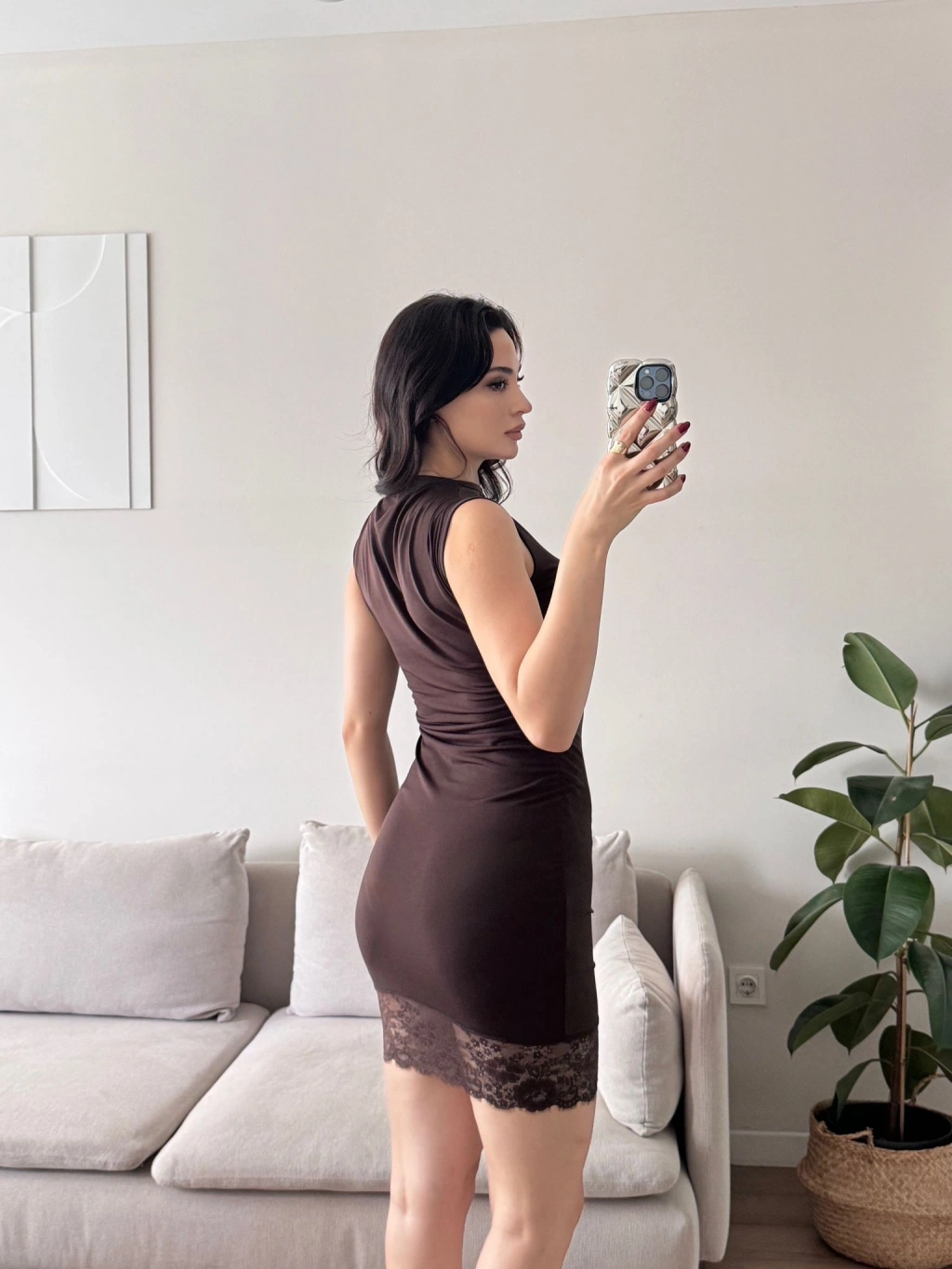 Eteği Dantel Yan Büzgü Elbise - KAHVE