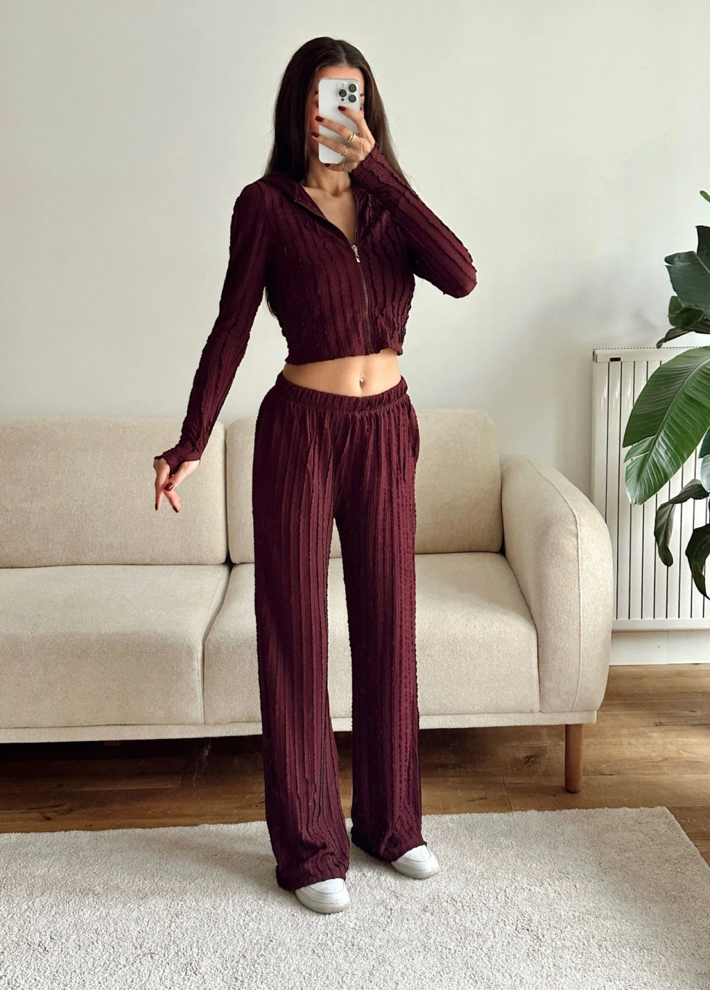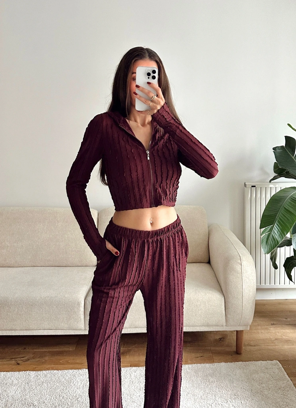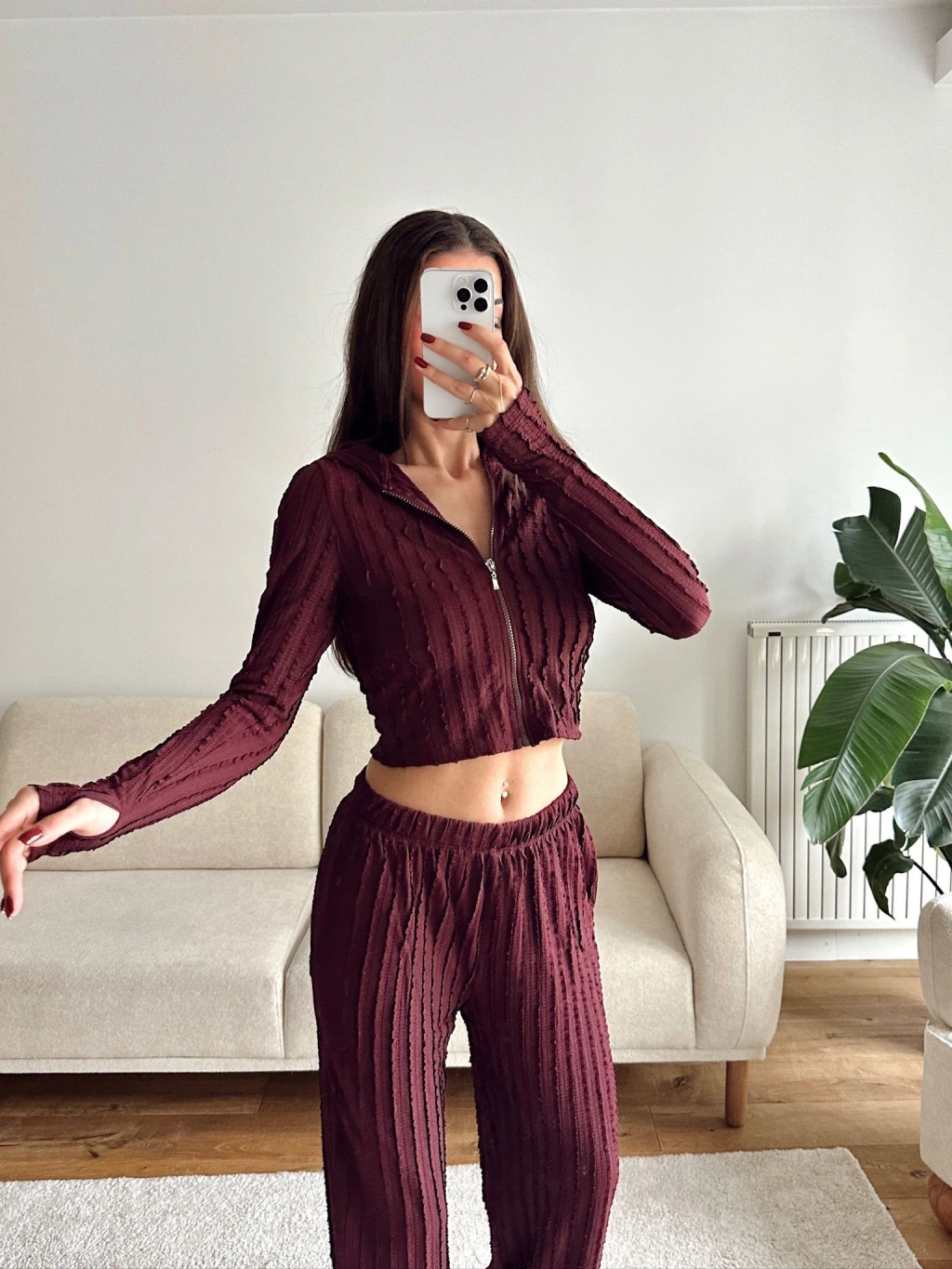 Fitilli Kapüşonlu Crop & Pantolon Takım - BORDO