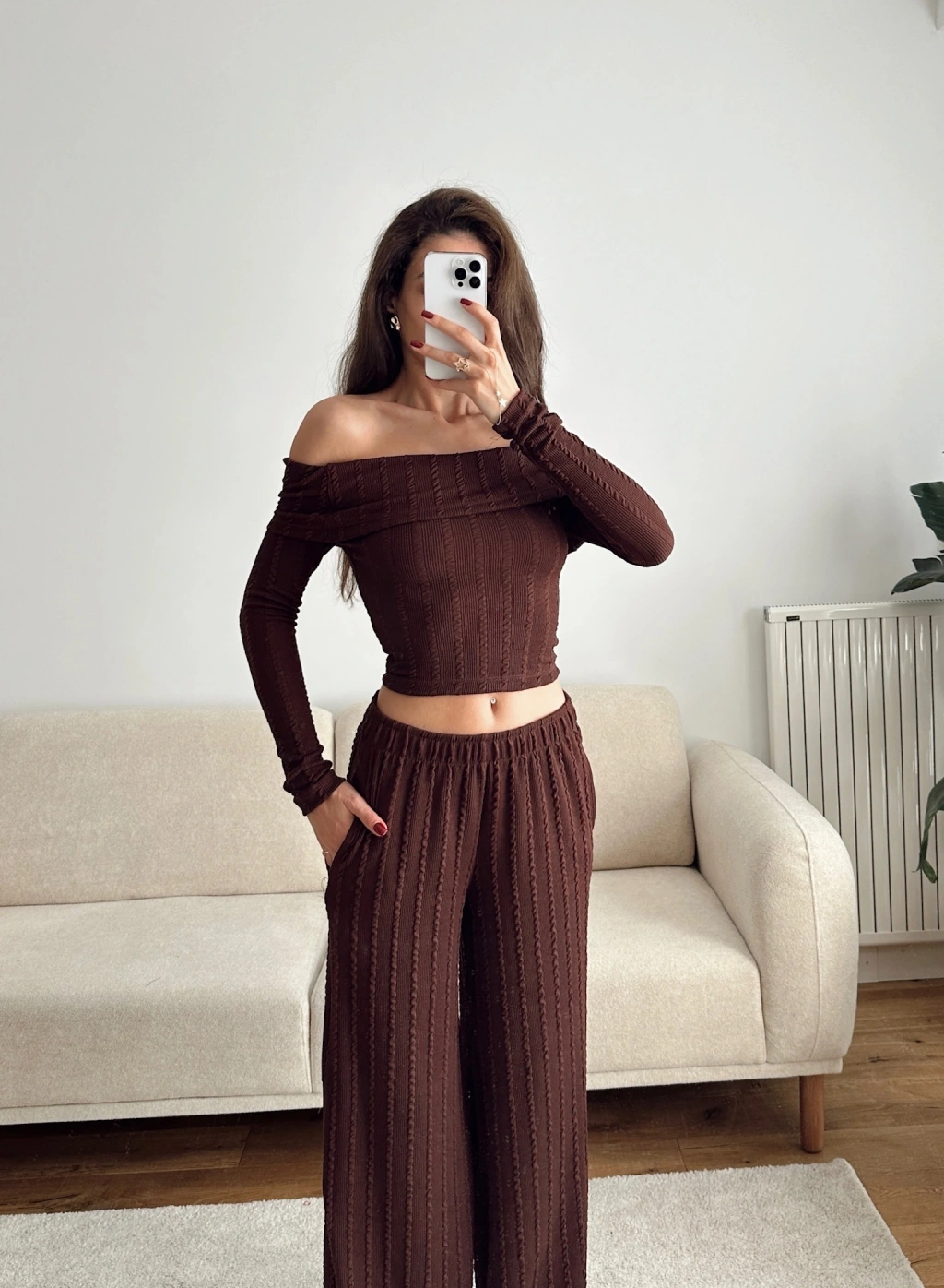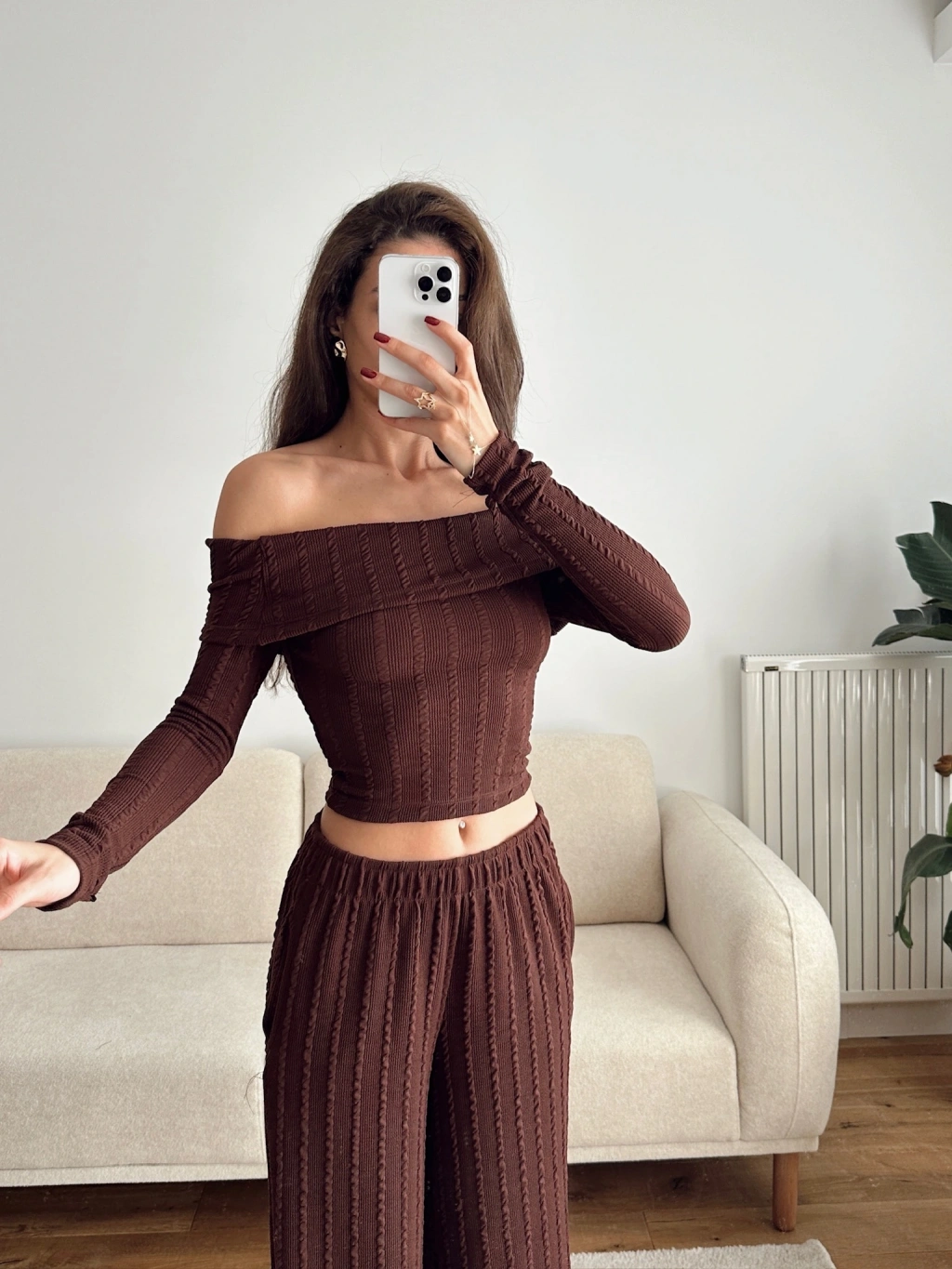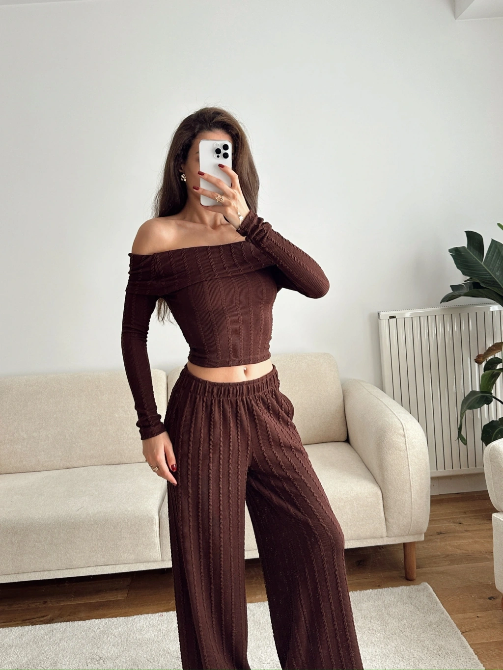 Fitilli Madonna Crop & Pantolon Takım - KAHVE