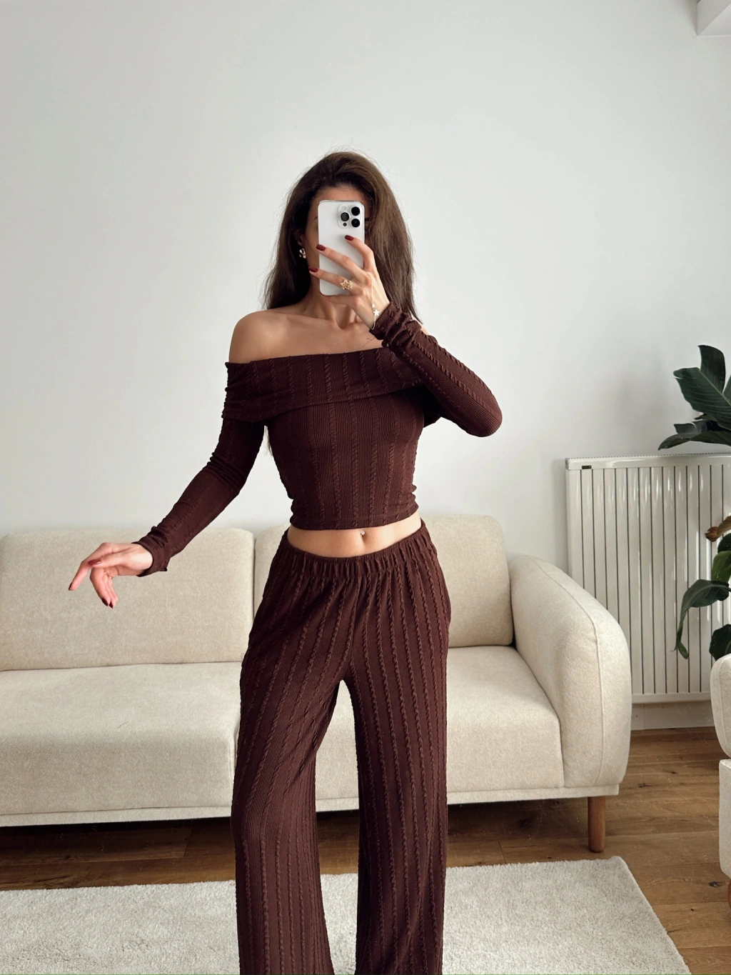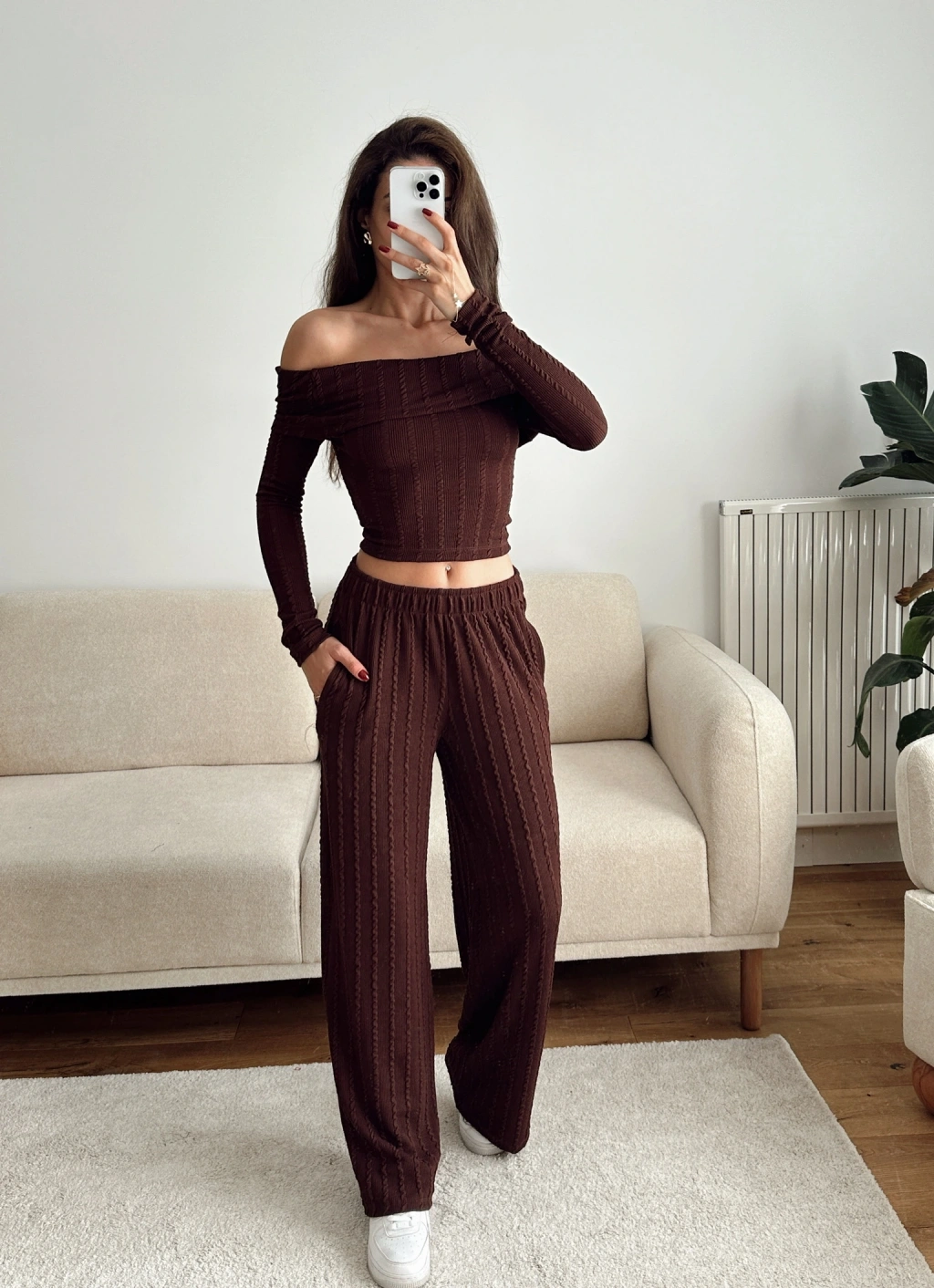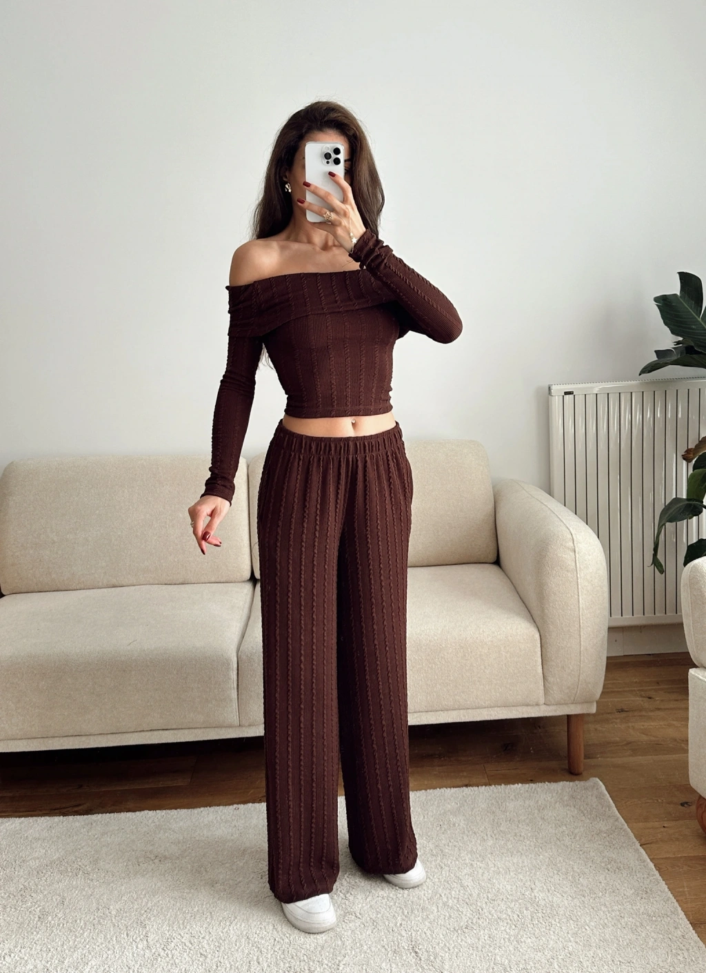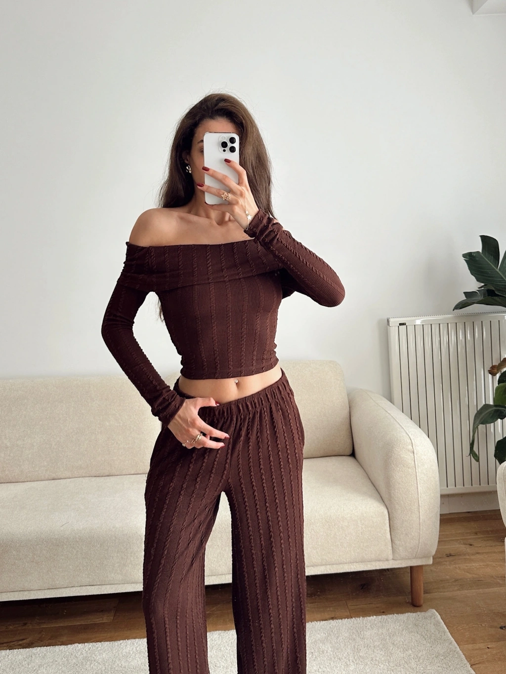 Fitilli Madonna Crop & Pantolon Takım - KAHVE