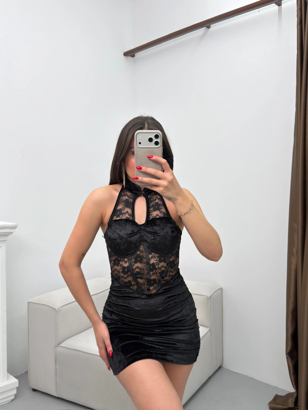 Göğüs Damla Dantel Detay Elbise - SİYAH