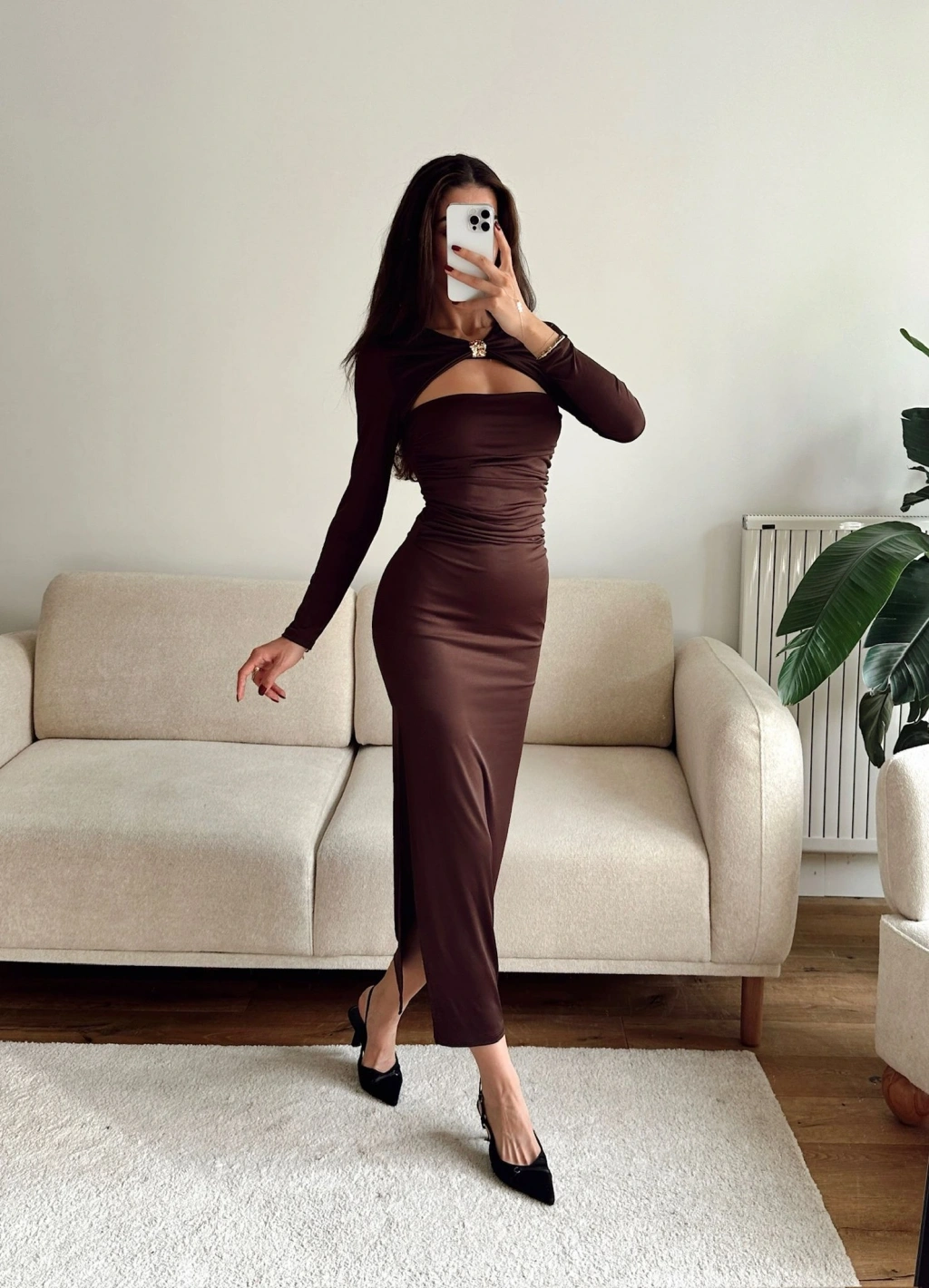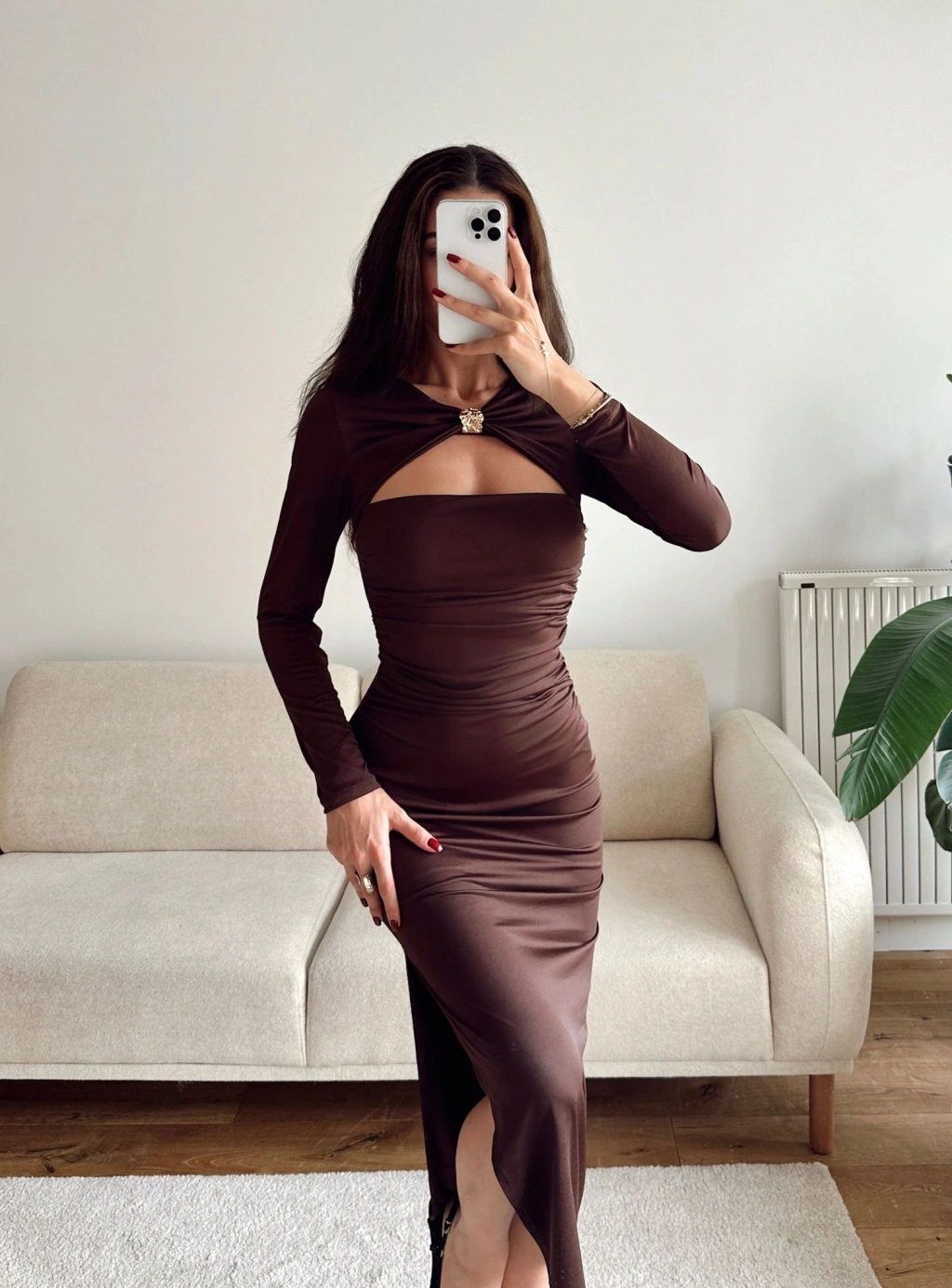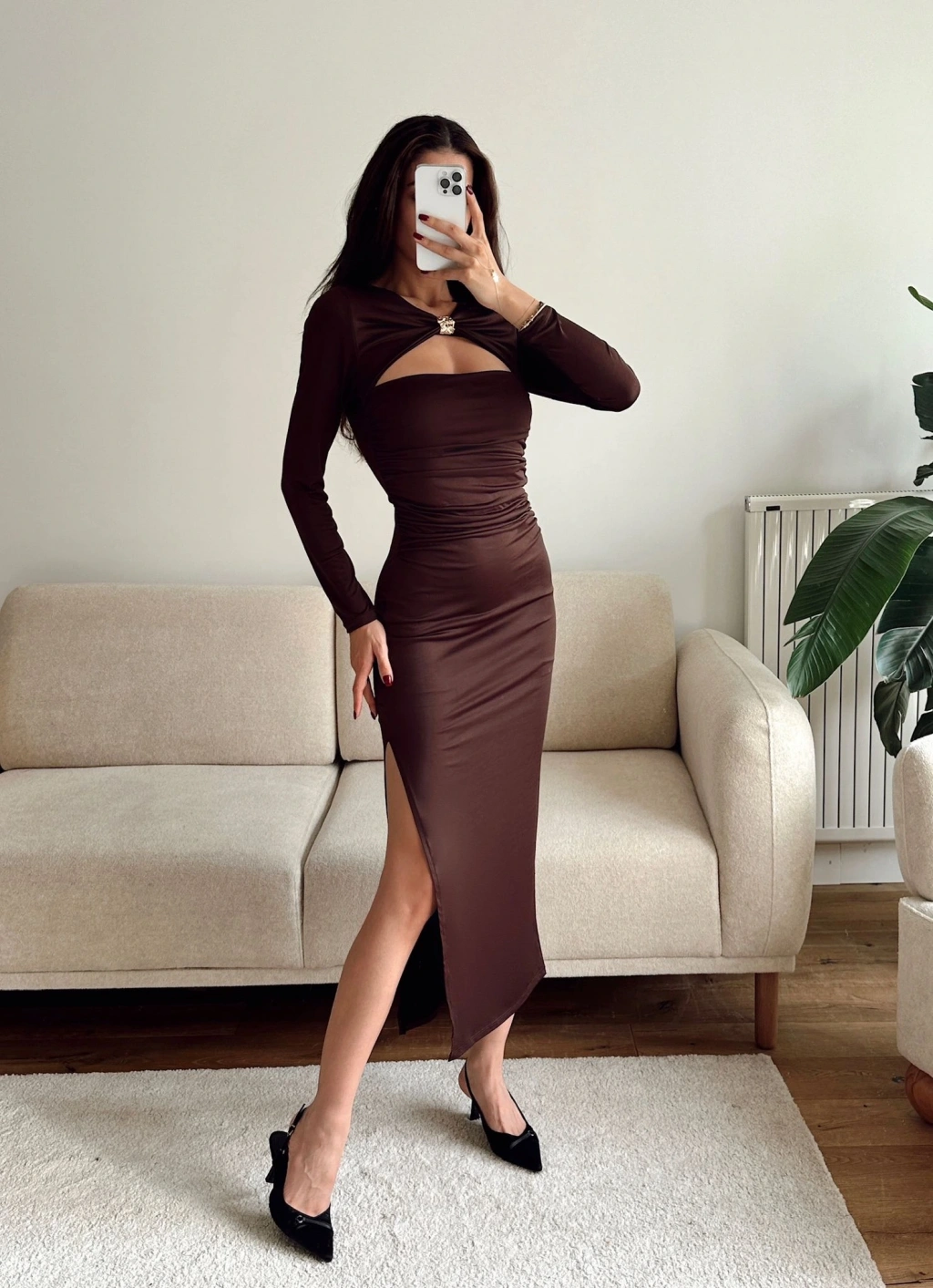 Göğüs Pencere Yırtmaçlı Elbise - KAHVE