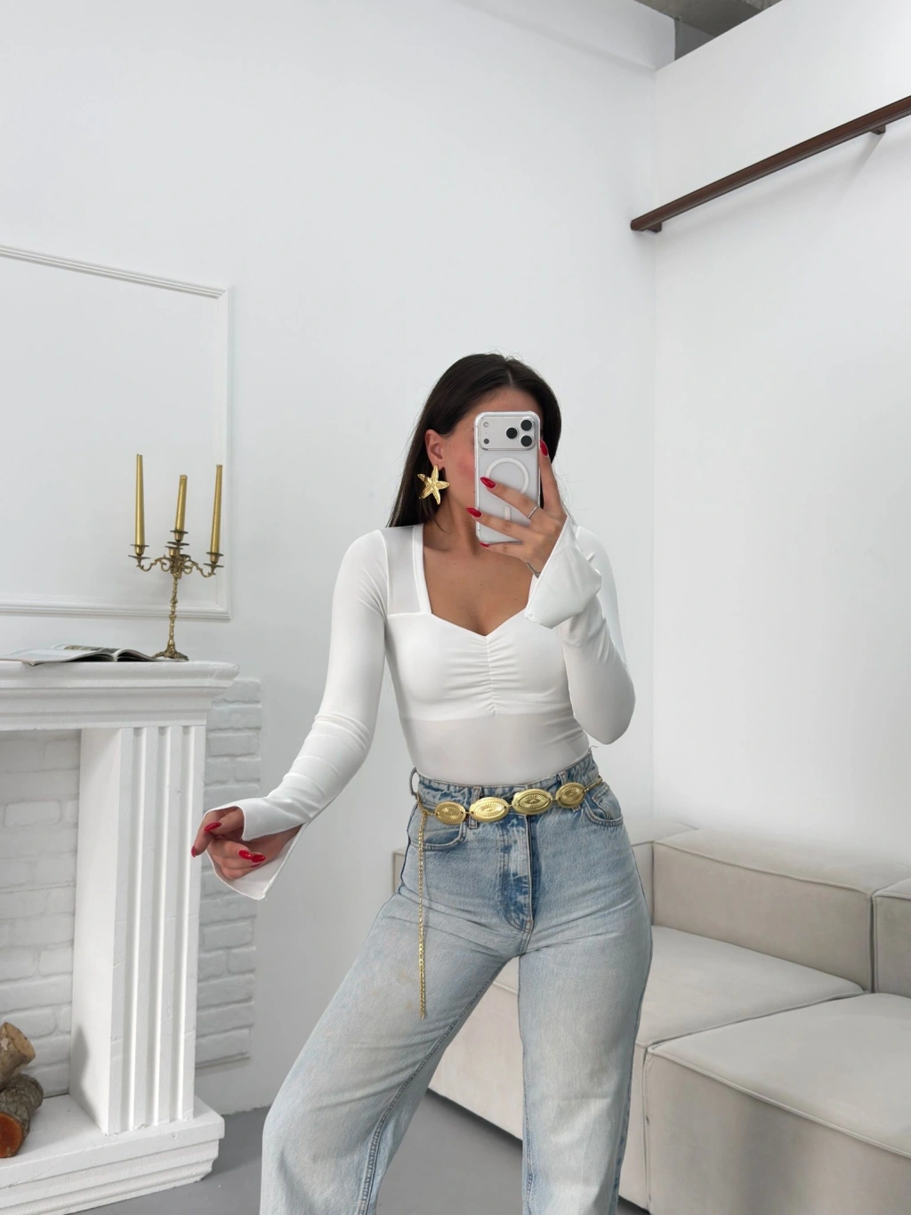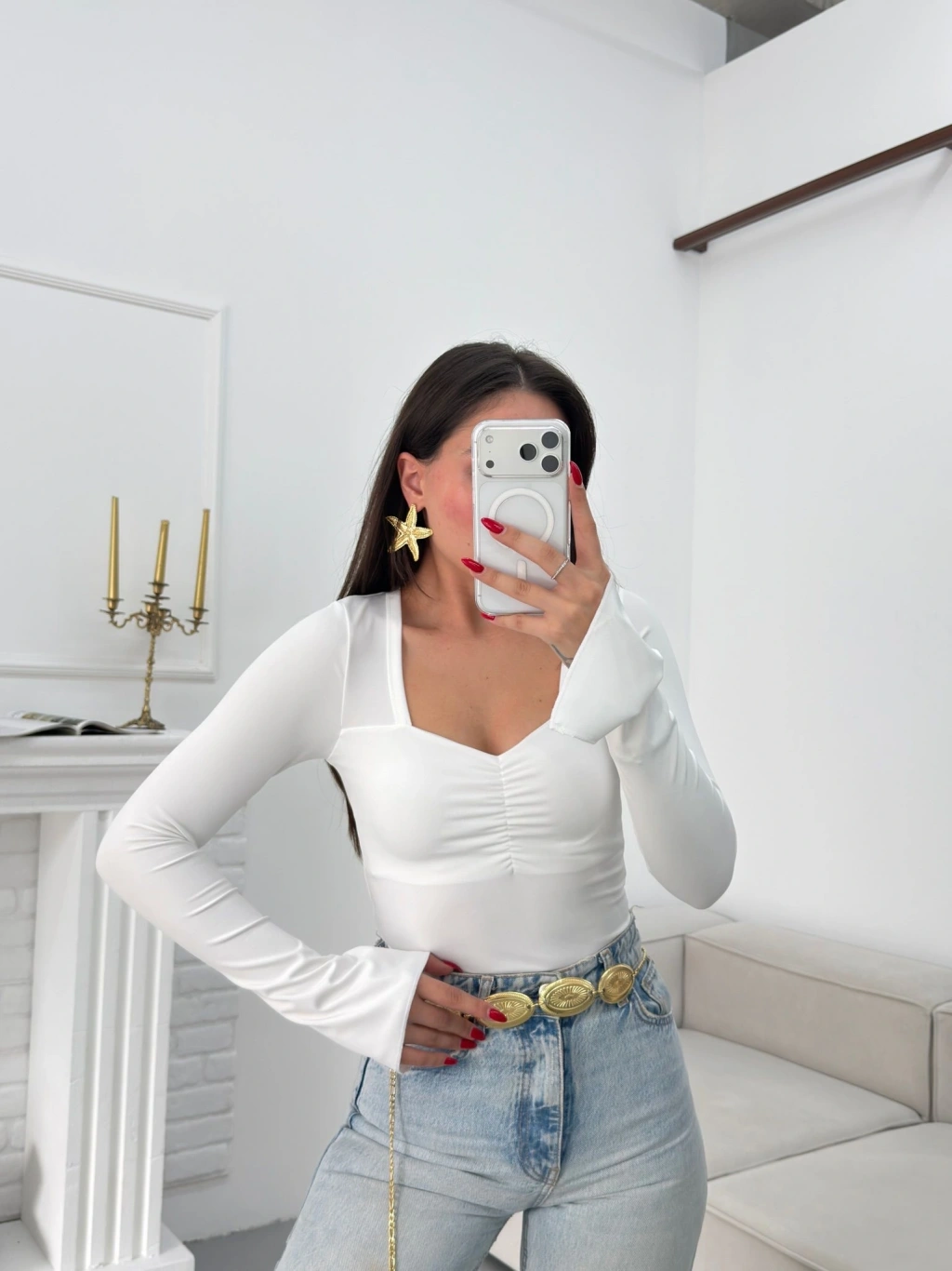 Kalp Yaka Kol İspanyol Crop - BEYAZ