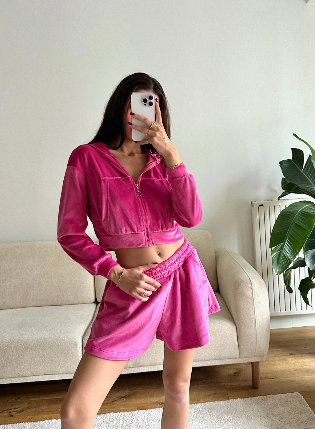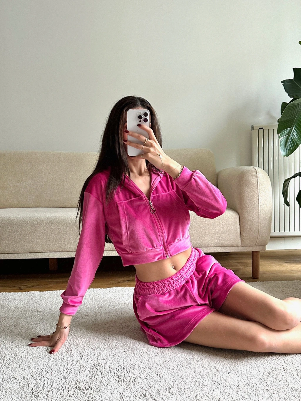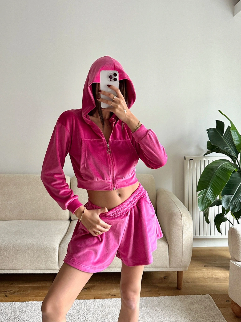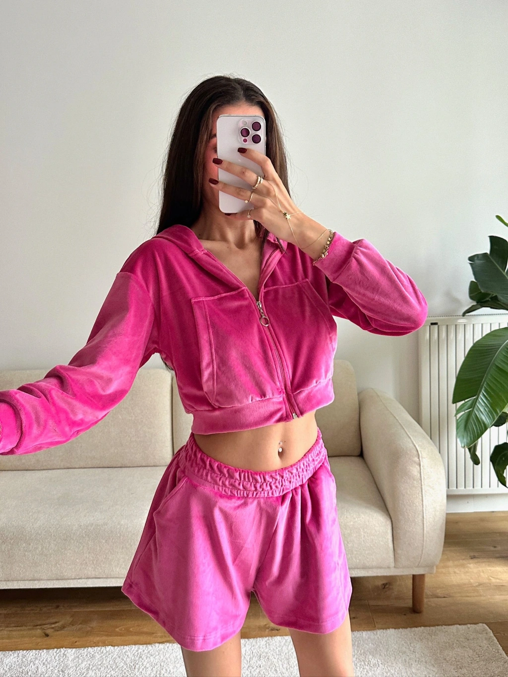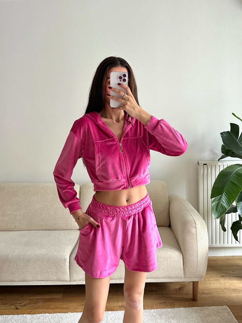 Kapüşonlu Crop & Şortlu Kadife Takım - FUŞYA