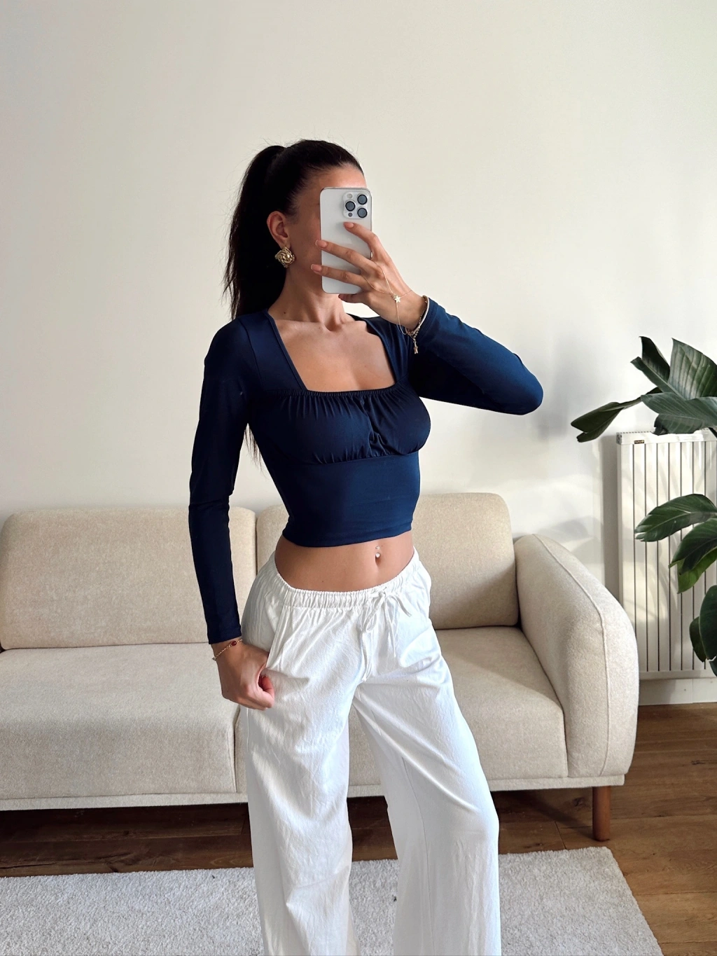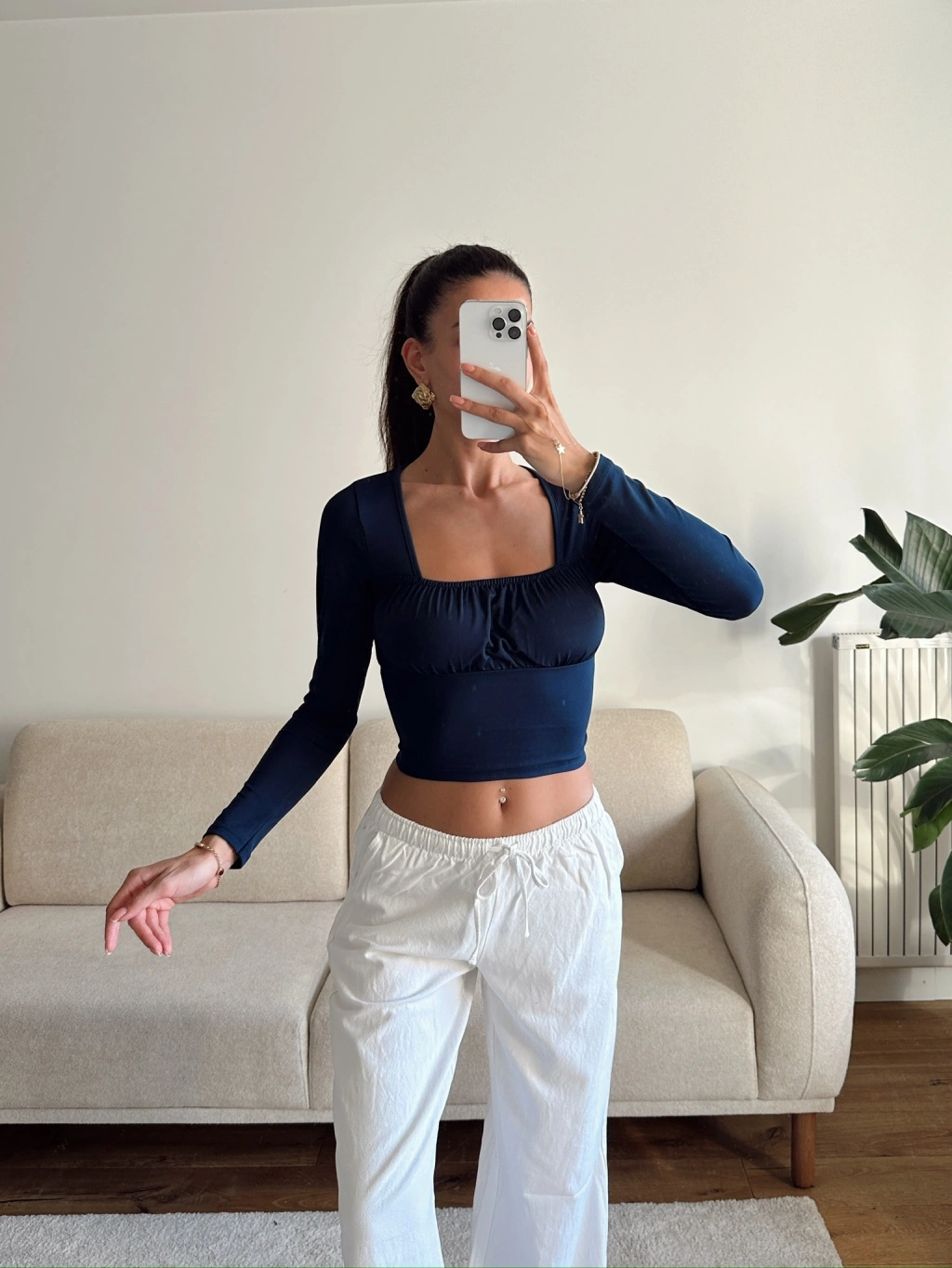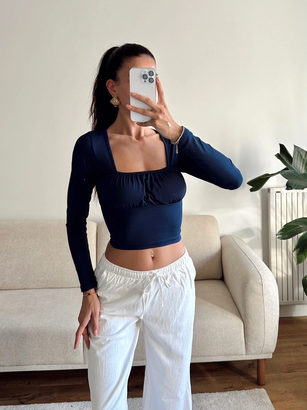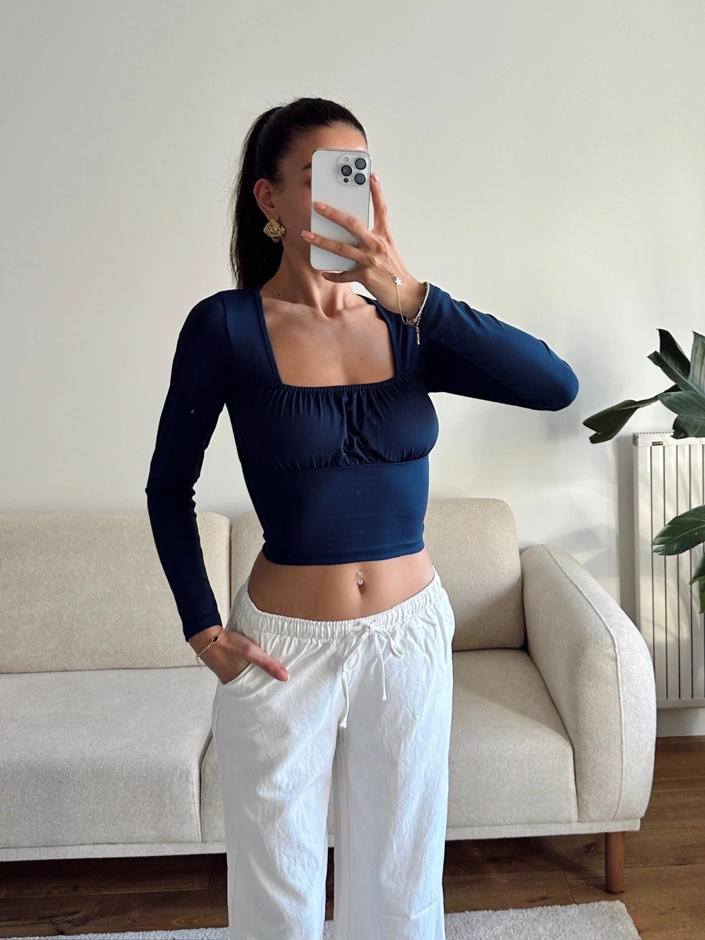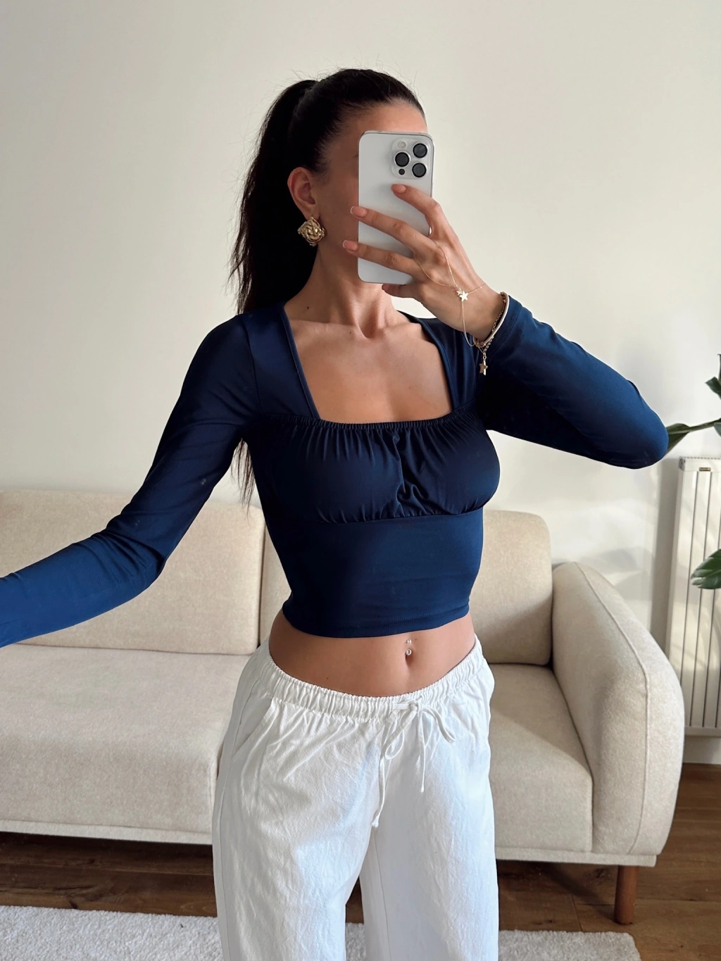 Kare Yaka Büzgü Detay Crop - LACİVERT