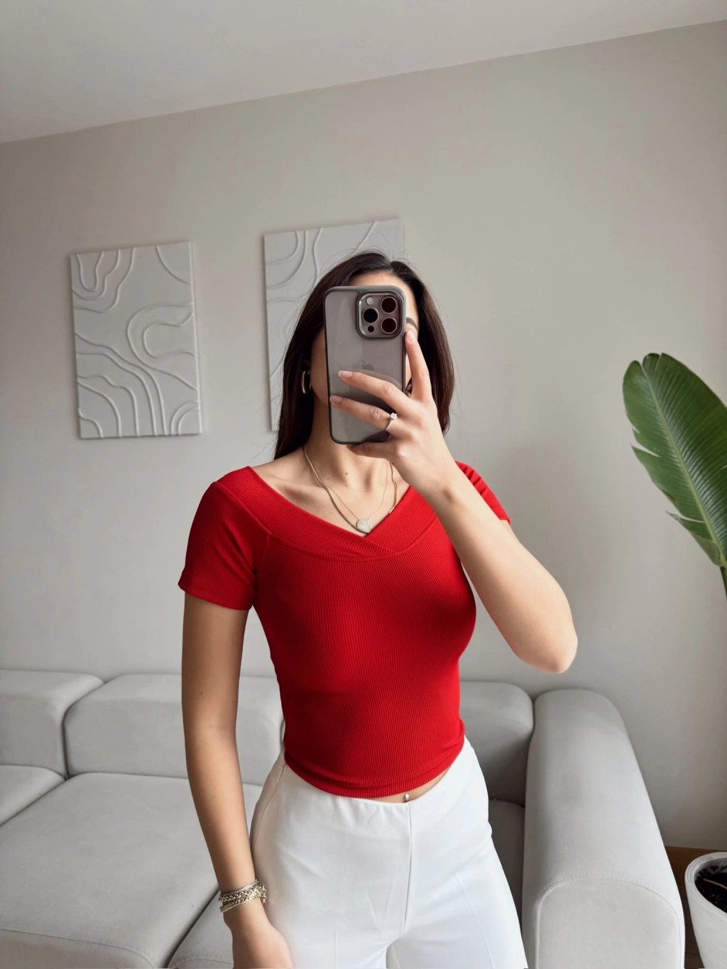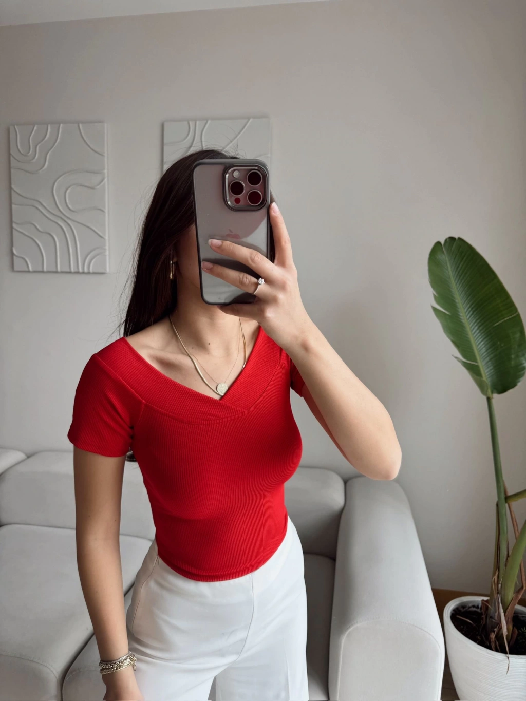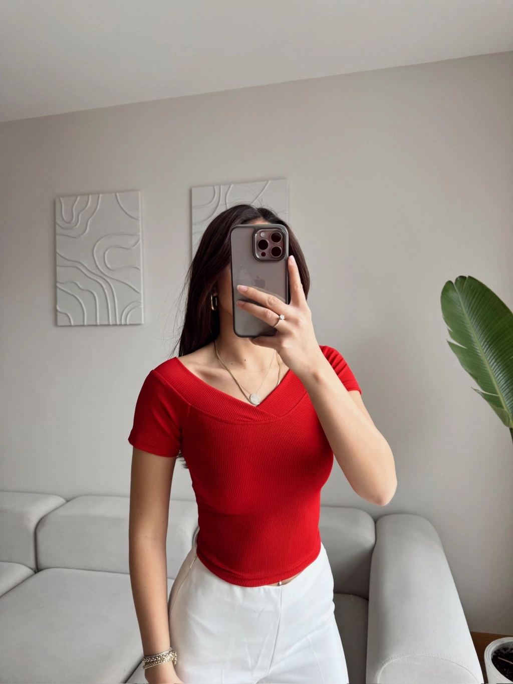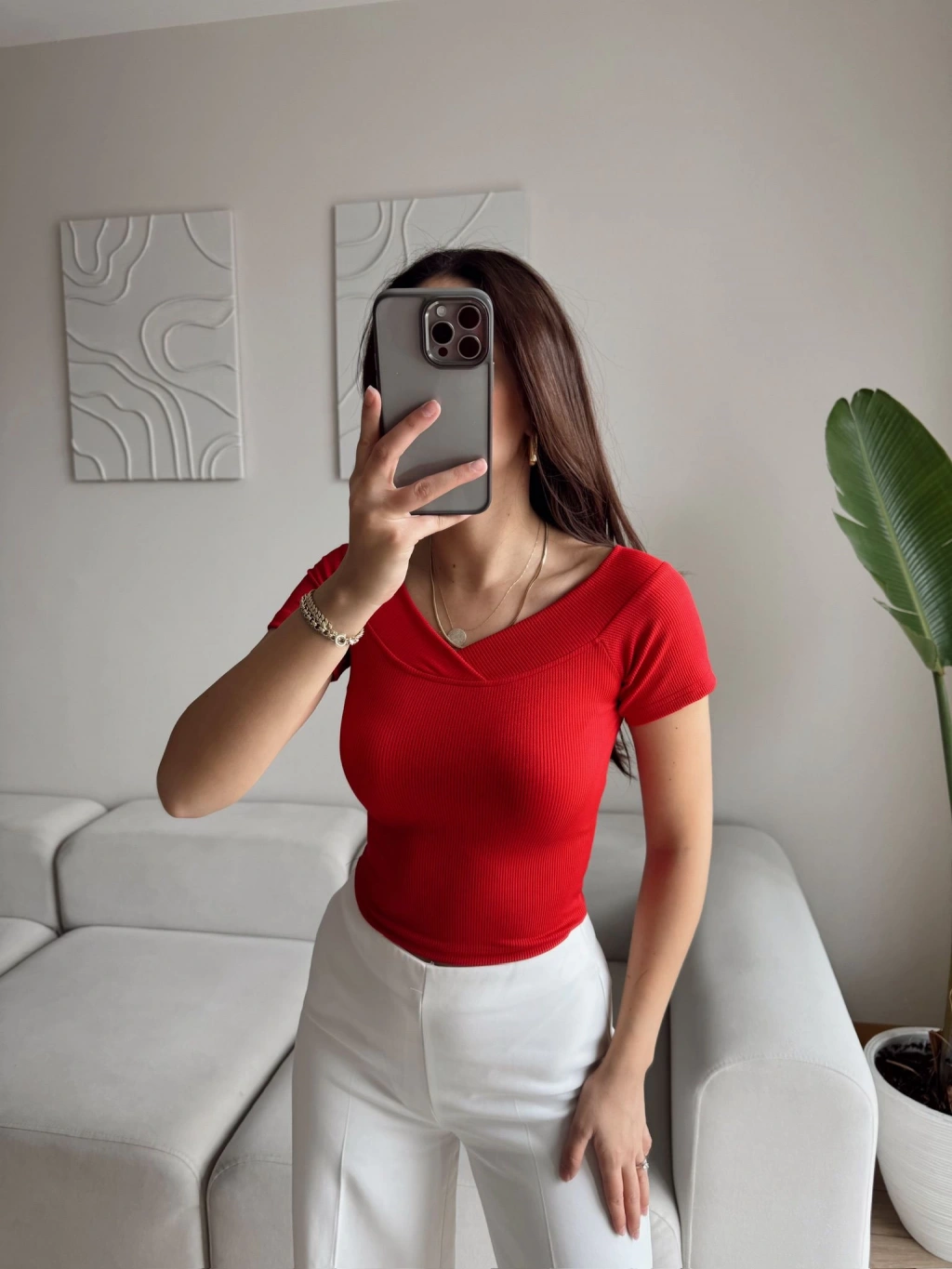 Kayık Yaka Çapraz Bluz - KIRMIZI